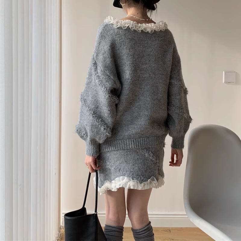 【set】ギャザーフリルニットトップス×ミニスカートセット Q7658