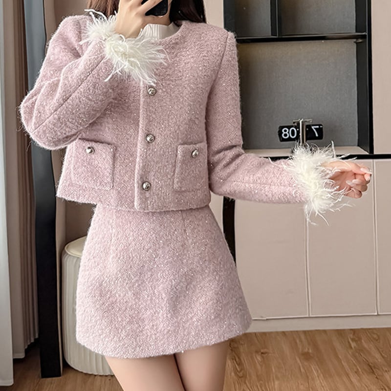 【set】袖ファーコート×ミニスカートセット Q7684