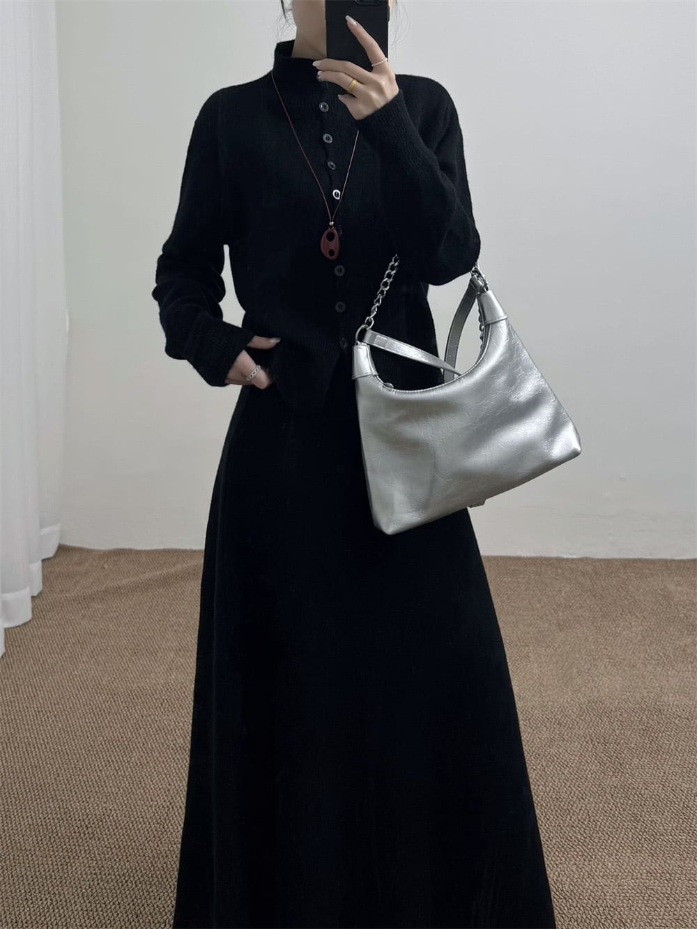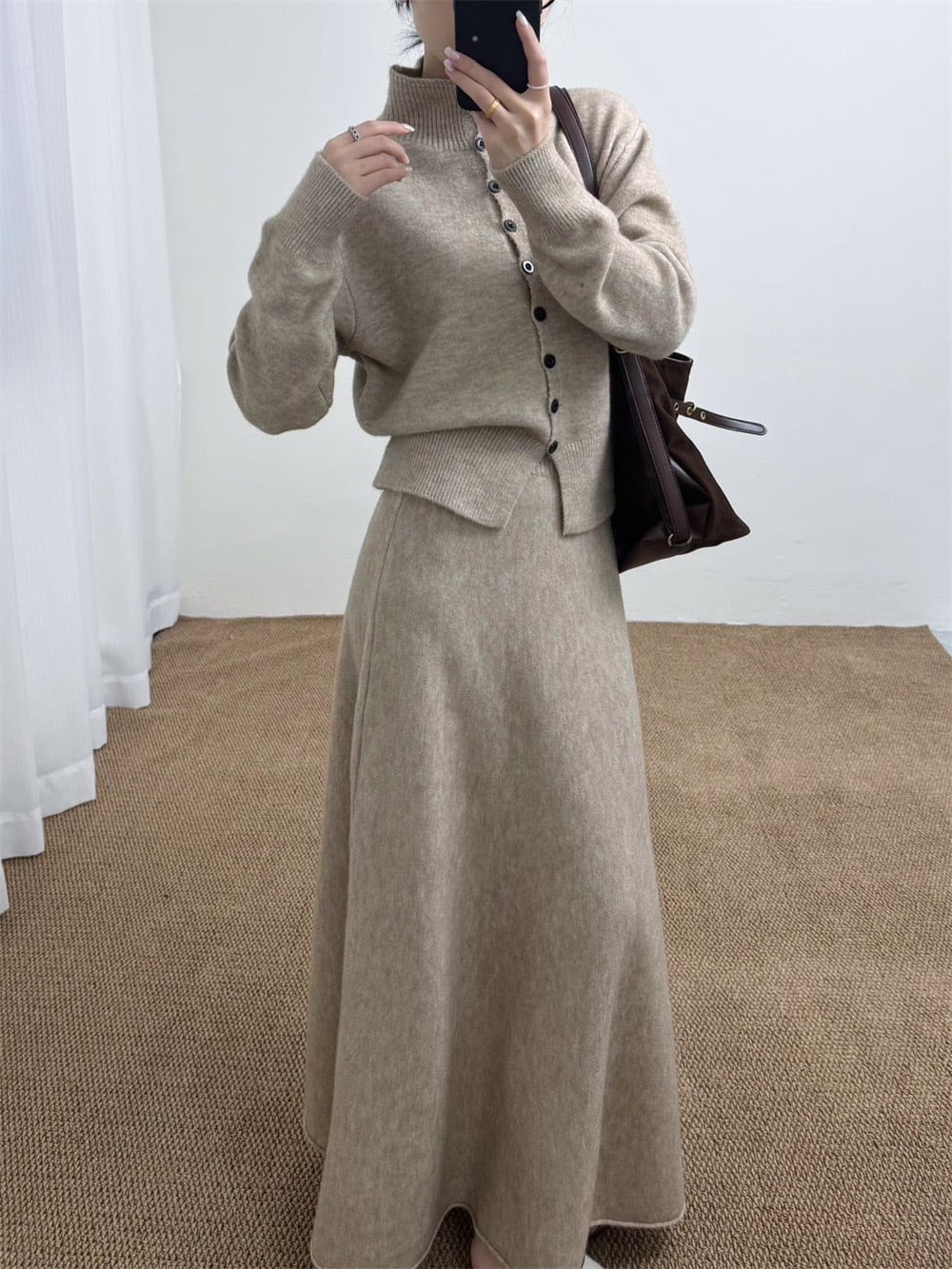 【set】スタントカラーニットカーディガン×ロングスカートセット Q7700