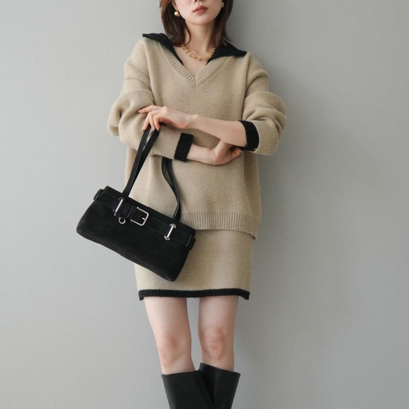【set】フェイクレイヤードニットトップス×ミニスカートセット Q7703