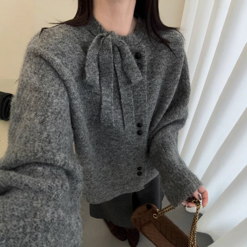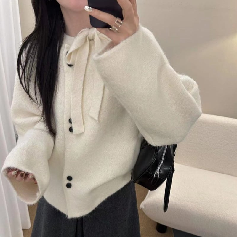 【outer】リボン付きニットカーディガン Q7707