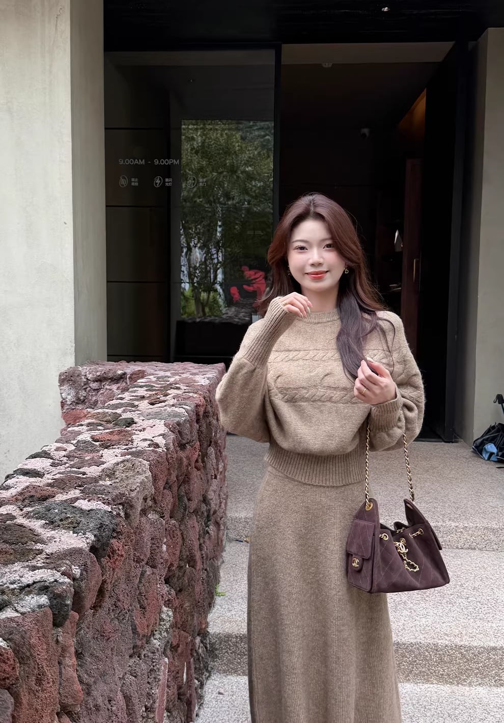 【set】ネックウォーマー×バットウィングスリーブニットトップス×ロングスカート3点セット Q7712