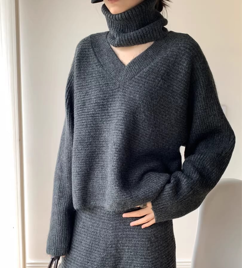 【set】ネックウォーマー×Vネックニットトップス×ロングスカート3点セット Q7723