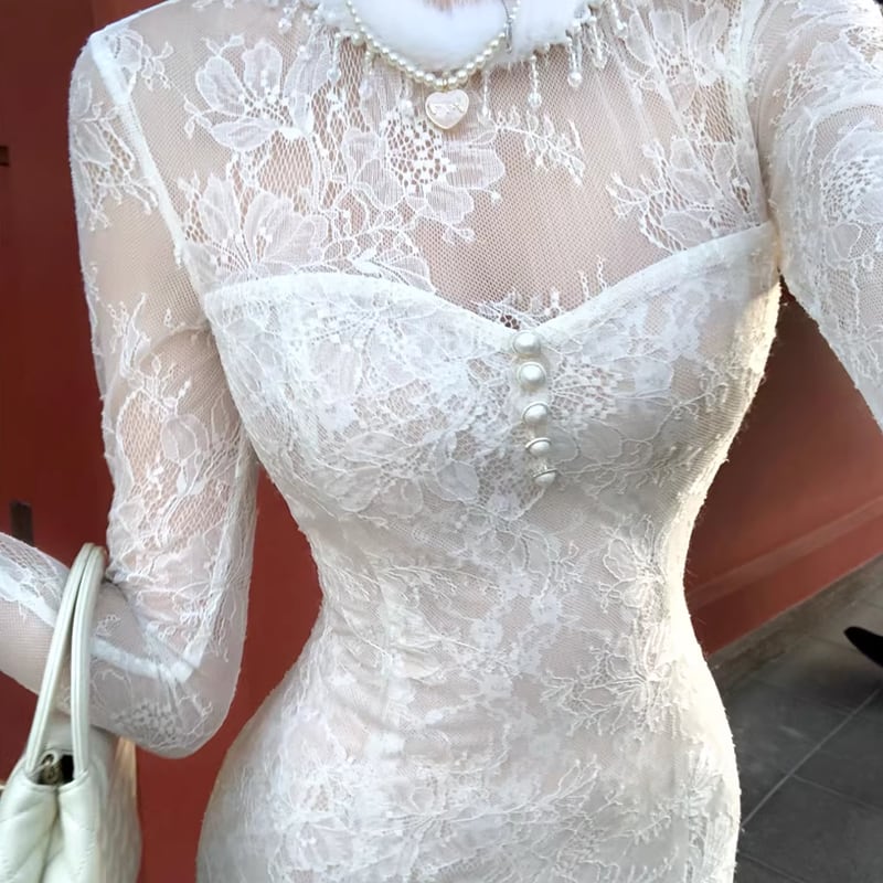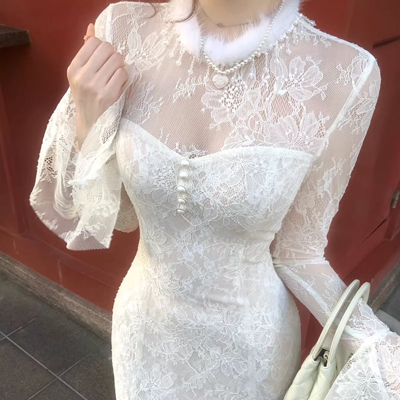 【dress】ネックファーロングレースマーメイドワンピース Q7725