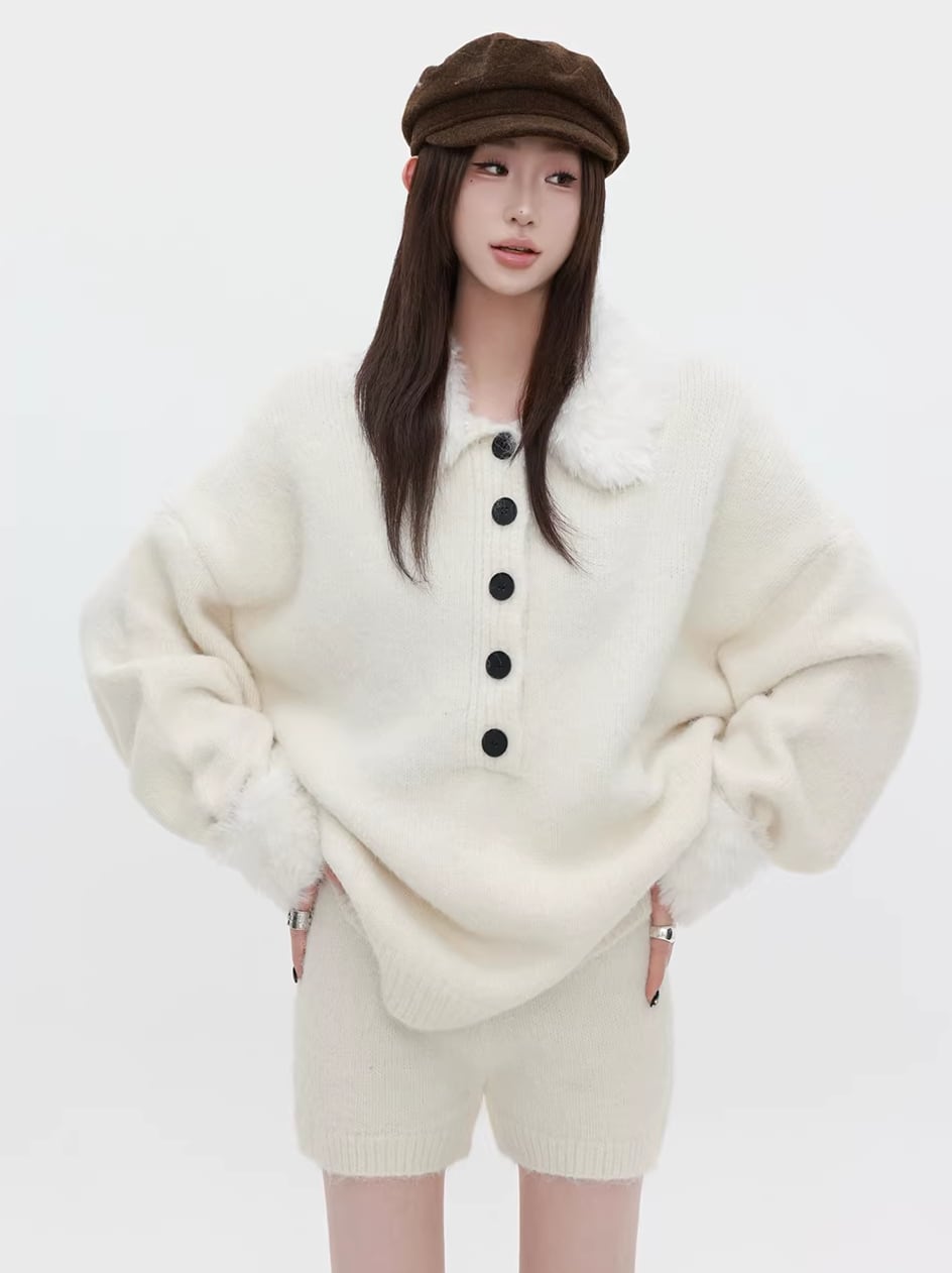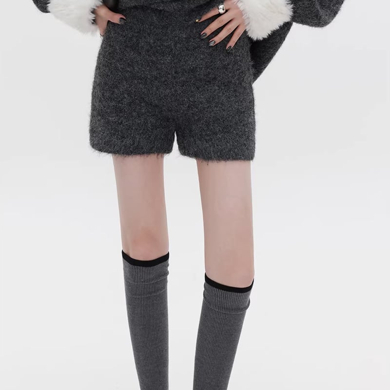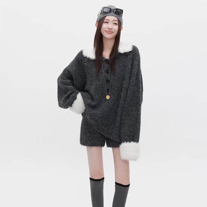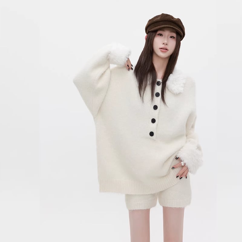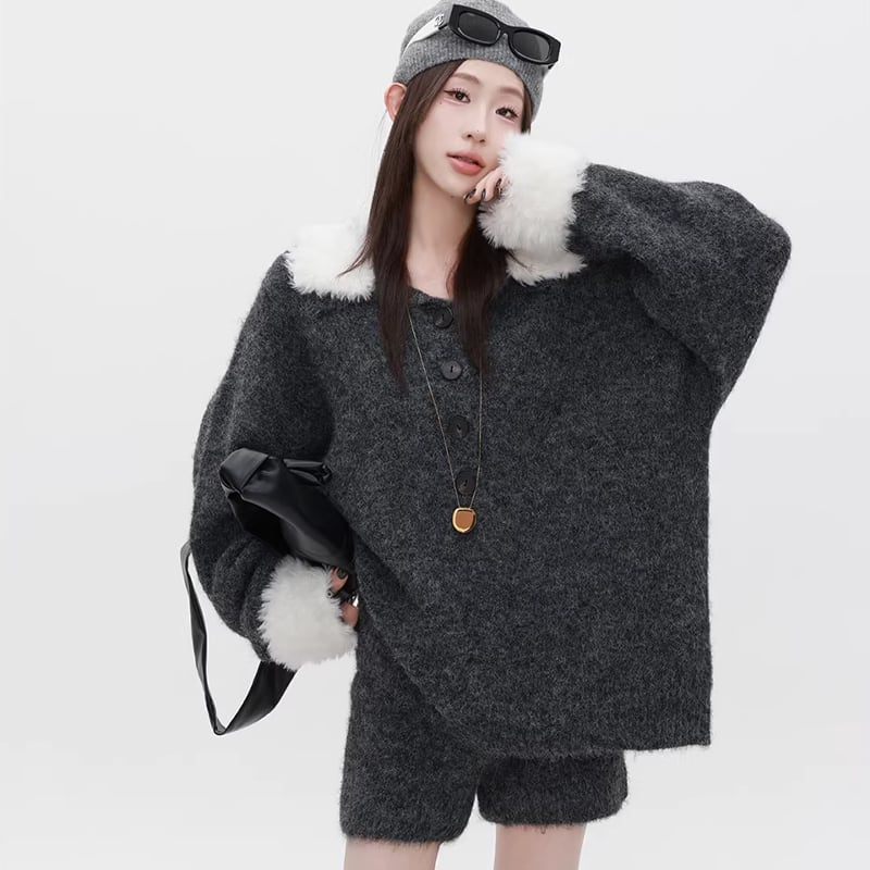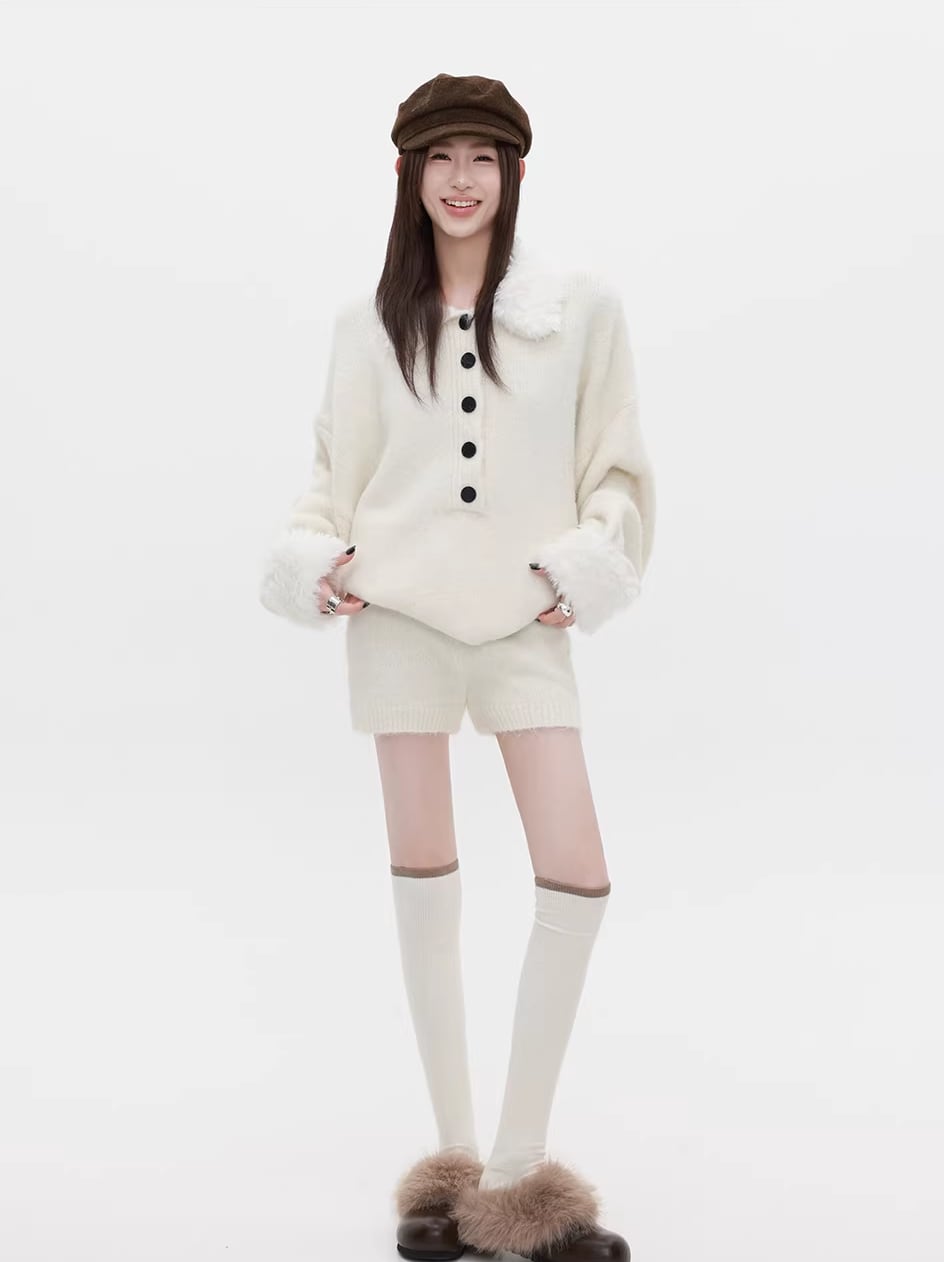 【set】ファー付きニットトップス×ショートパンツセット Q7772
