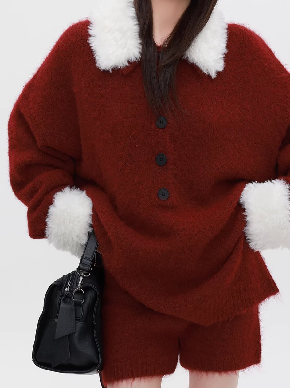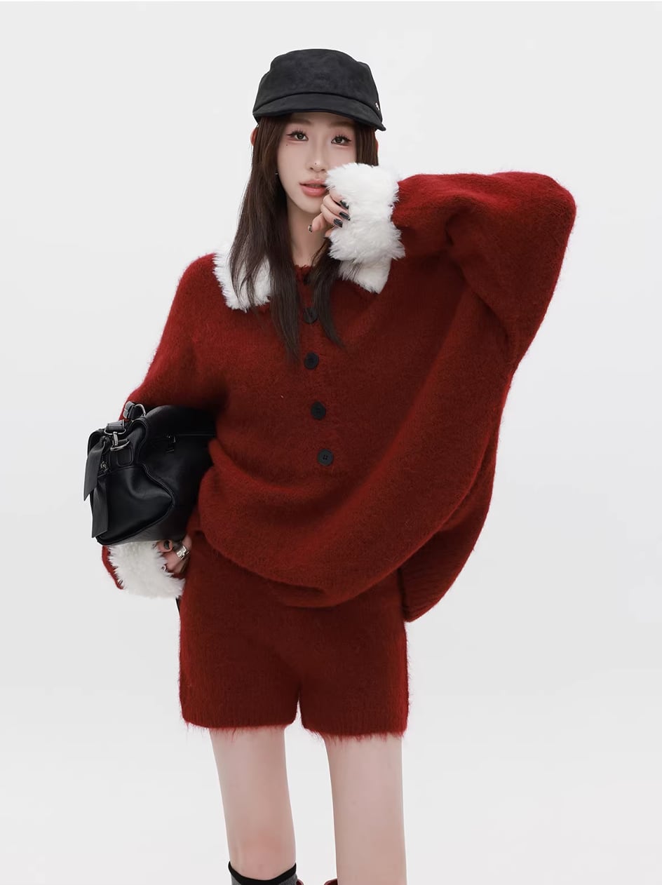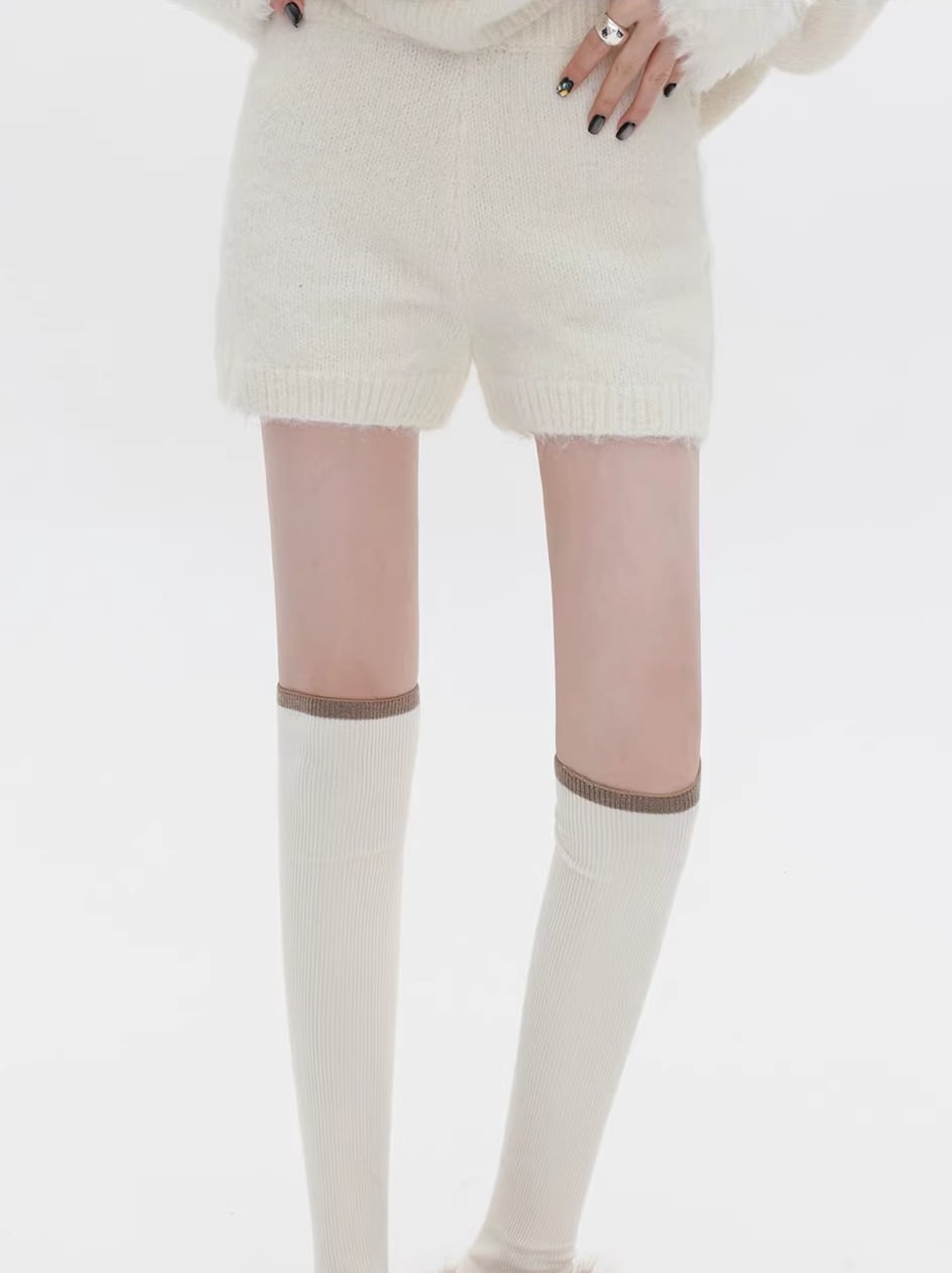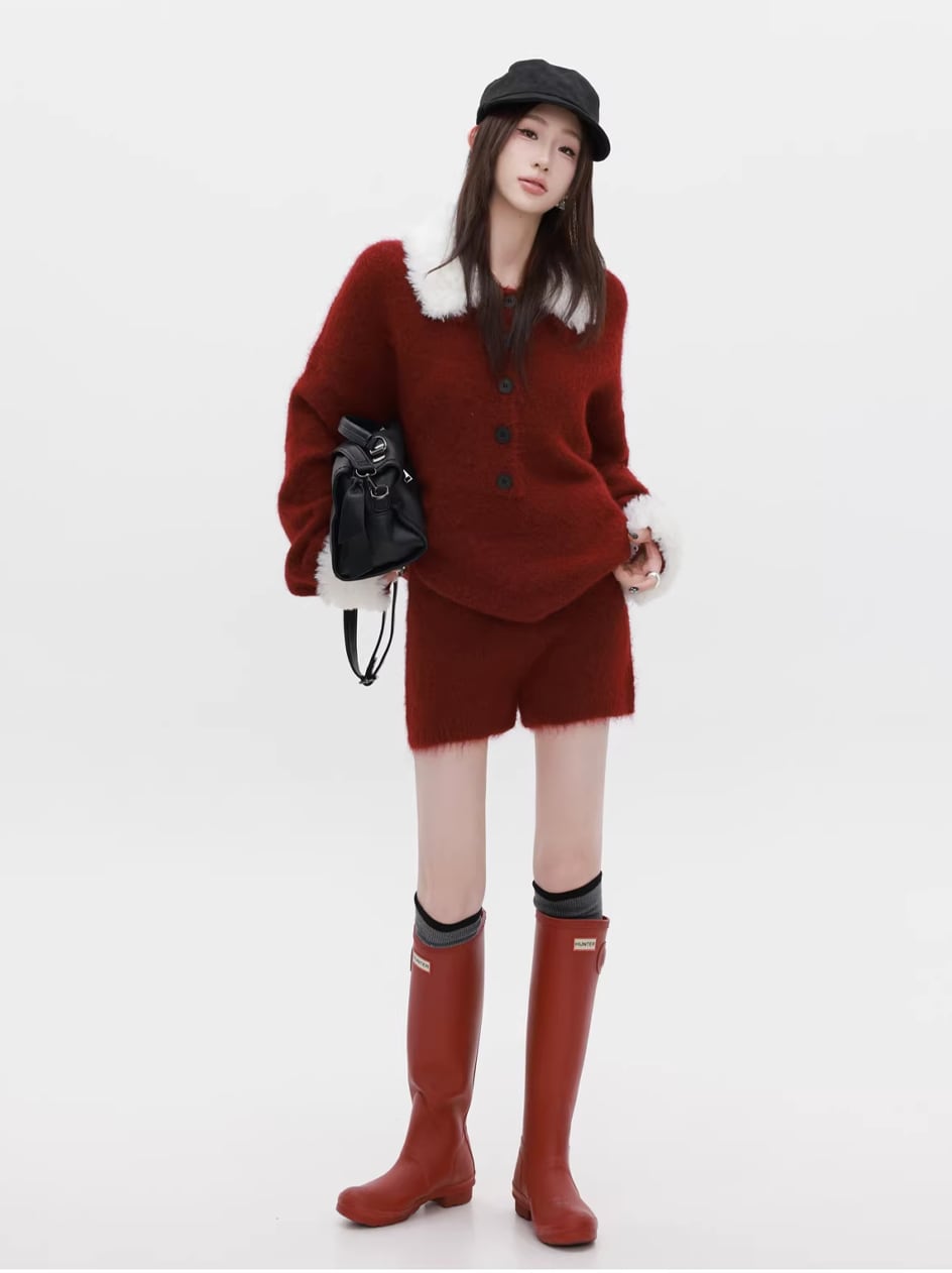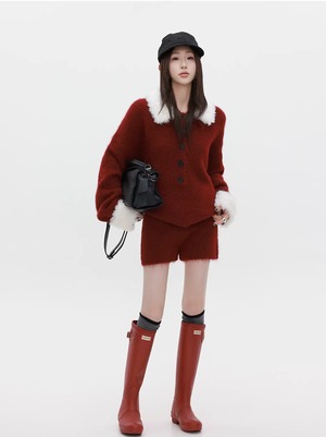 【set】ファー付きニットトップス×ショートパンツセット Q7772