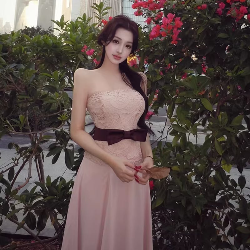 【set】ベルト付きレースチューブトップス×ロングスカートセット Q7822