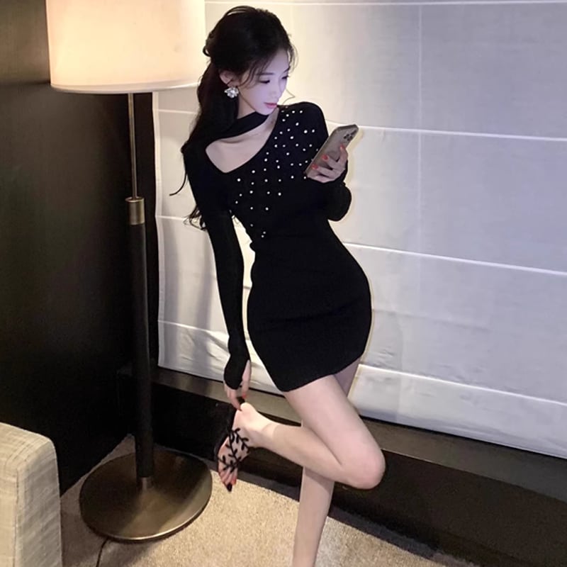 【dress】ラインストーン付きフロントカットニットワンピース Q7825
