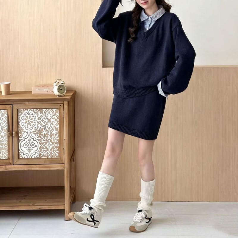 【set】フェイクレイヤードニットトップス×ストレートスカートセット Q7830