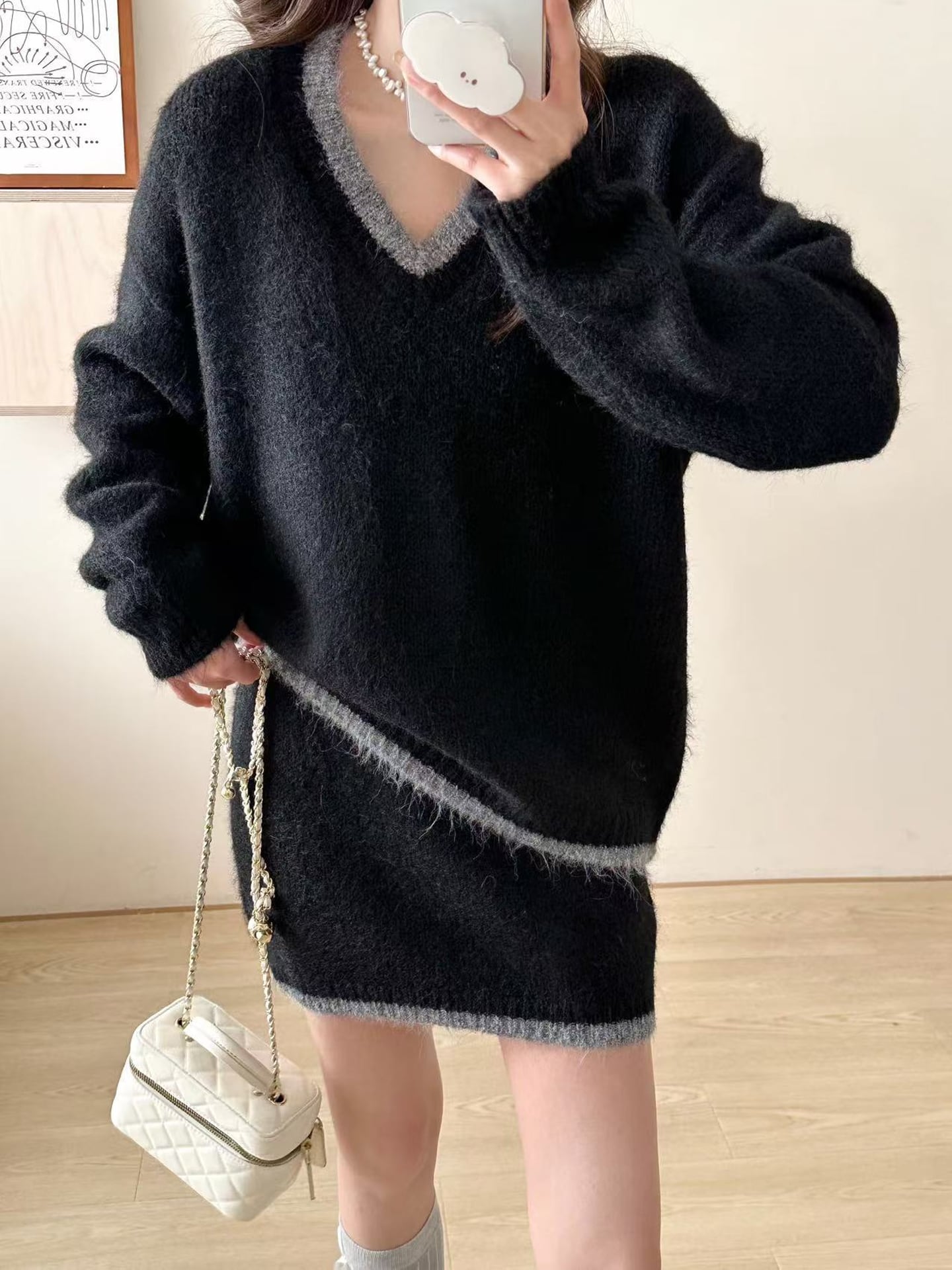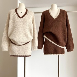 【set】Vネックニットトップス×ストレートスカートセット Q7836