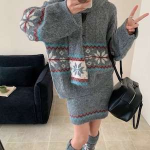 【set】マフラー×ジャカードニットトップス×ミニスカート3点セット Q7861