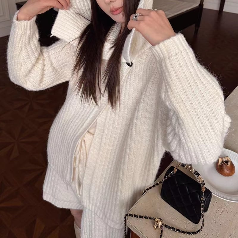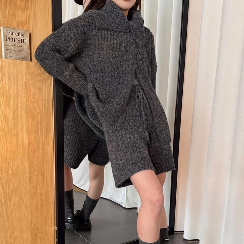 【set】折り襟ニットトップス×ショートパンツセット Q7882