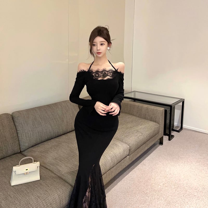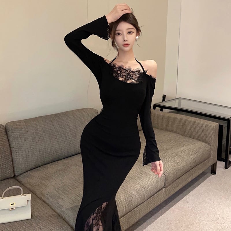 【dress】ホルターネックレースドッキングワンピース Q7884