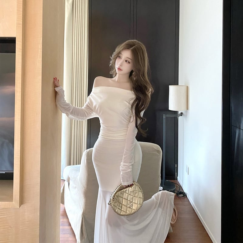 【dress】オフショルダーチュールドッキングワンピース Q7885