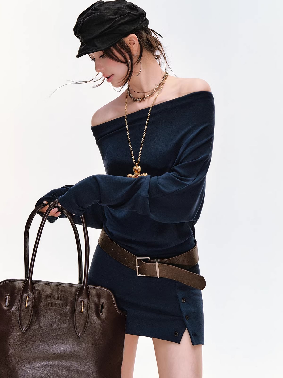 【dress】ベルト付きオフショルダーニットワンピース Q7888