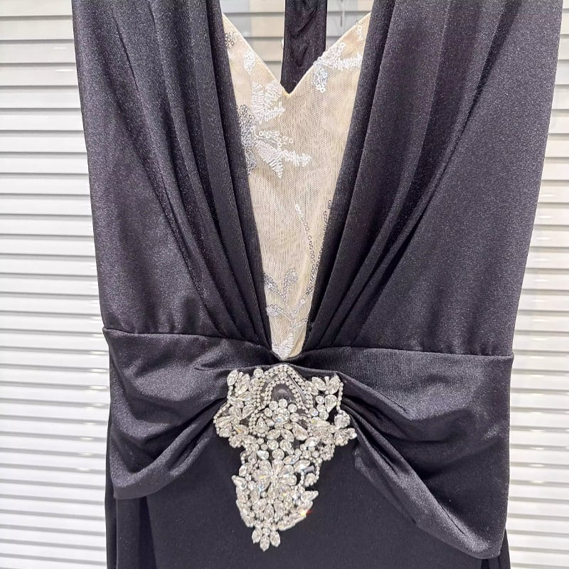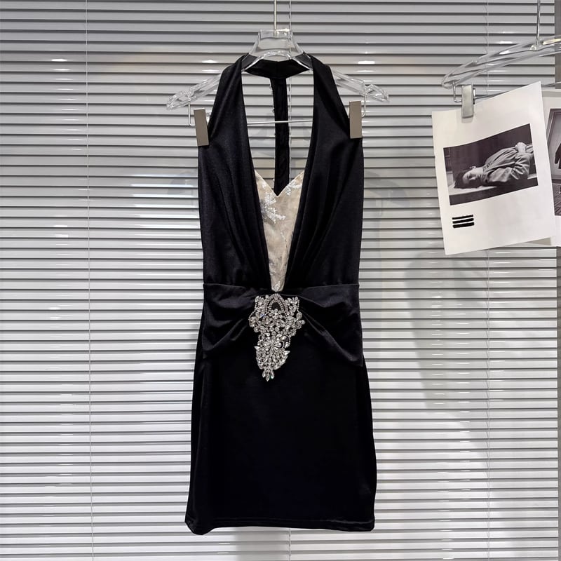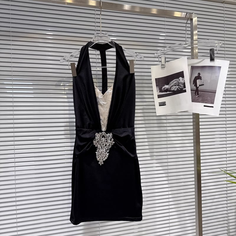 【dress】ラインストーン付きノースリーブホルターネックワンピース Q7894