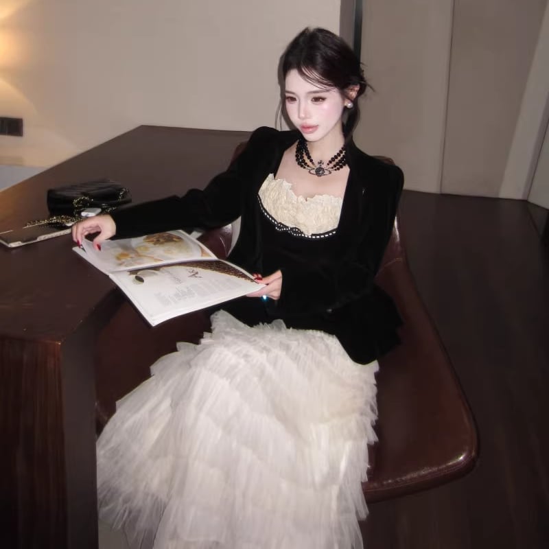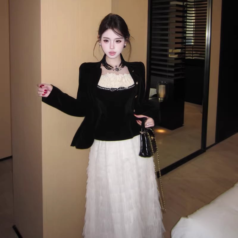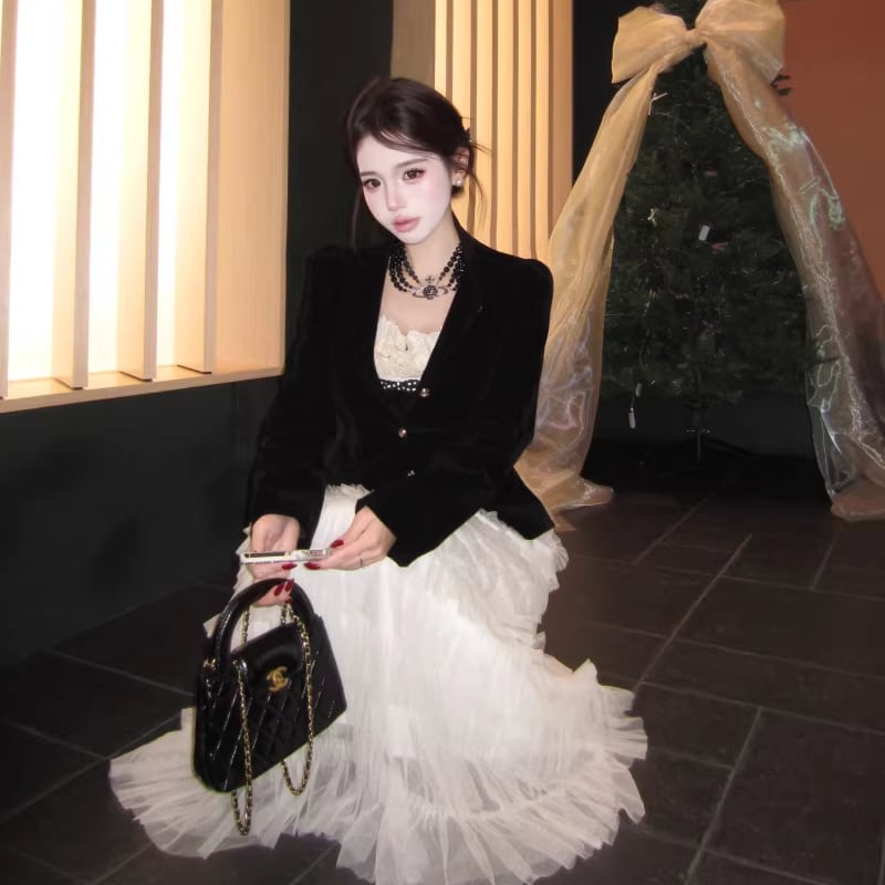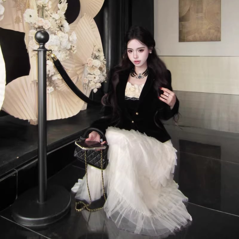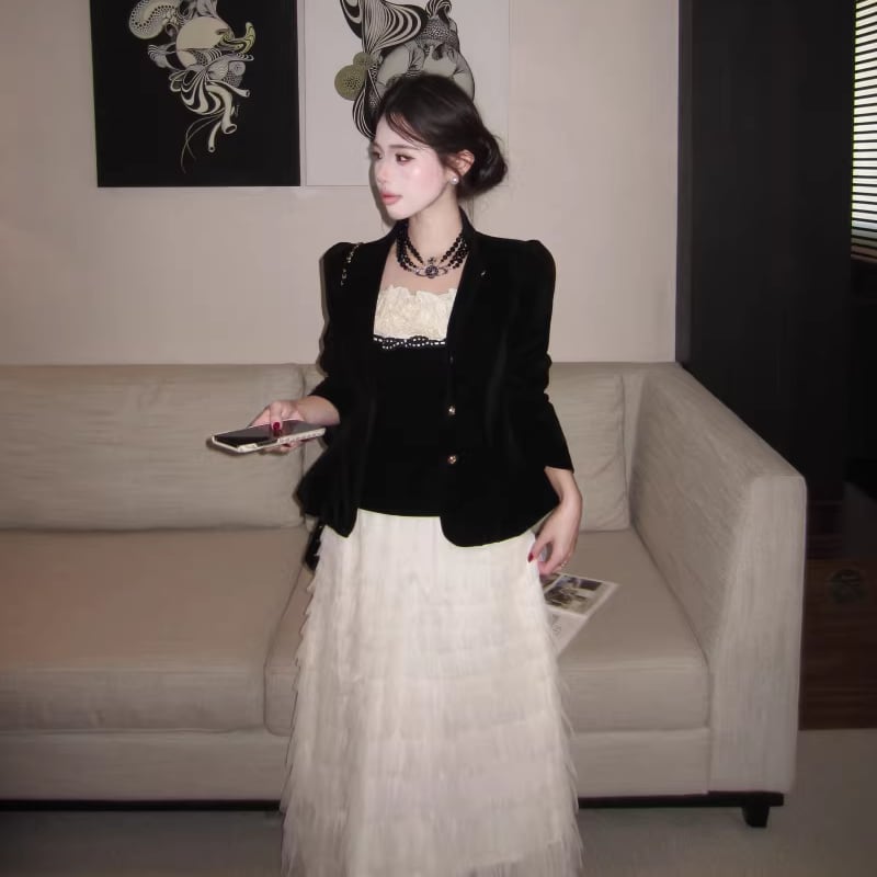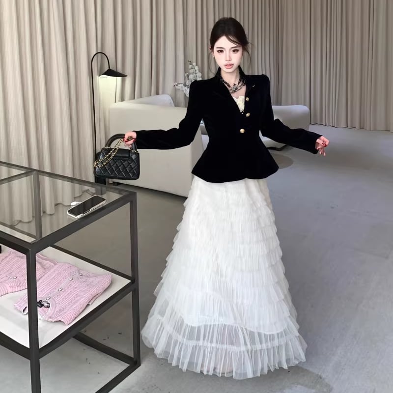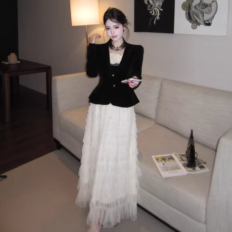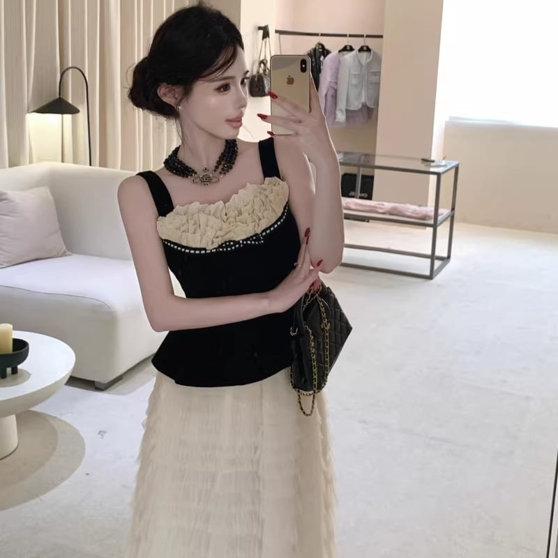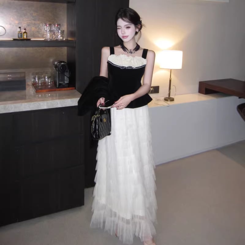【set】ベルベットギャザーキャミソール×チュールティアードスカートセット Q7902