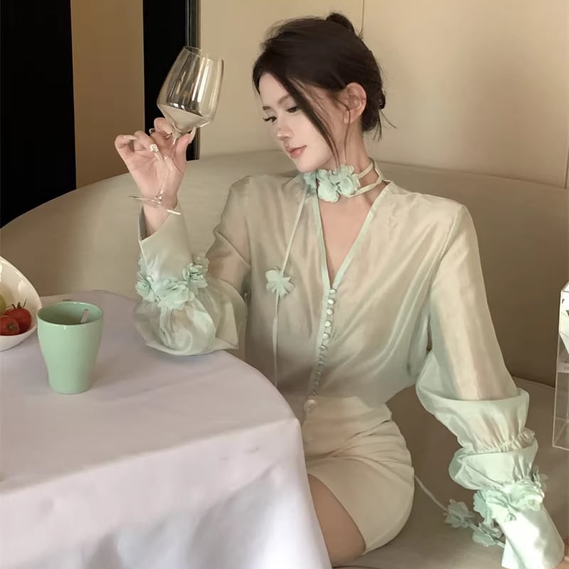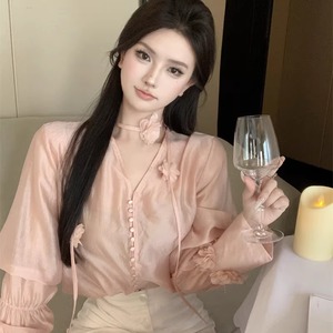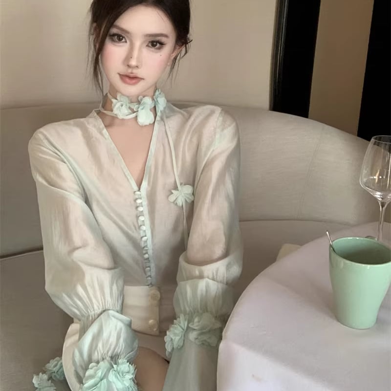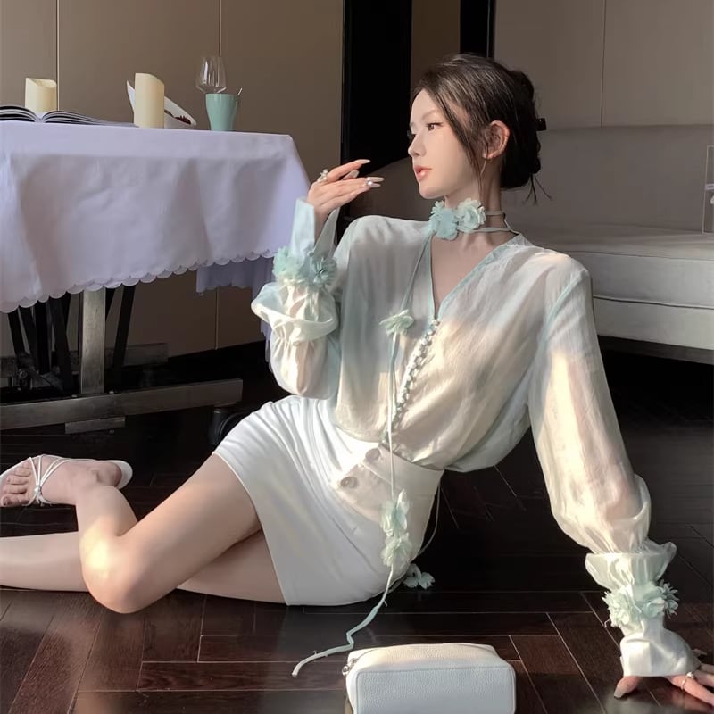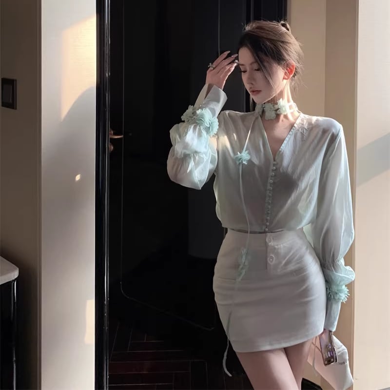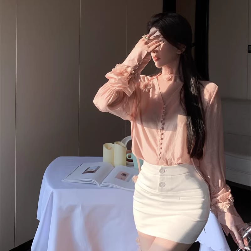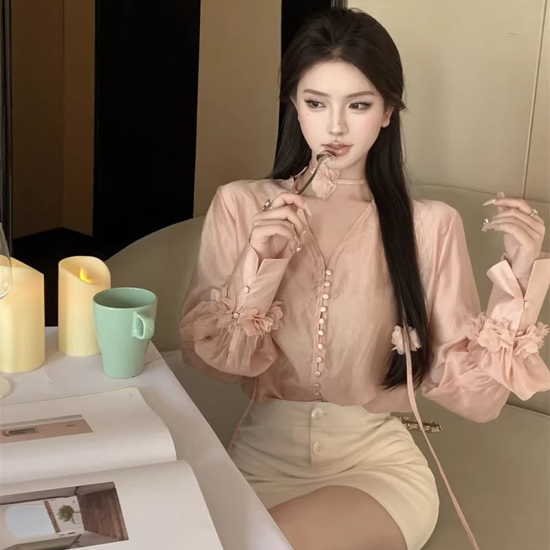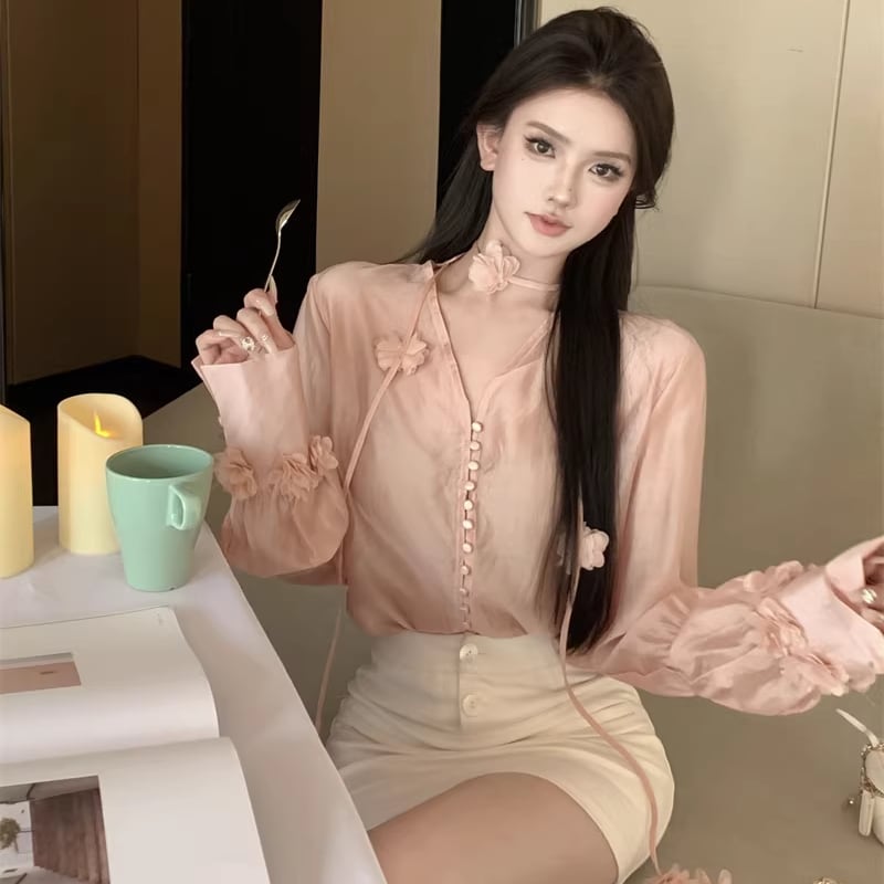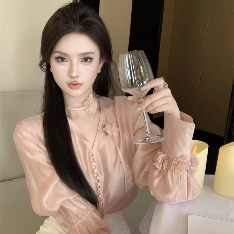 【tops】Vネックフラワー付きシャツ Q7932