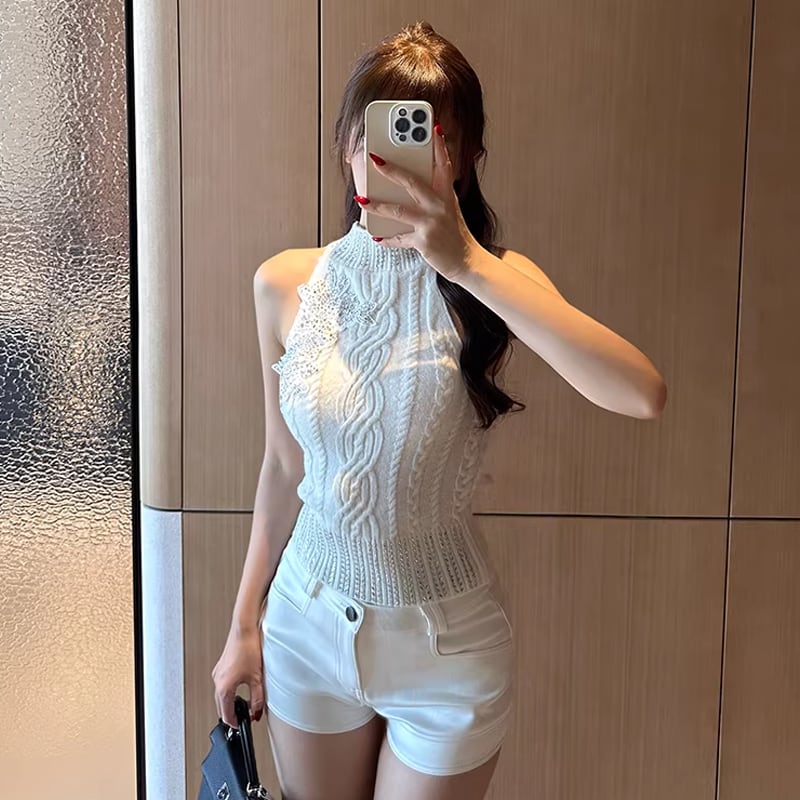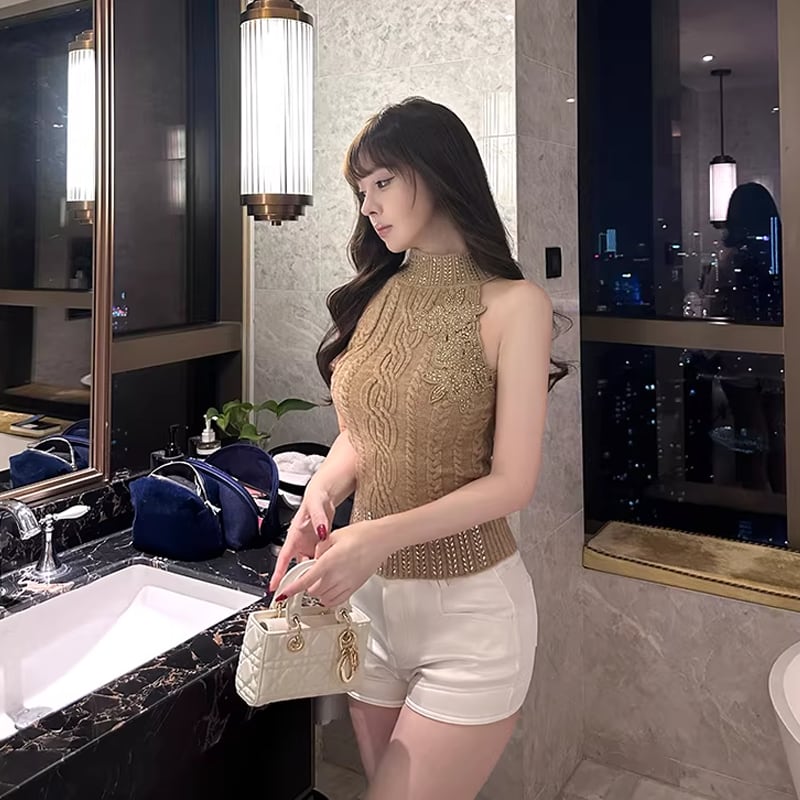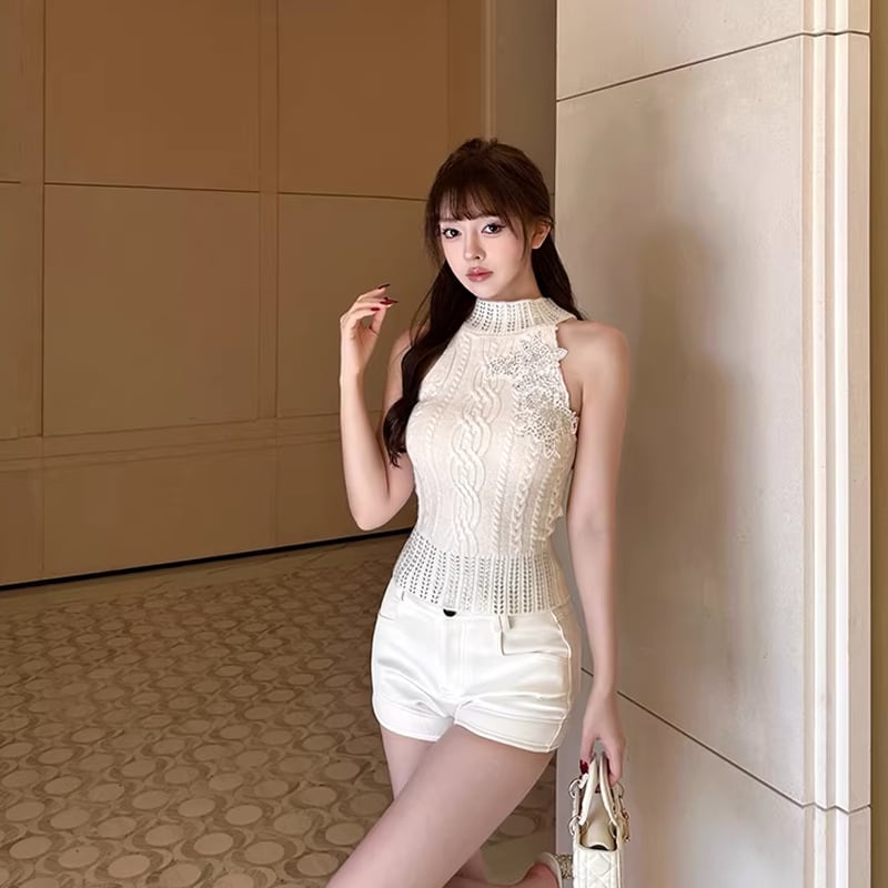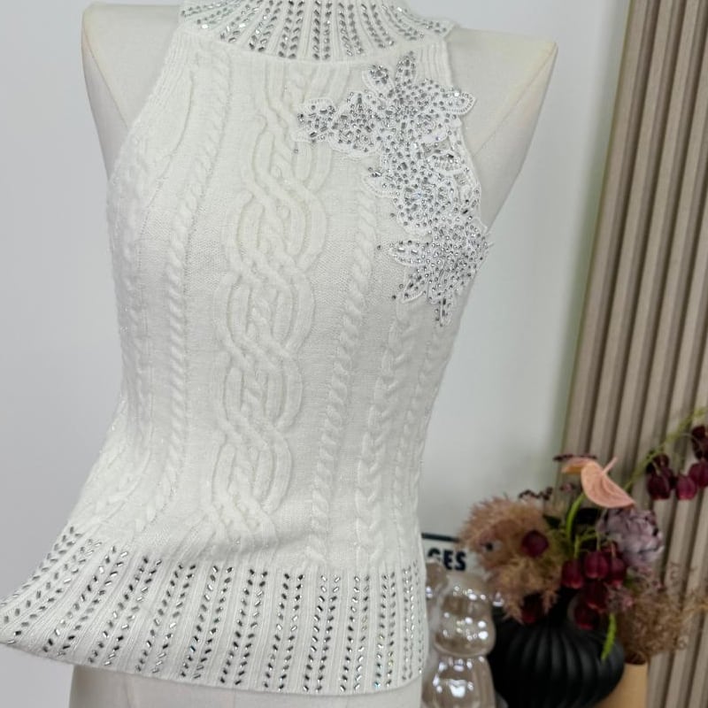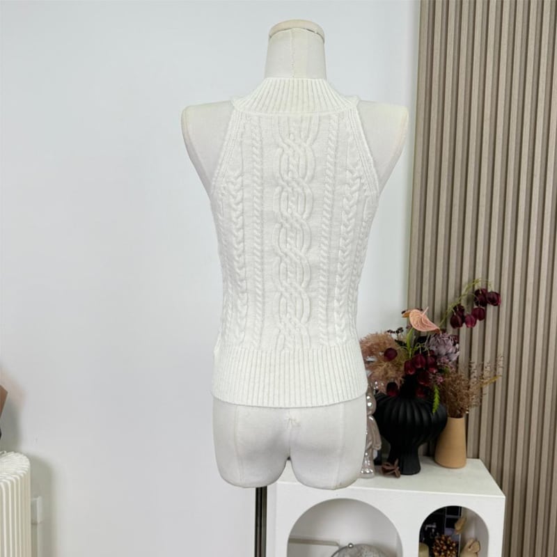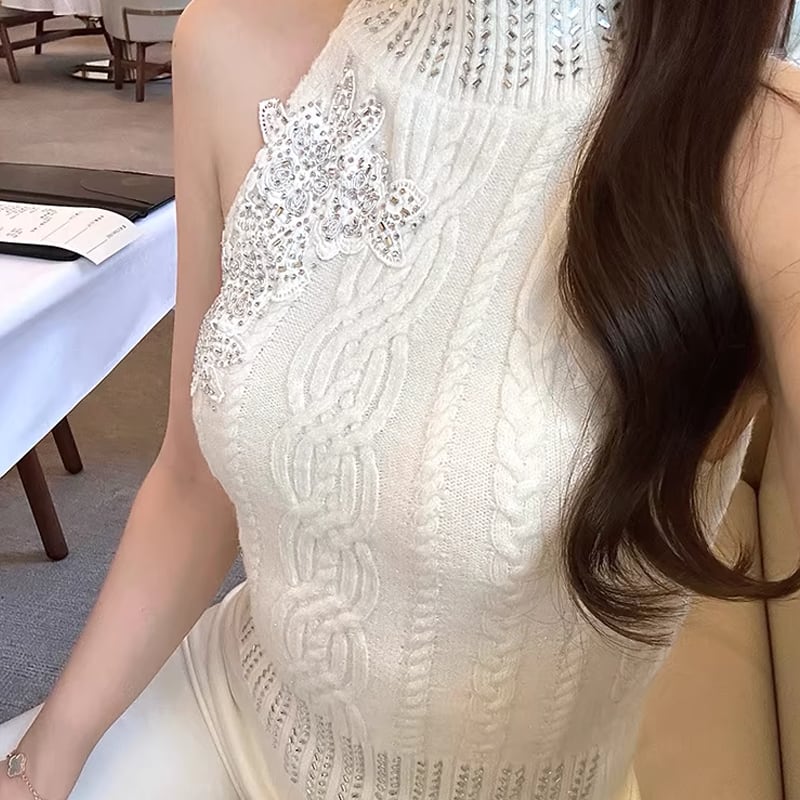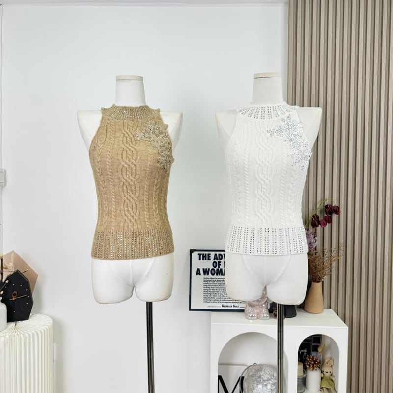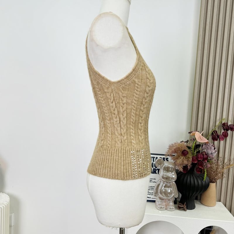 【tops】ラインストーン付きノースリーブニットトップス Q7946