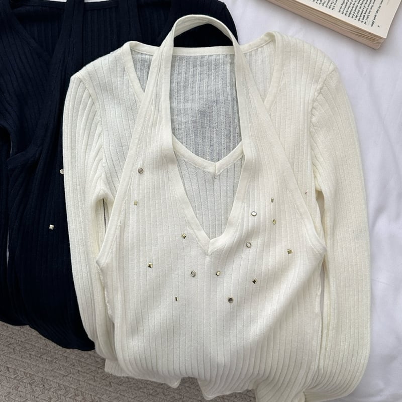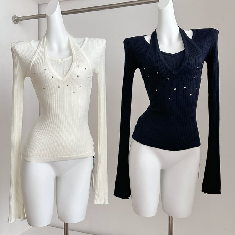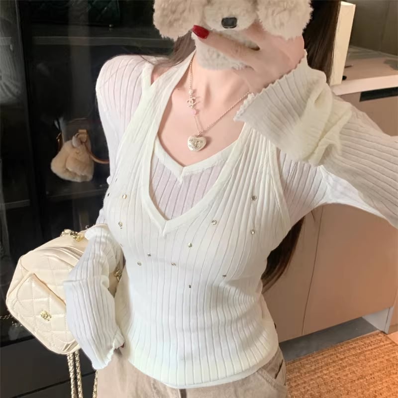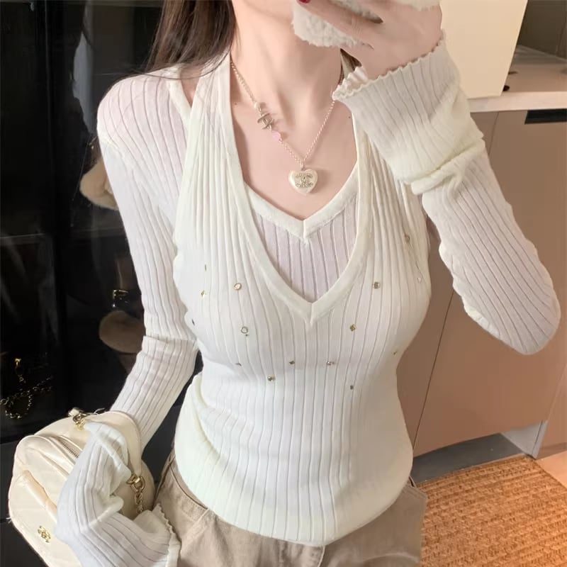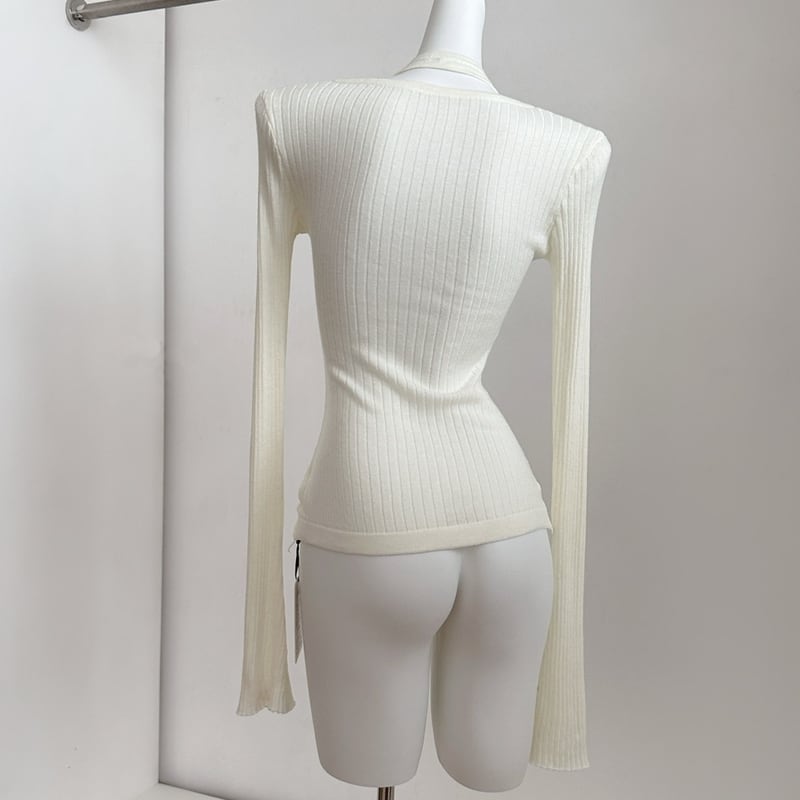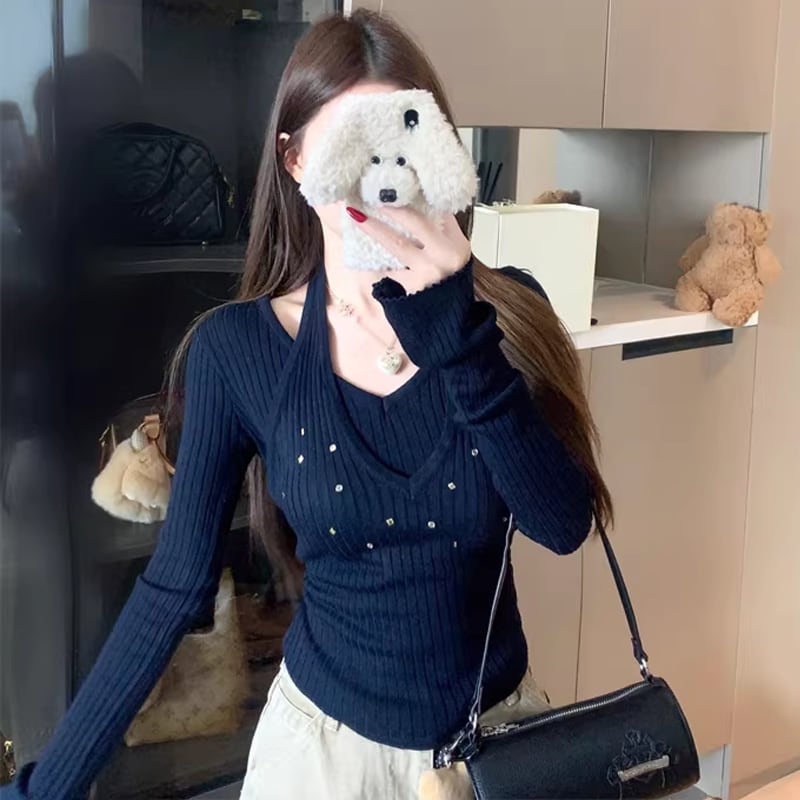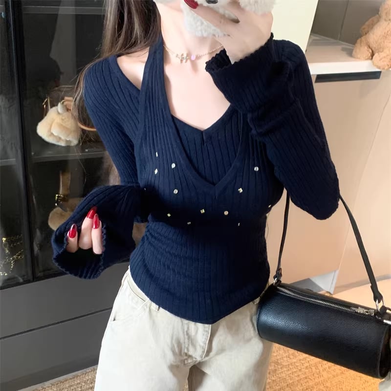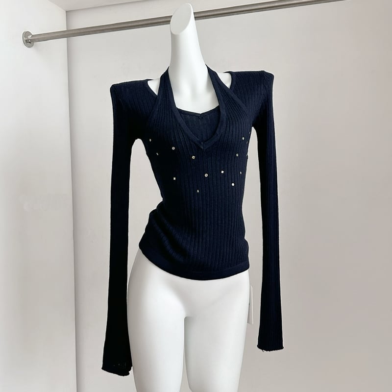 【tops】フェイクレイヤードニットトップス Q7960
