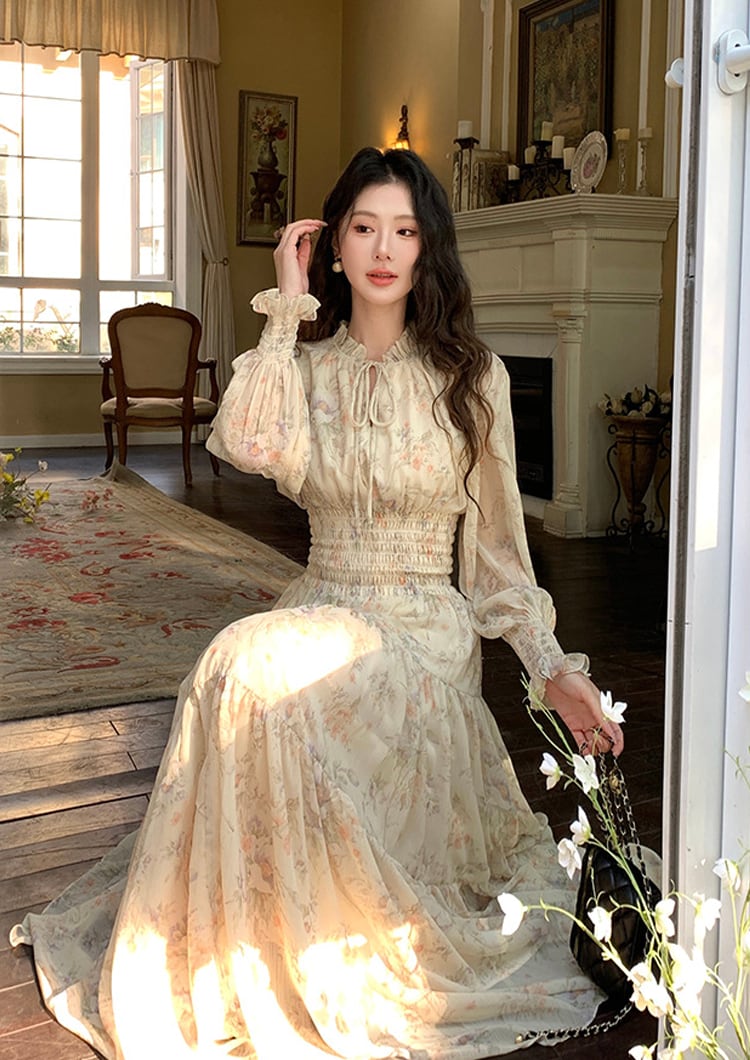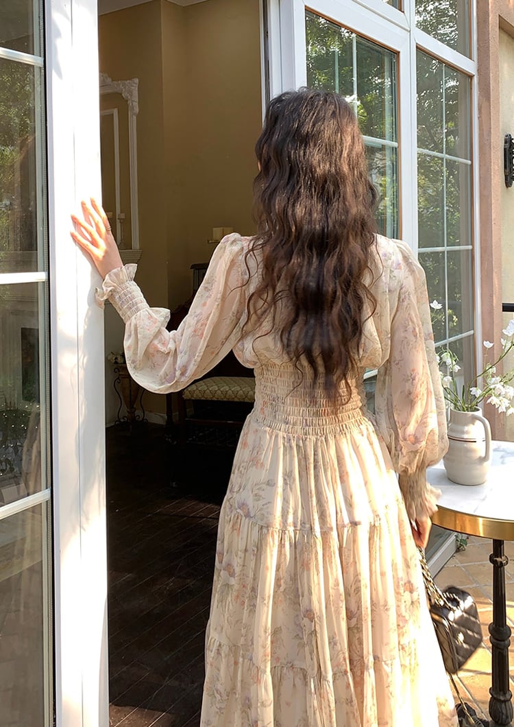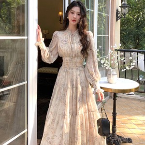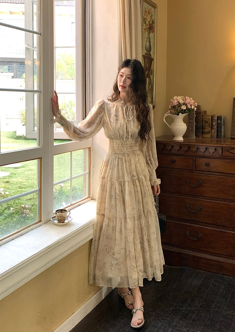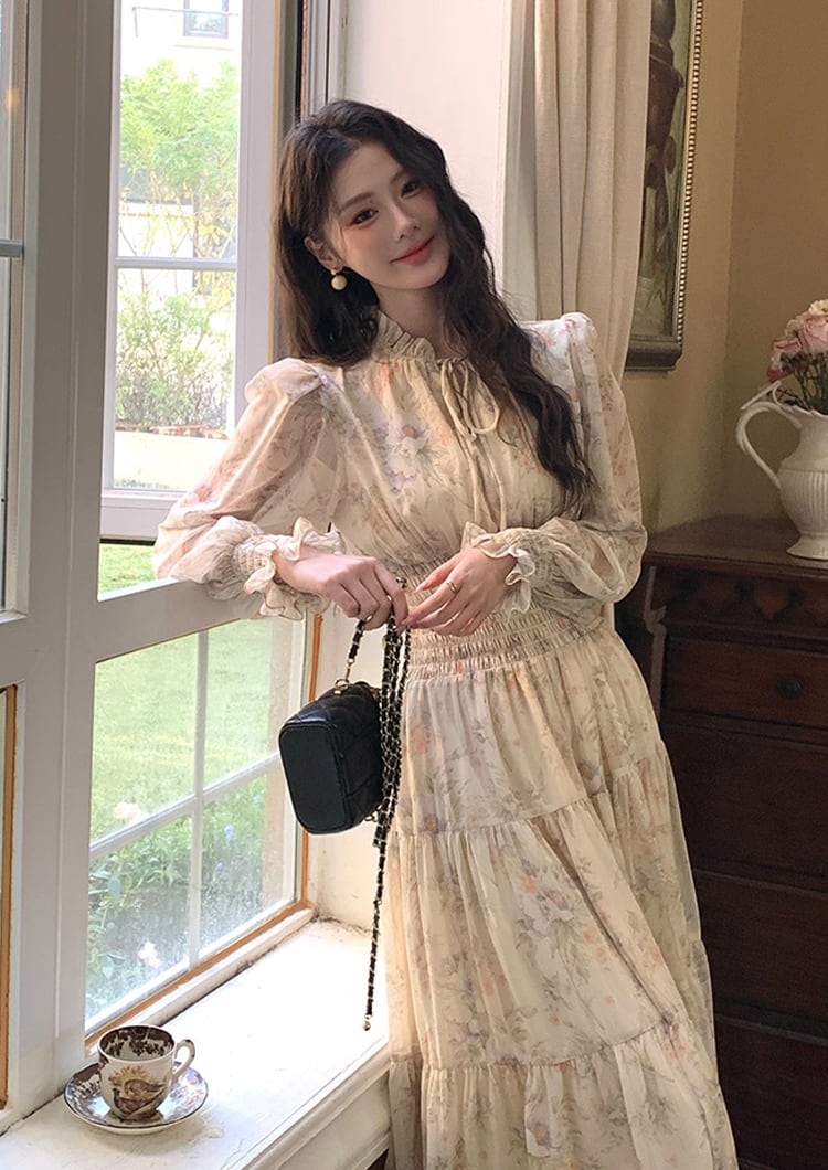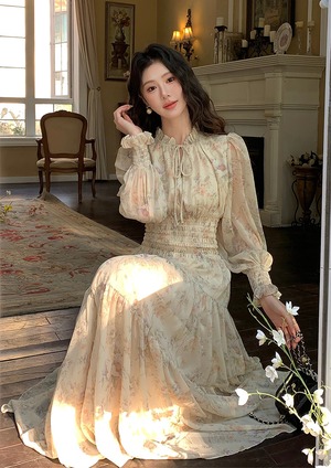 【dress】フラワー柄シフォンAラインロングワンピース Q7978