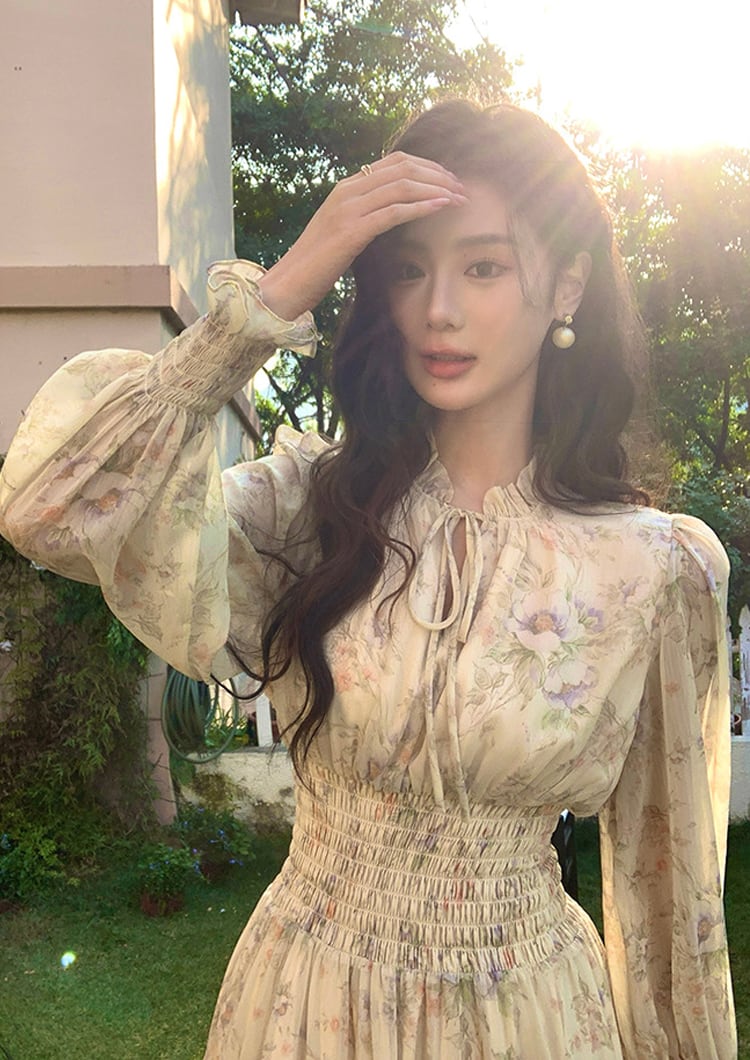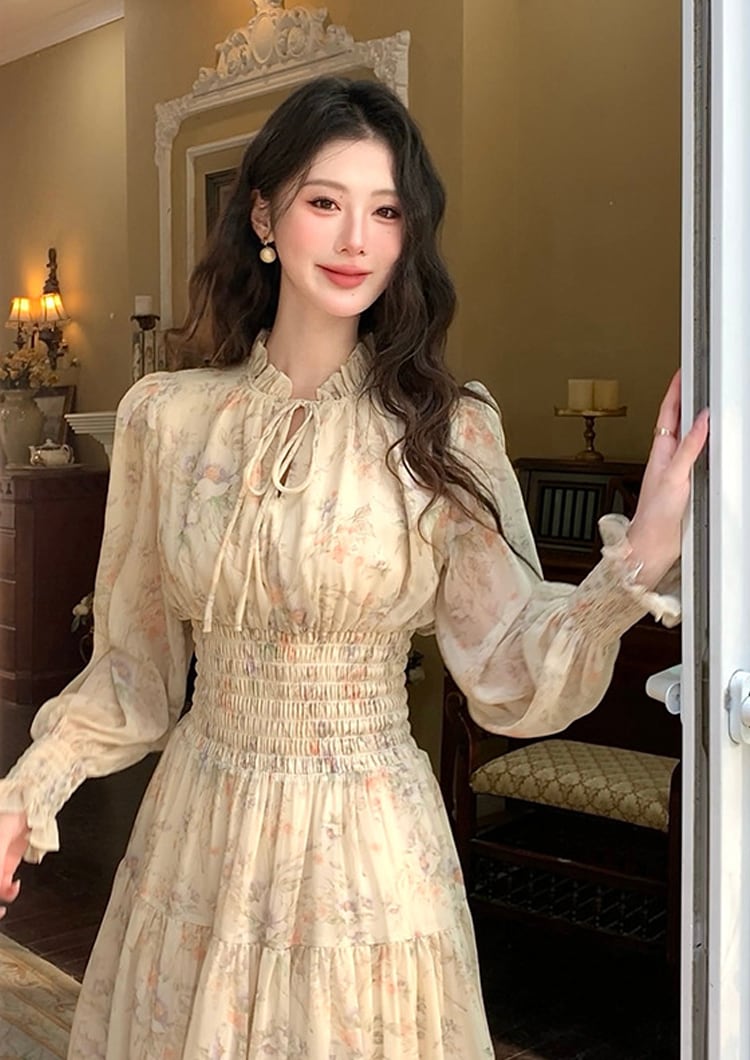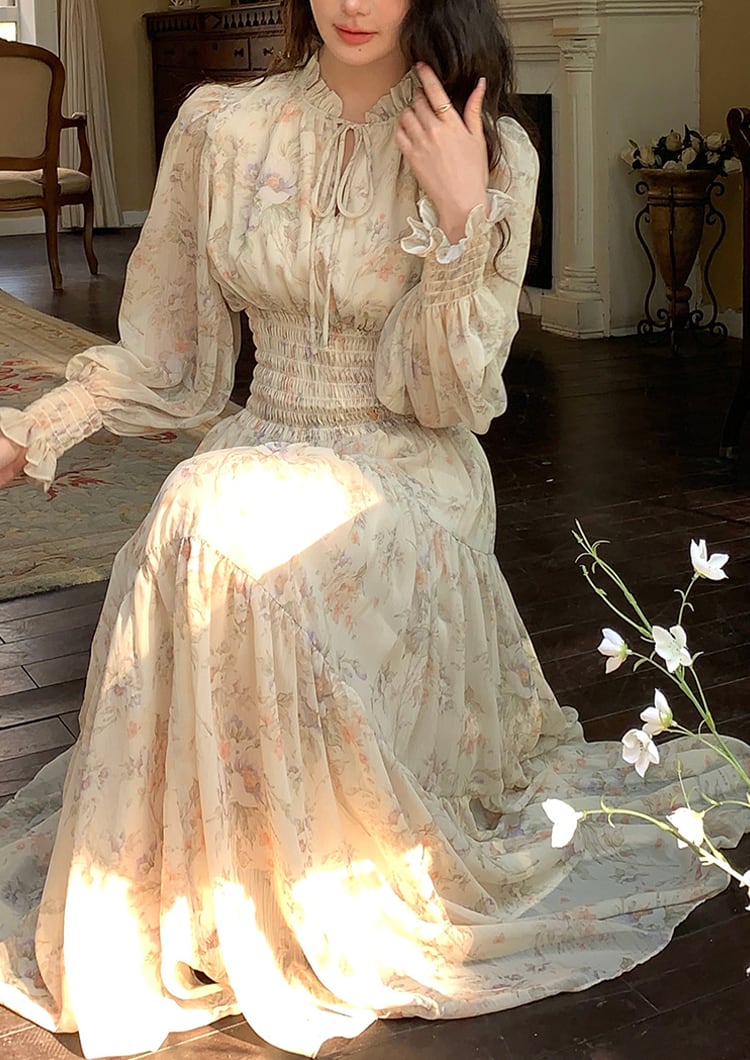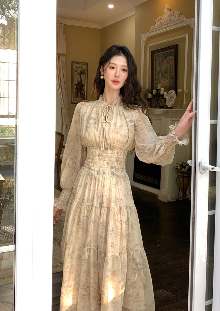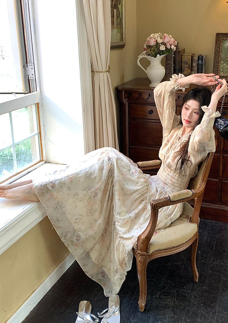 【dress】フラワー柄シフォンAラインロングワンピース Q7978