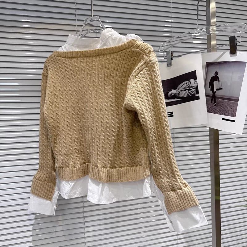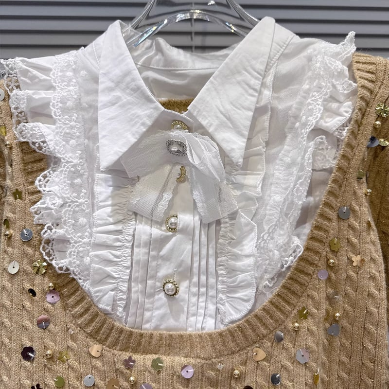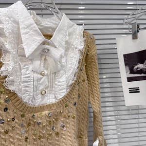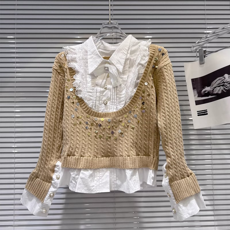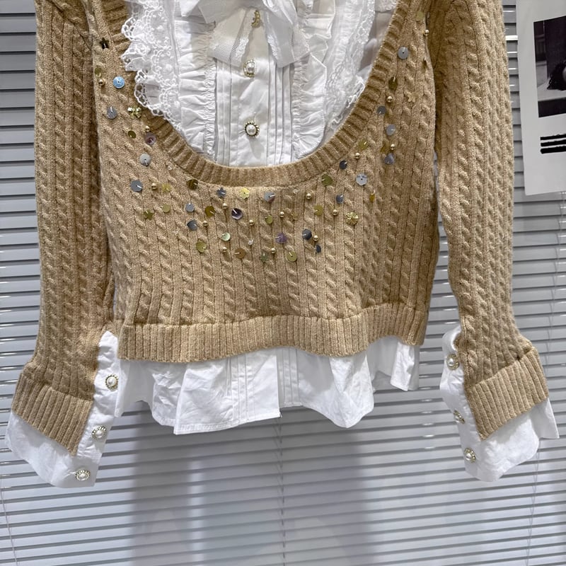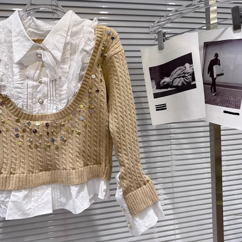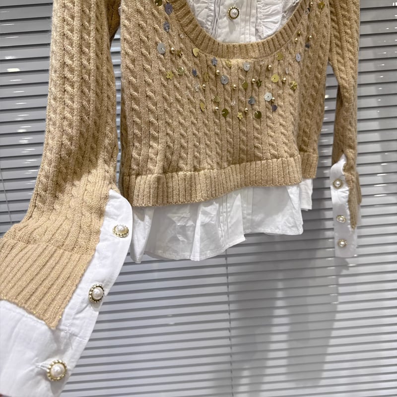 【tops】スパンコール付きフェイクレイヤードニットトップス Q7997