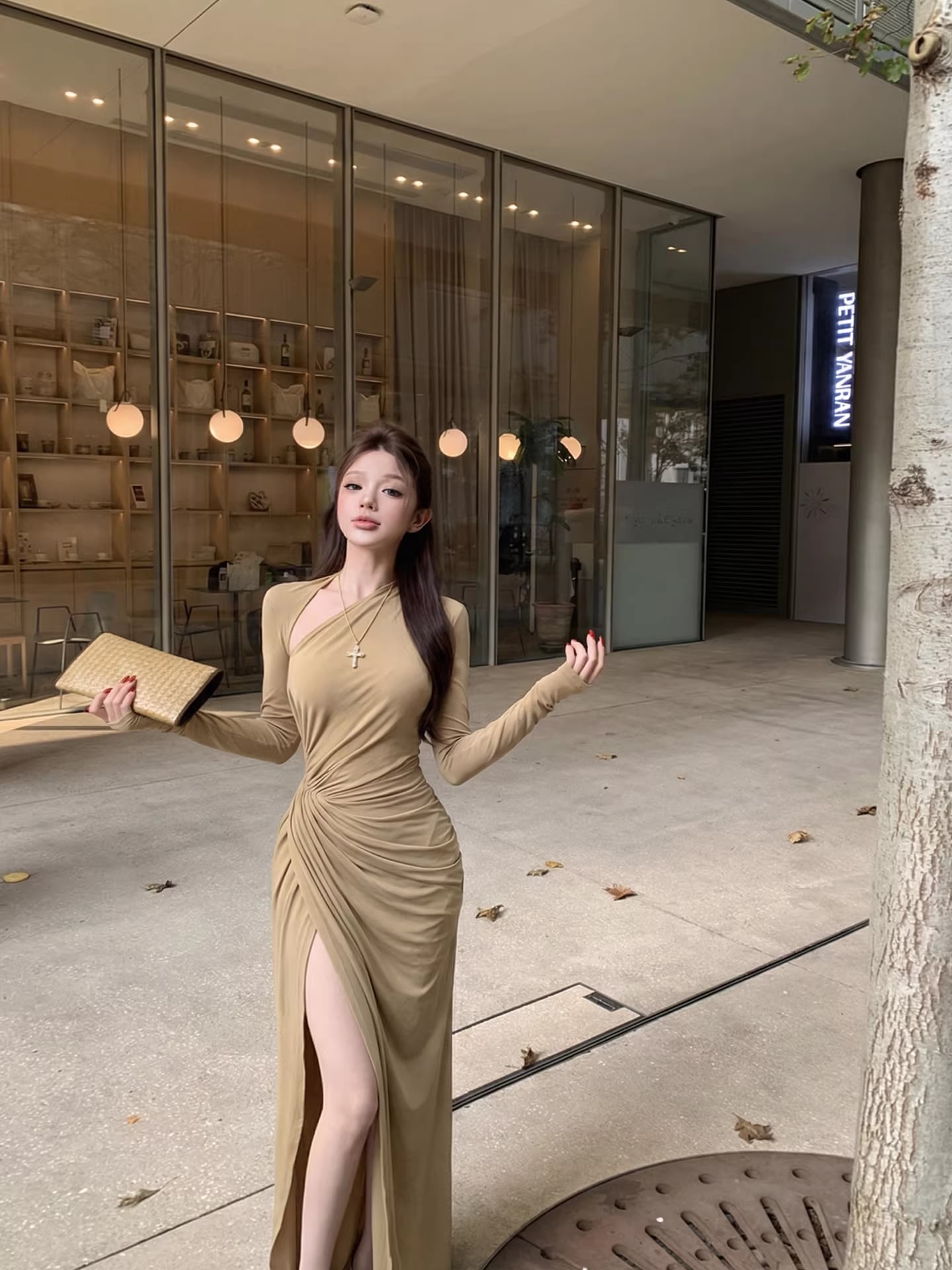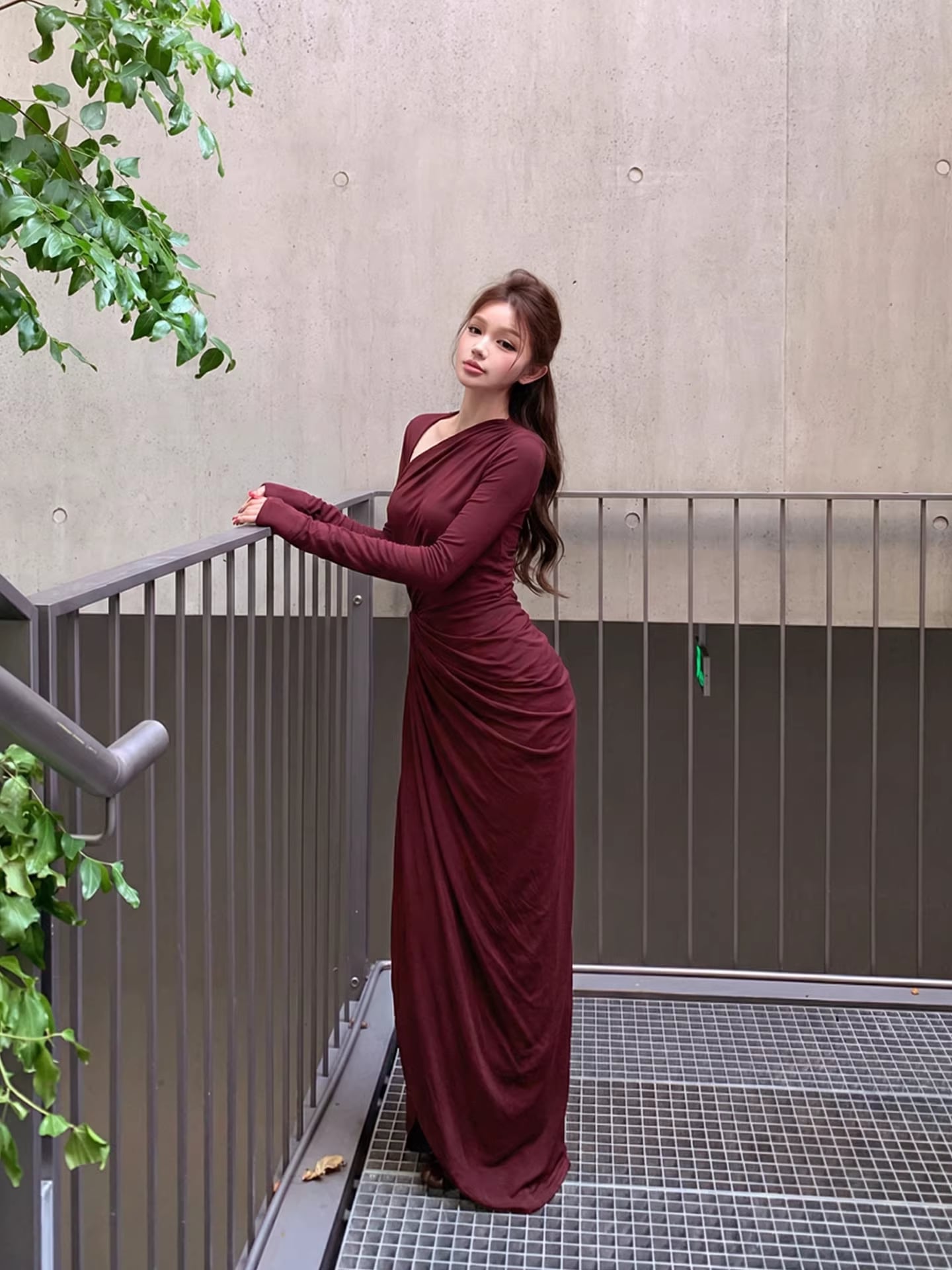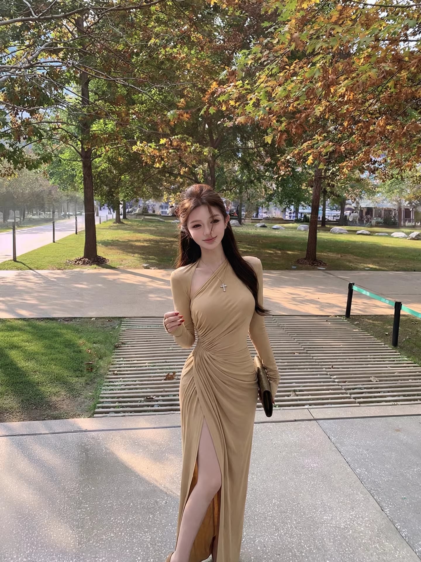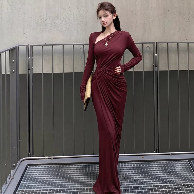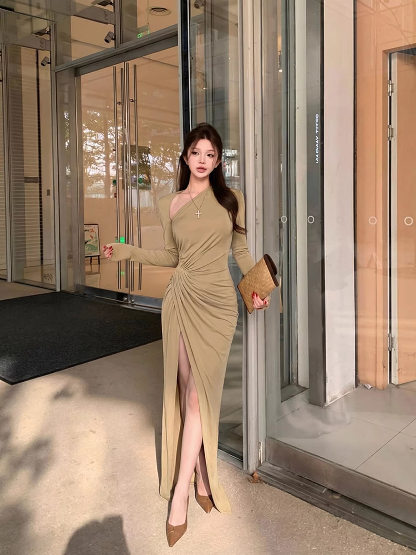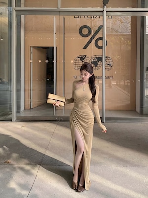 【dress】スリット入れギャザーデザインロングタイトワンピース Q8012