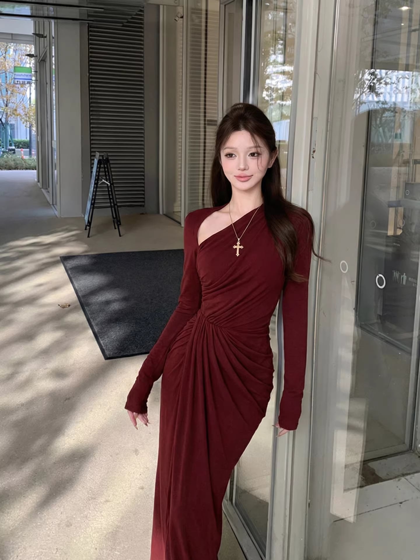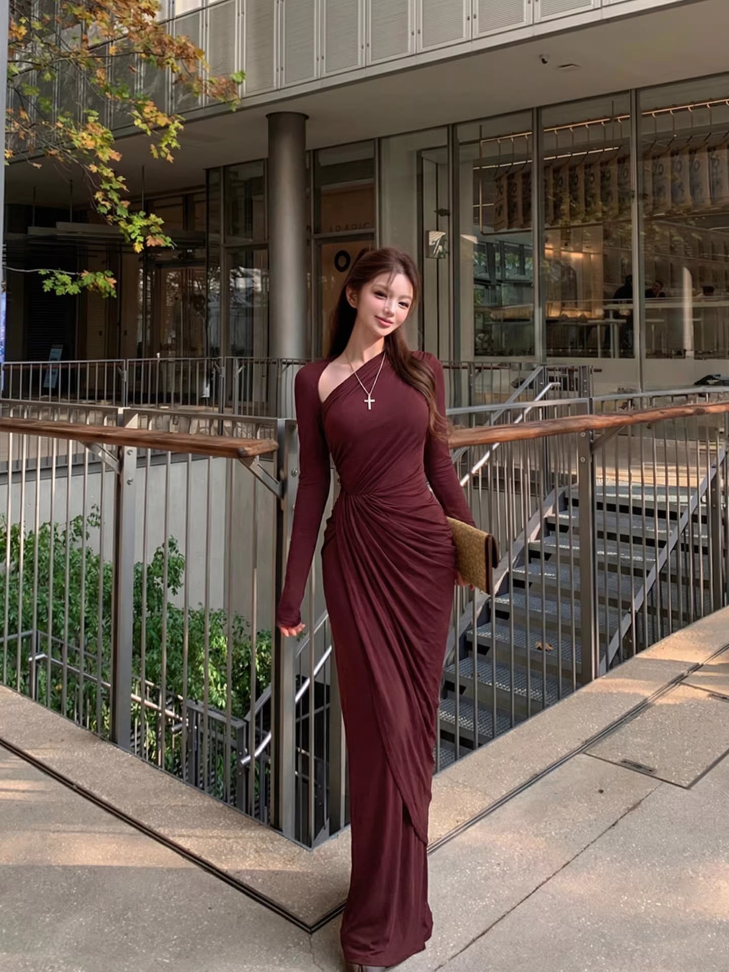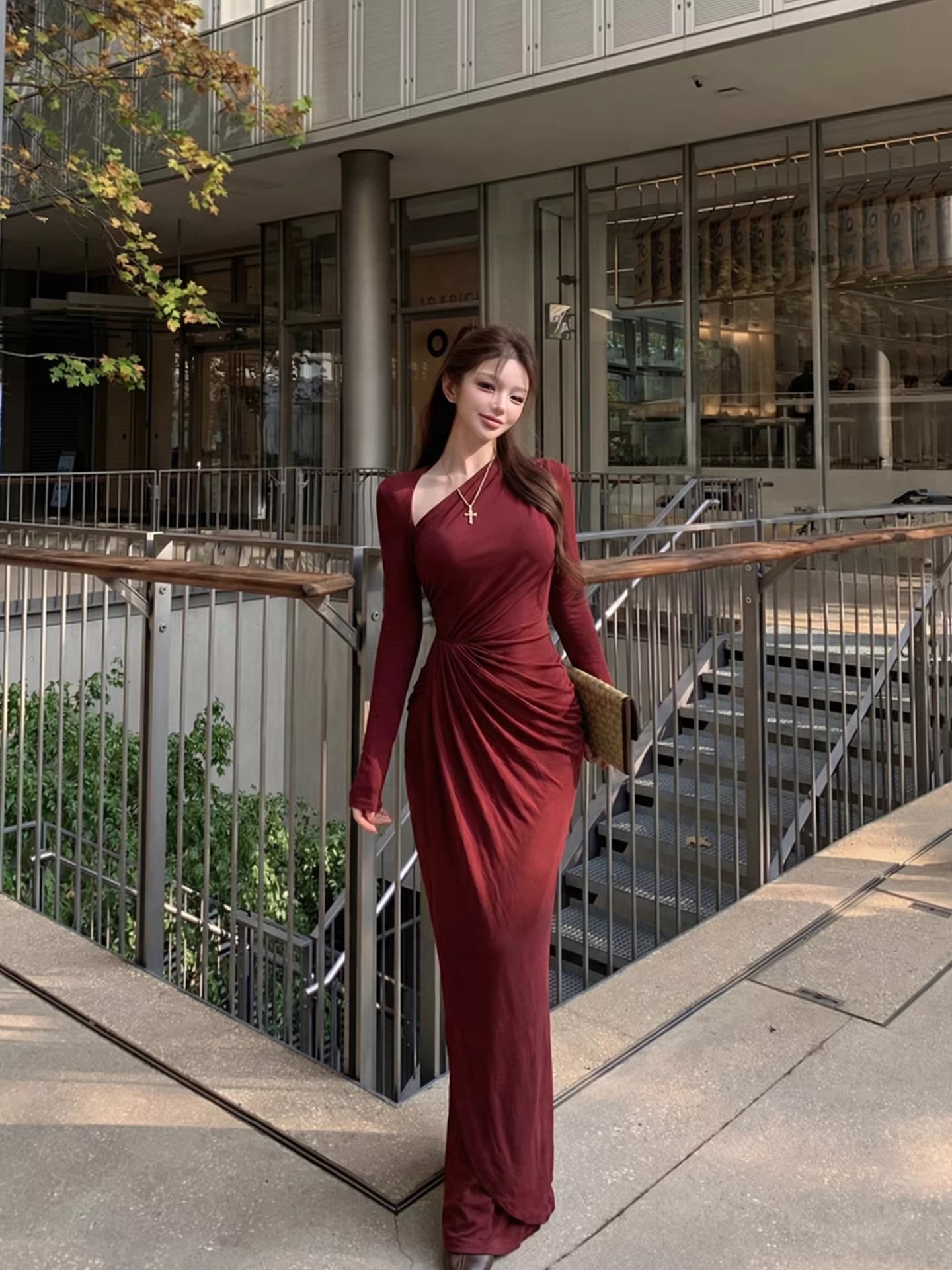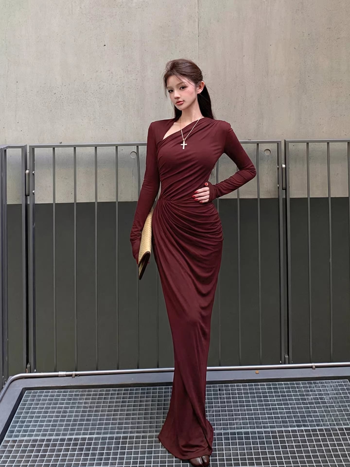 【dress】スリット入れギャザーデザインロングタイトワンピース Q8012