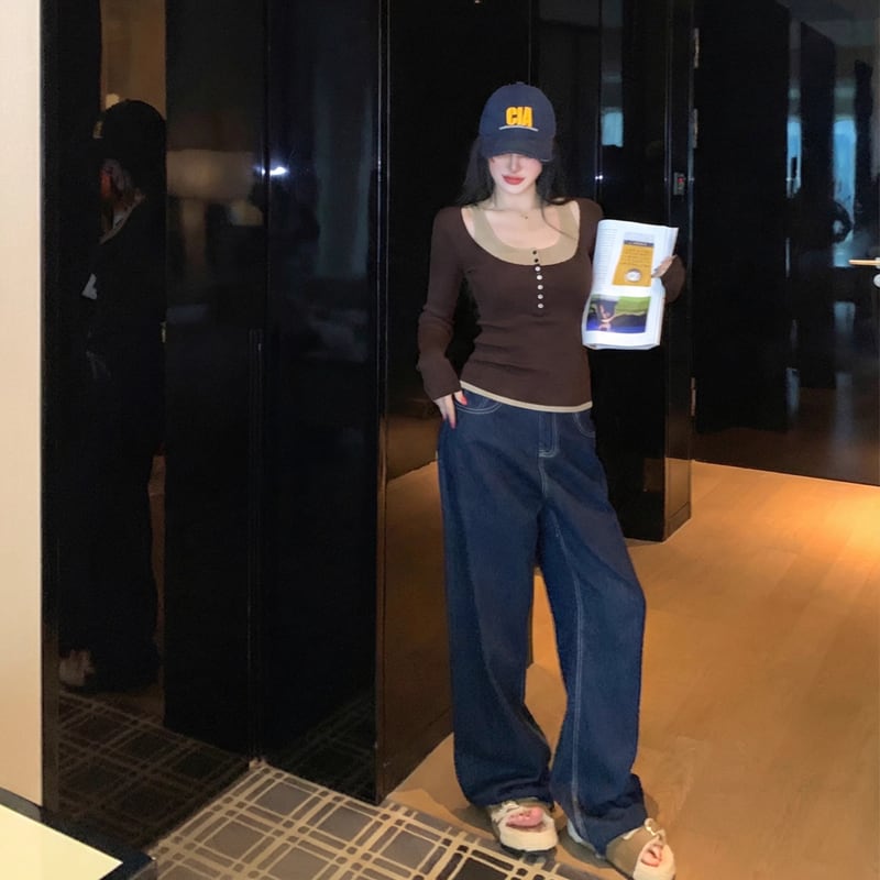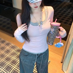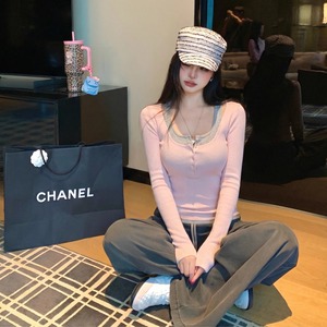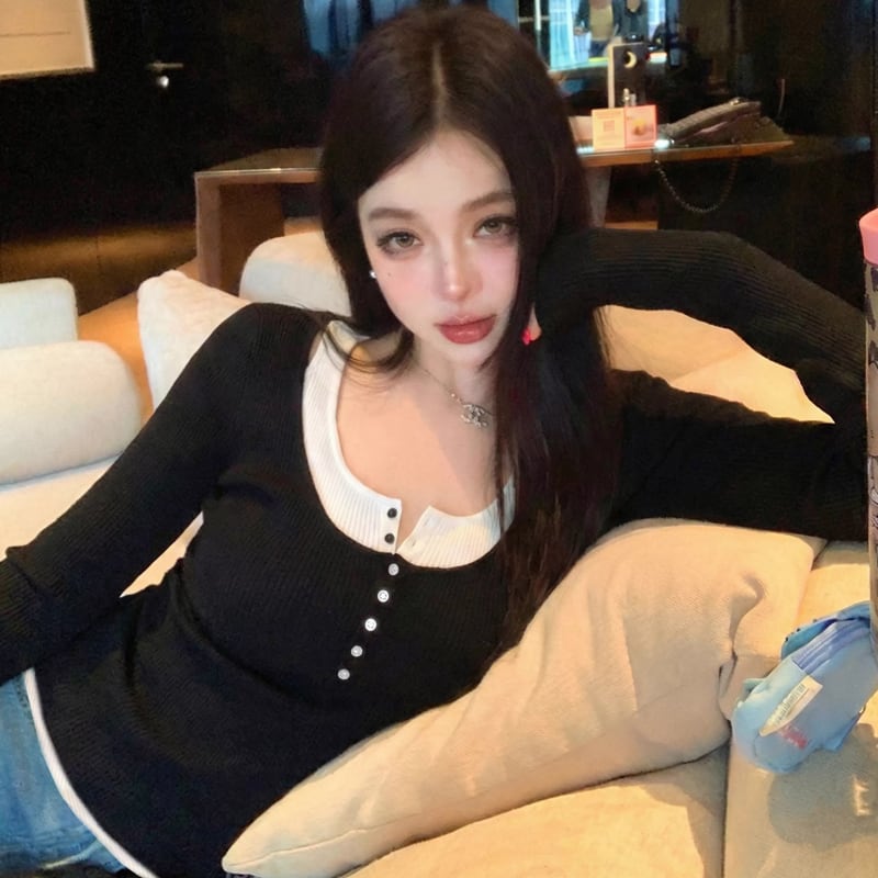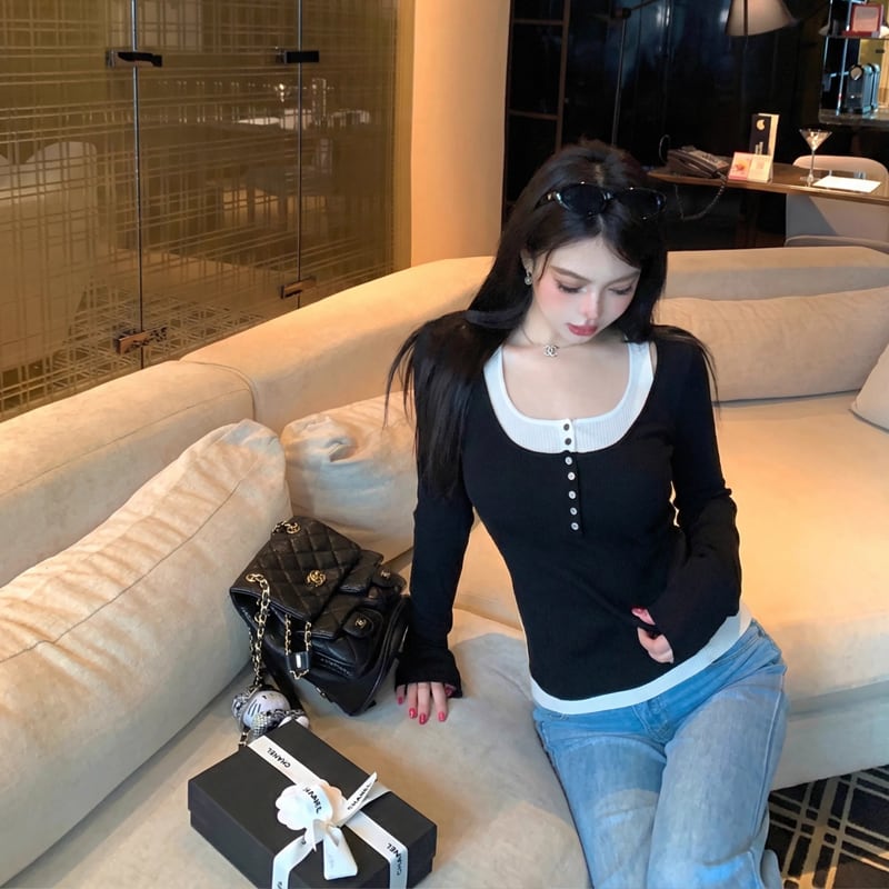 【tops】フェイクレイヤードニットトップス Q8013