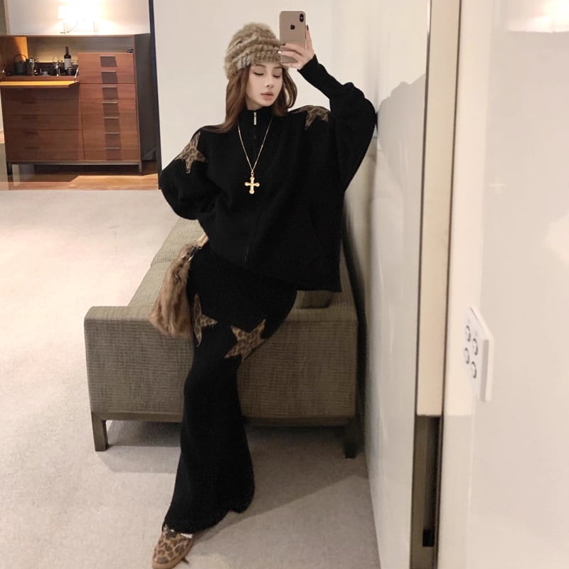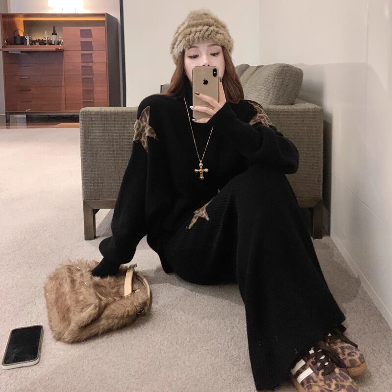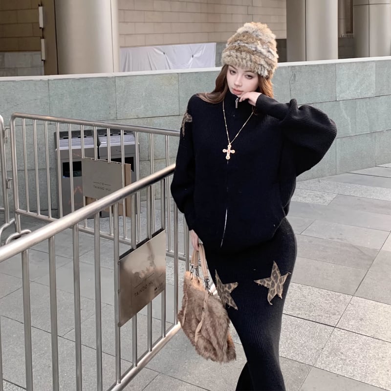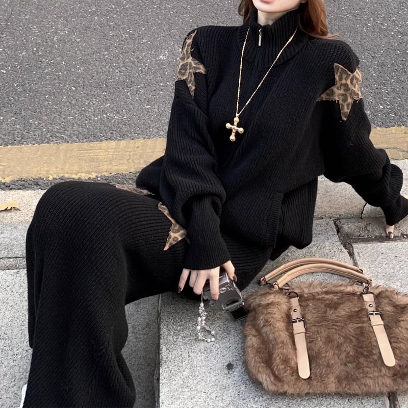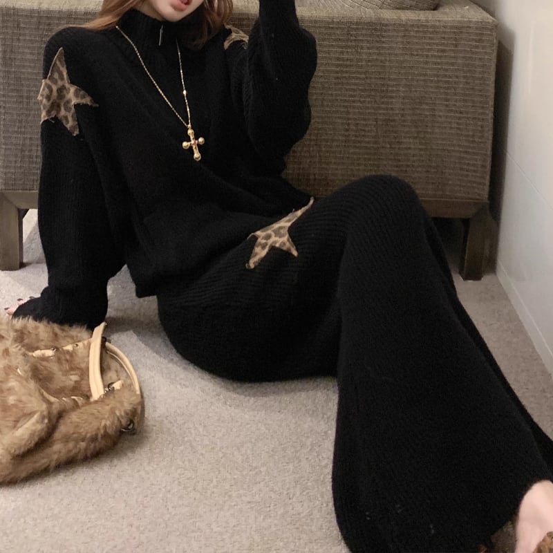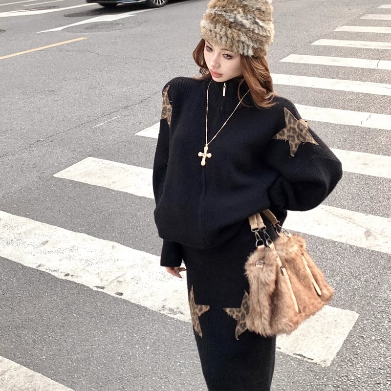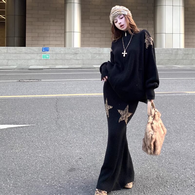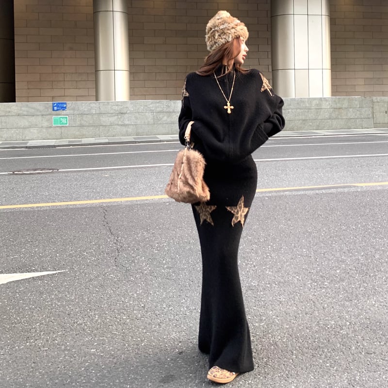 【set】ヒョウ柄スター付きニットトップス×タイトロングスカートセット Q8015
