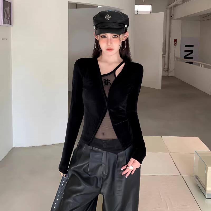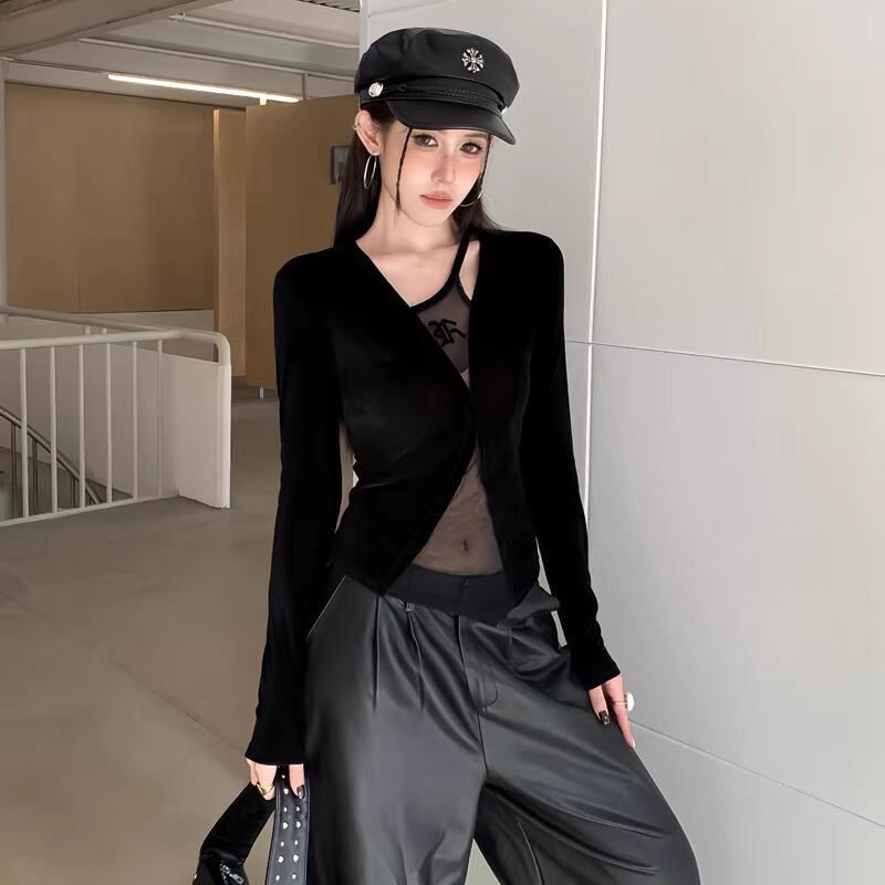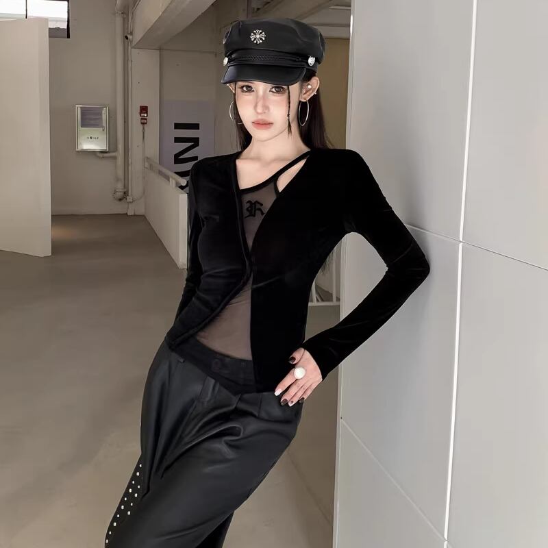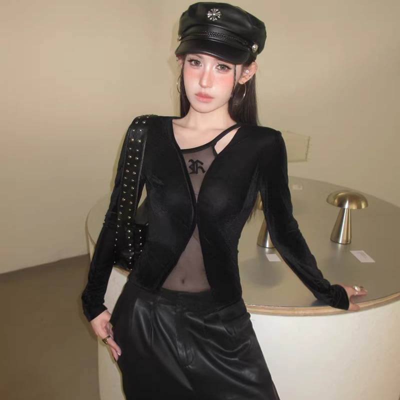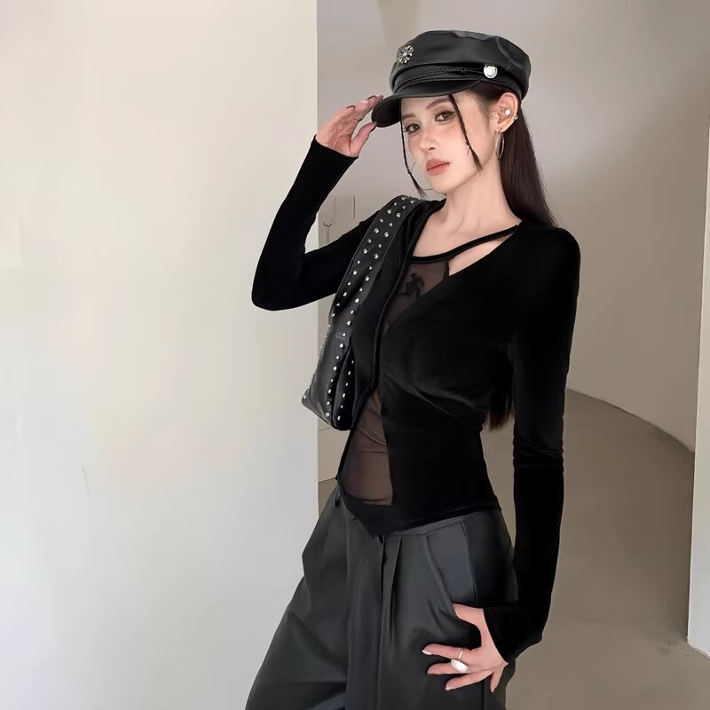【tops】フェイクレイヤードチュールドッキングベルベットトップス Q8024