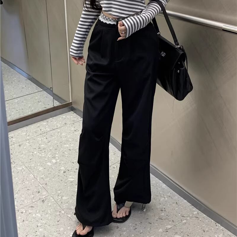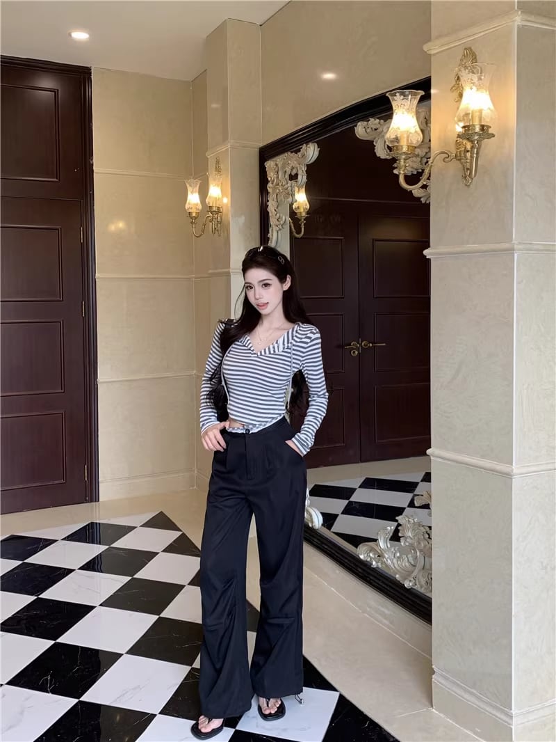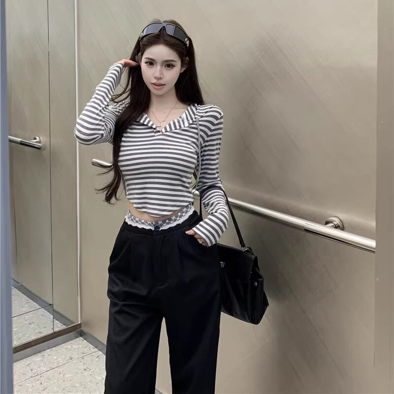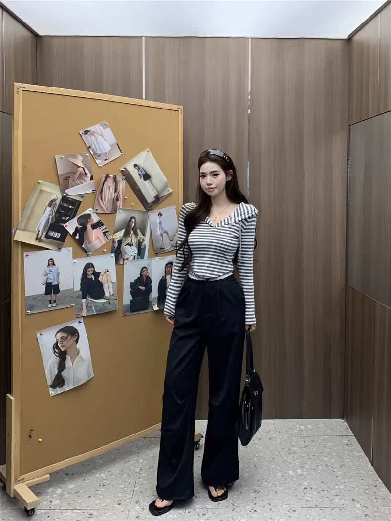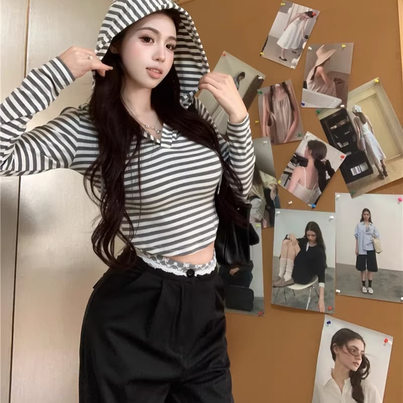 【set】 ボーダー柄パーカー×レースドッキングワイドパンツセット Q8051