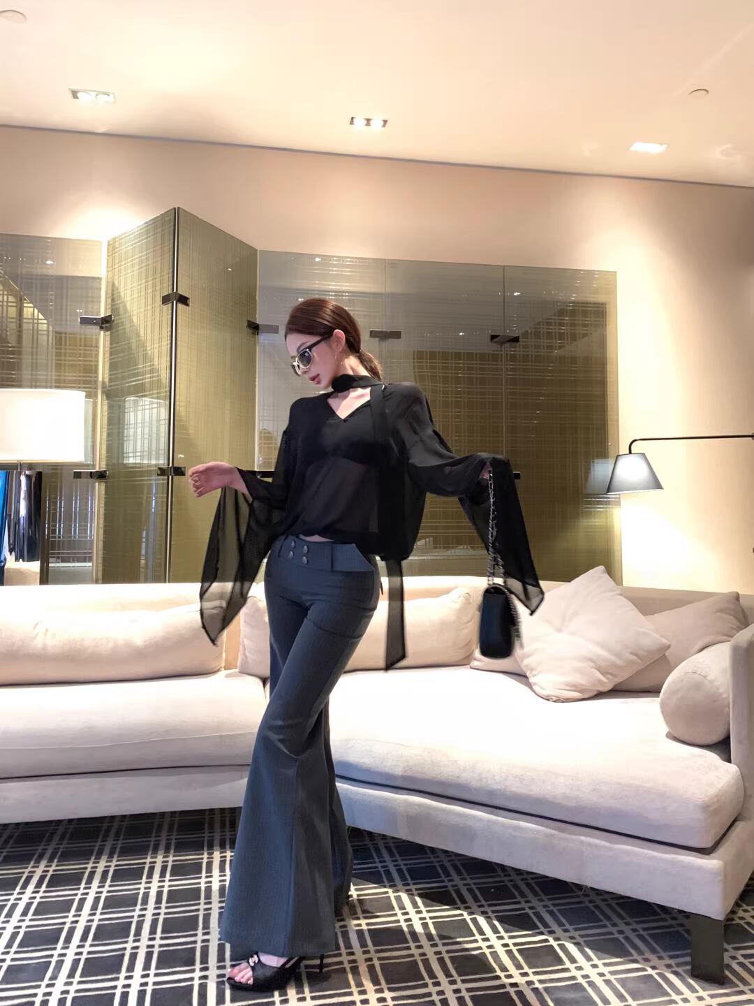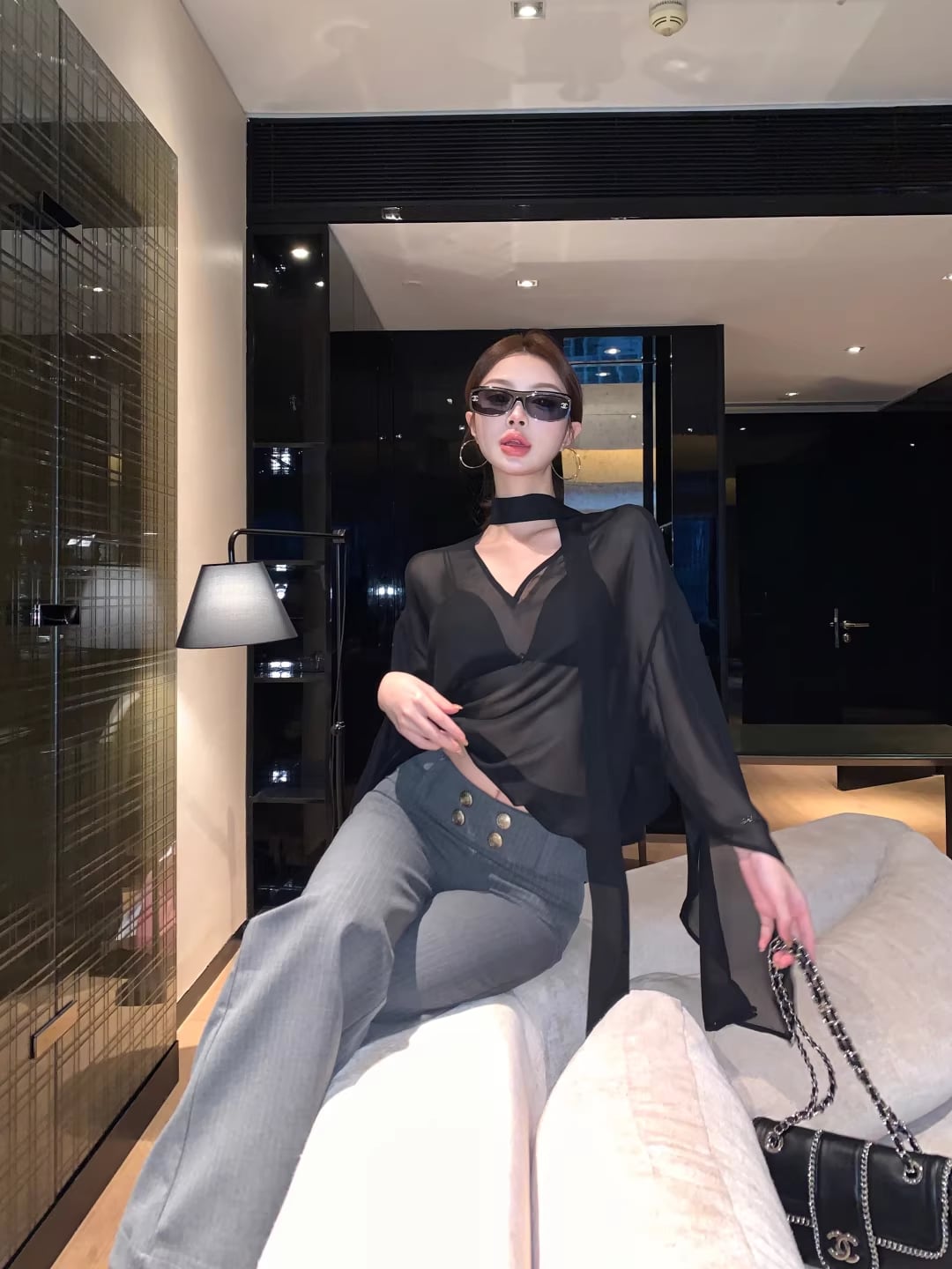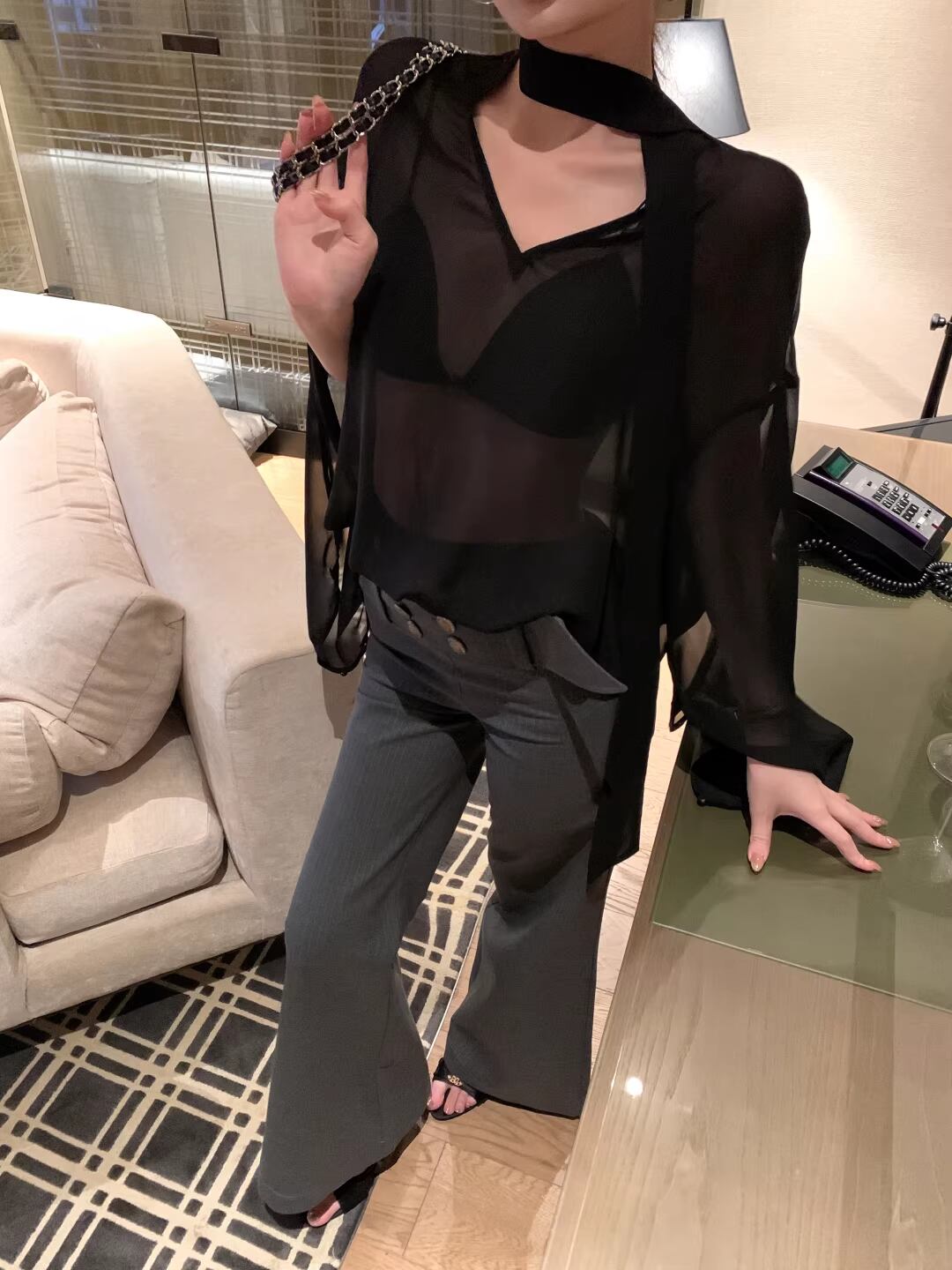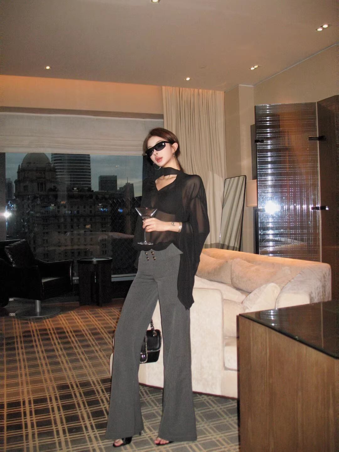 【set】スカーフ付き透け感チュールトップス×ストライプ柄パンツセット Q8056