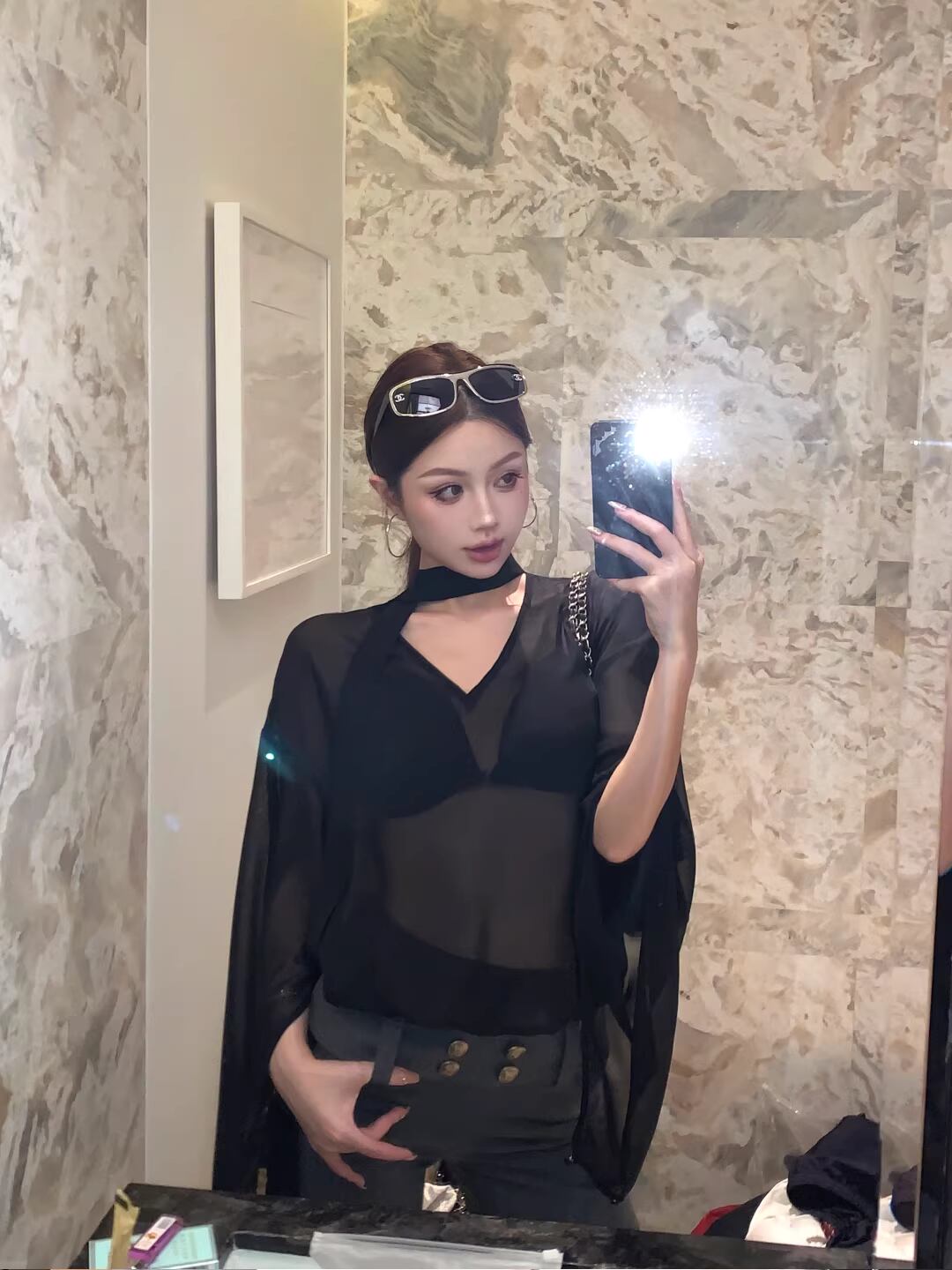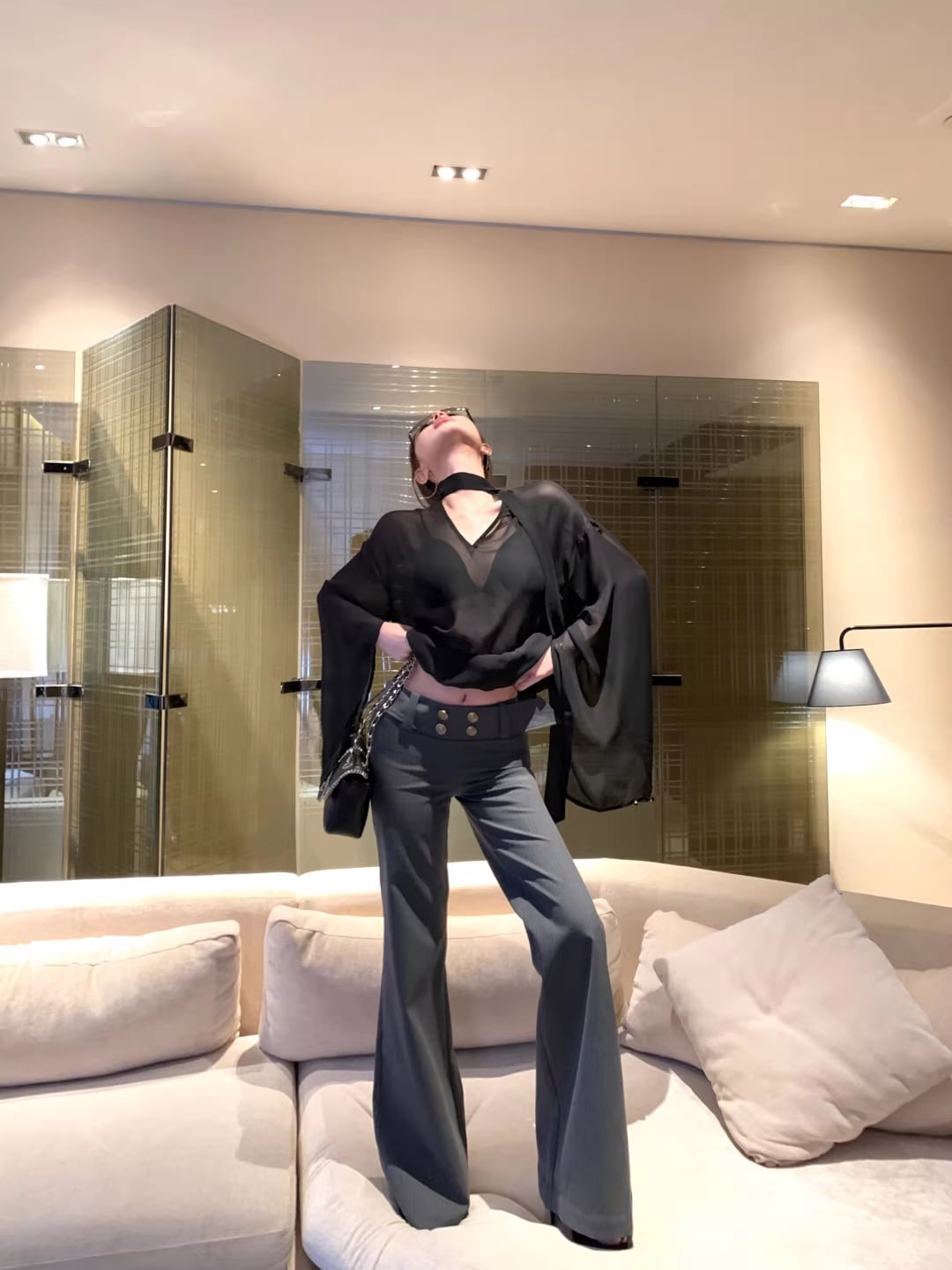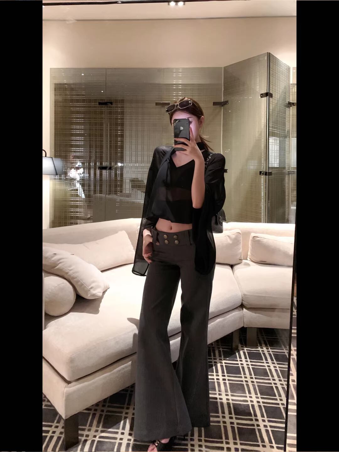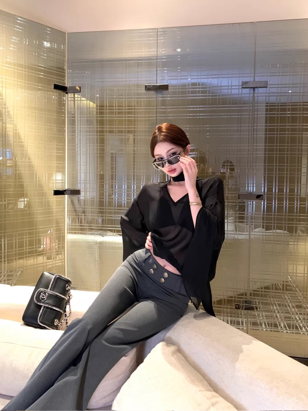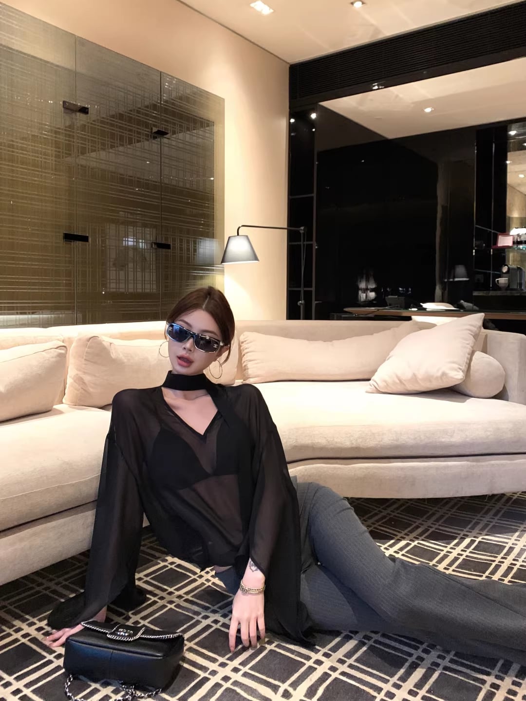 【set】スカーフ付き透け感チュールトップス×ストライプ柄パンツセット Q8056