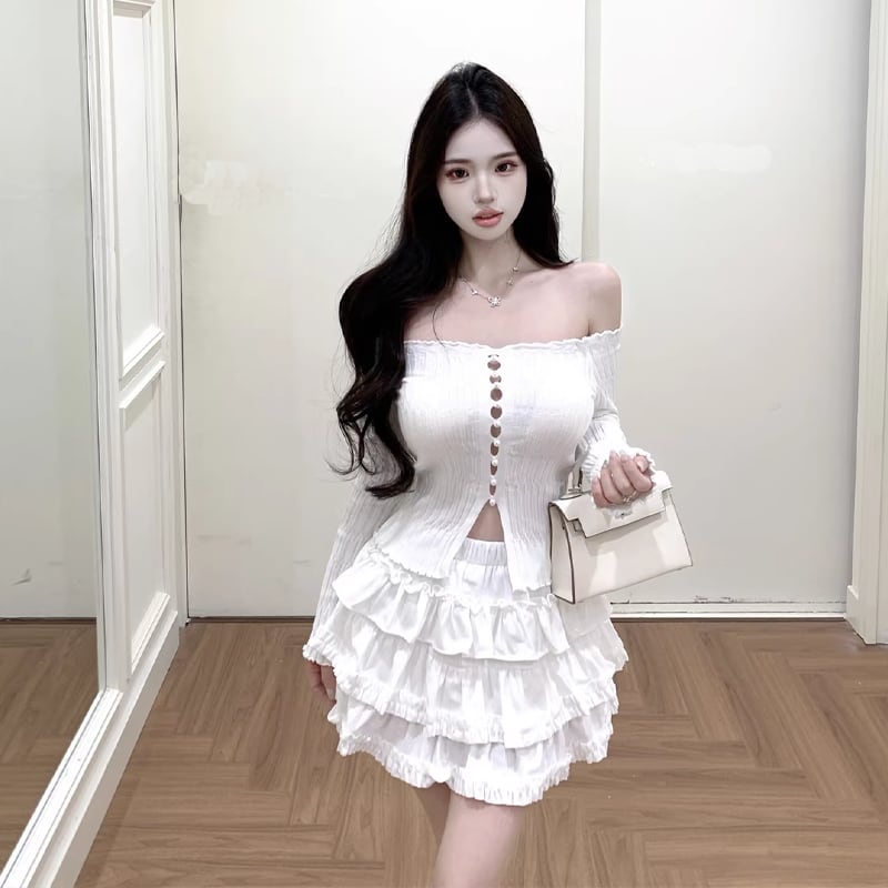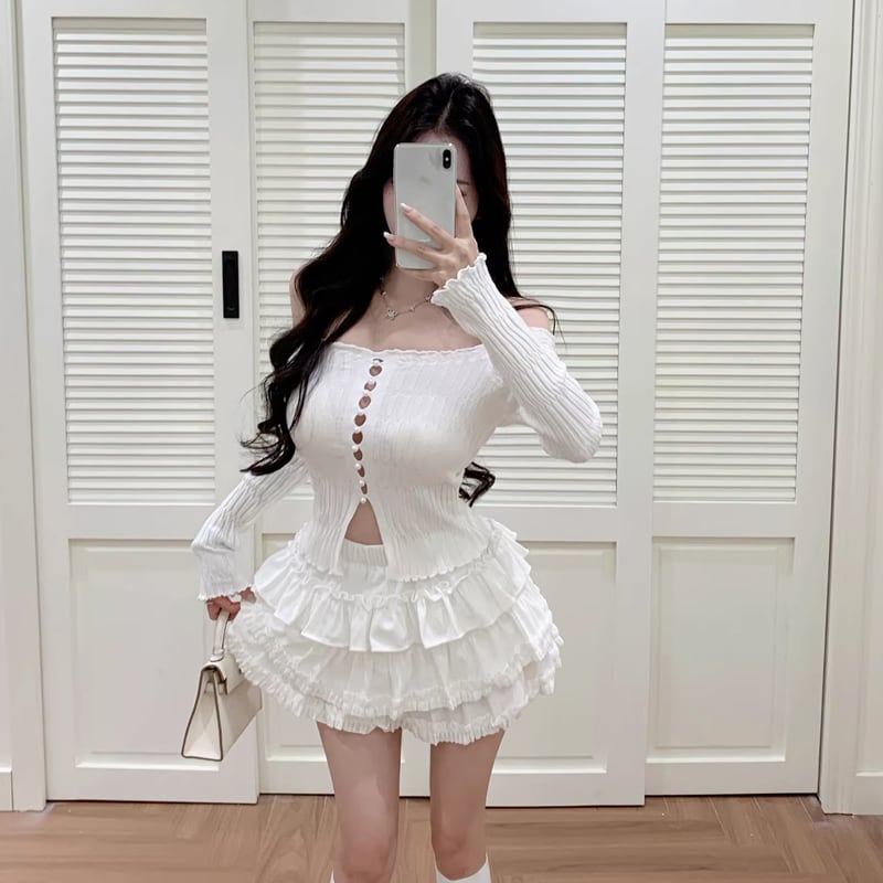 【set】パールボタンニットカーディガン×ティアードスカートセット Q8058