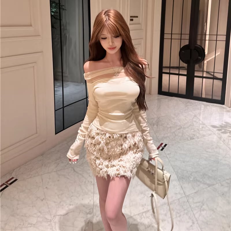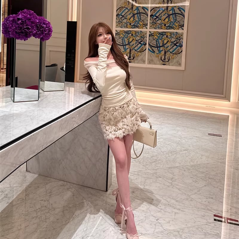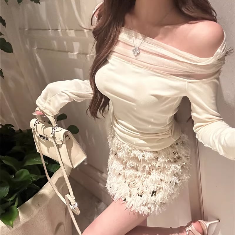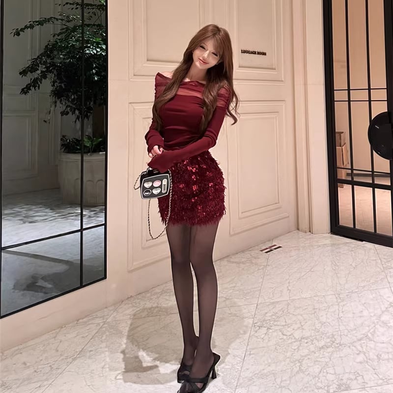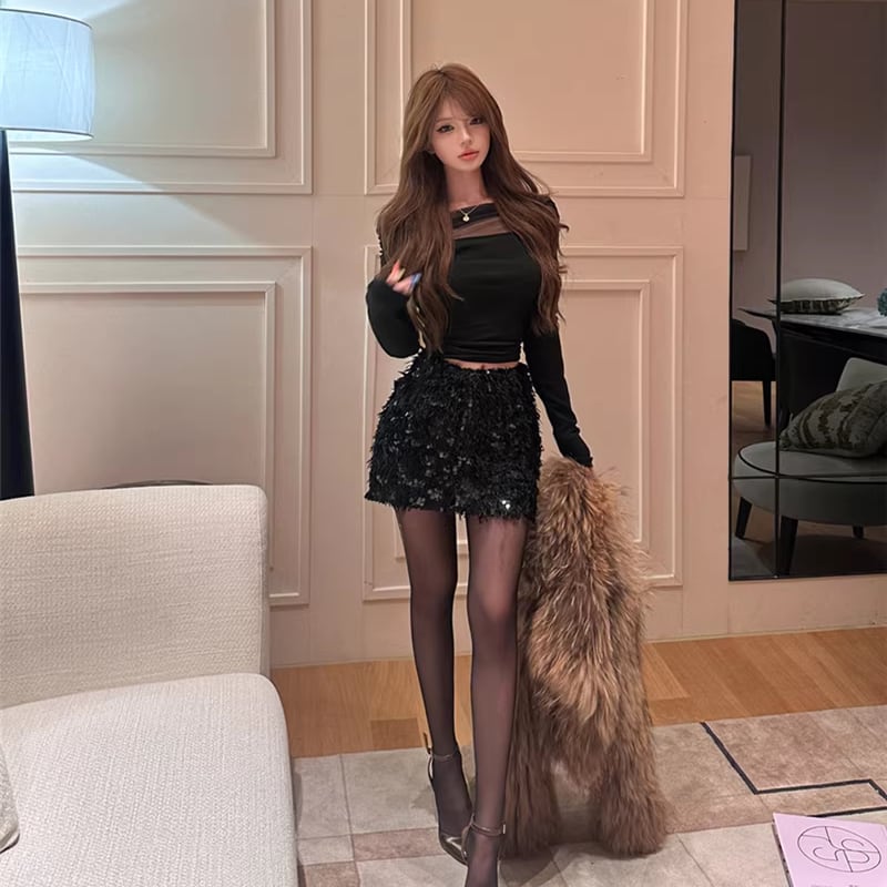 【set】チュールドッキングトップス×スパンコール付きミニスカートセット Q8072