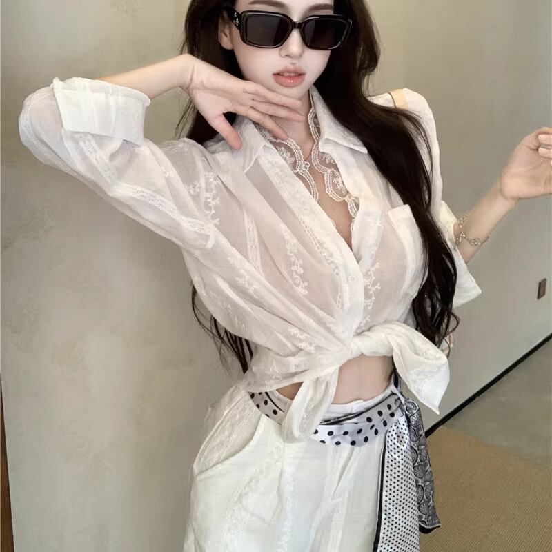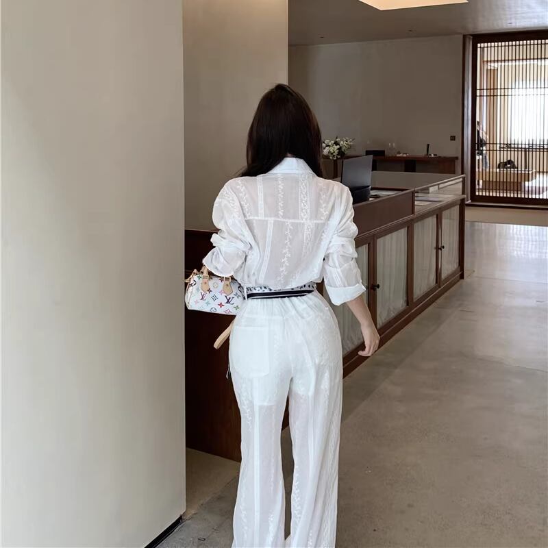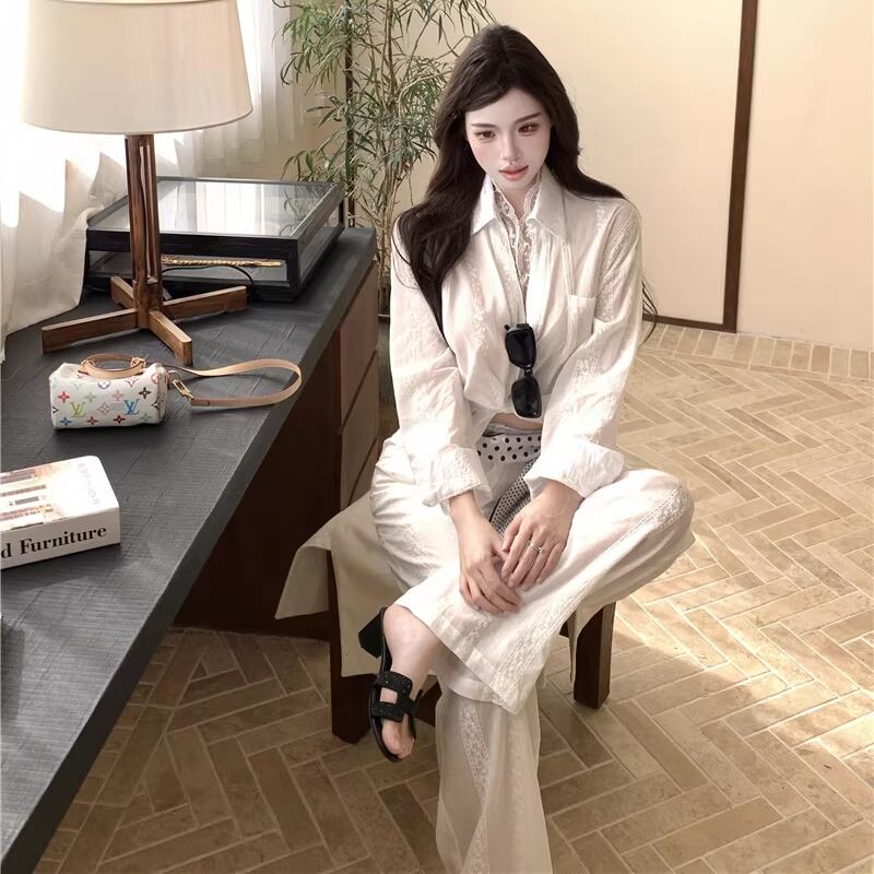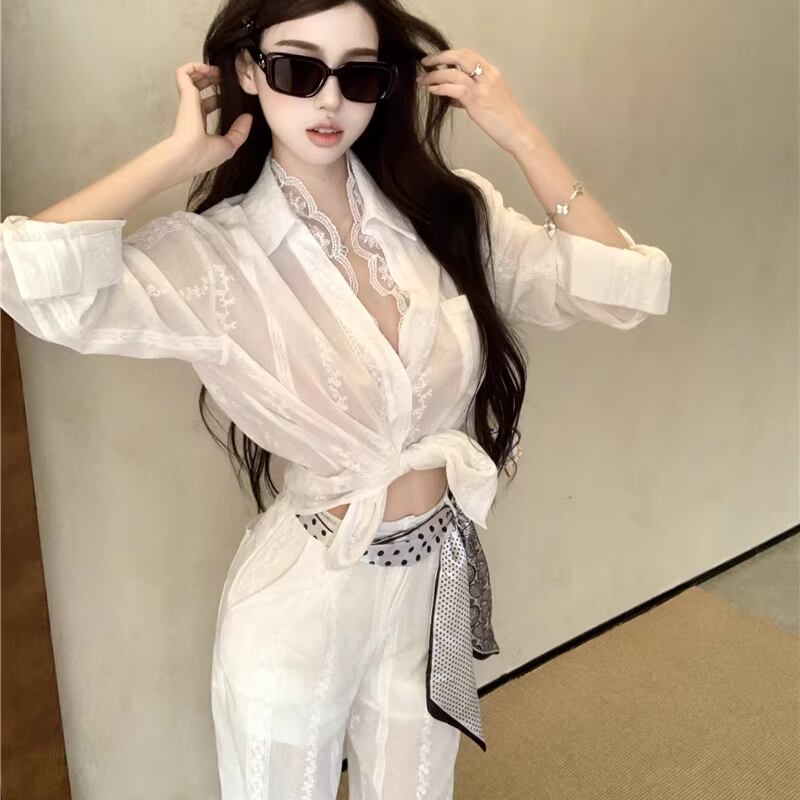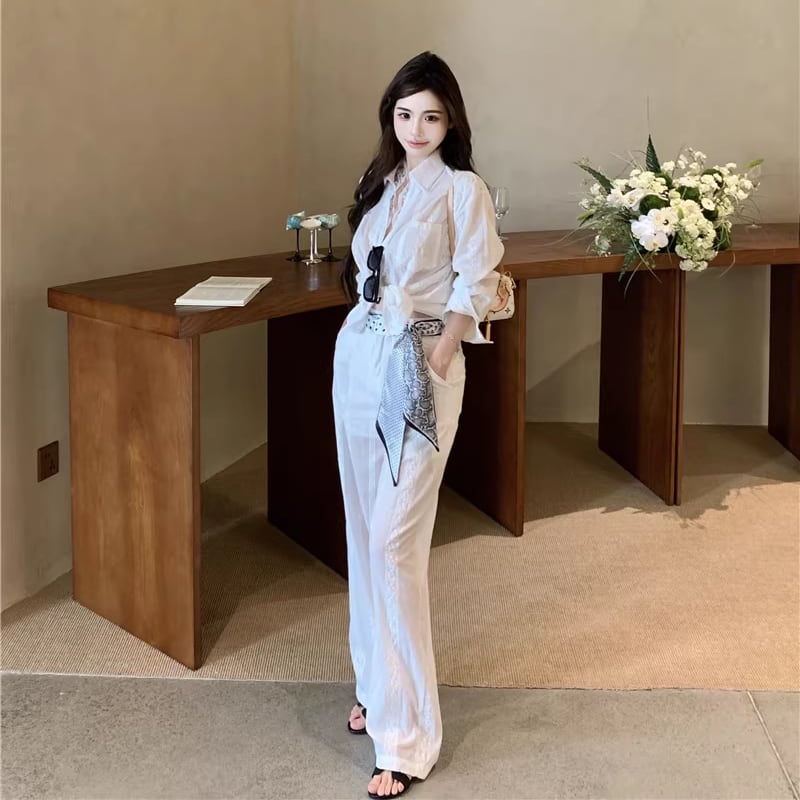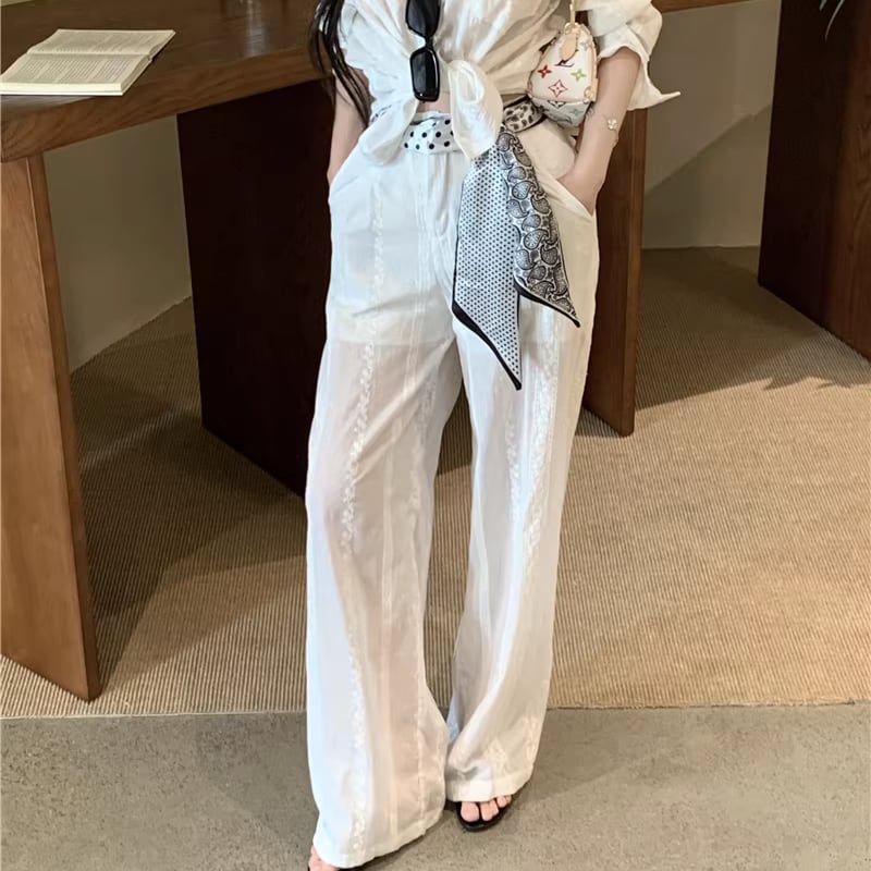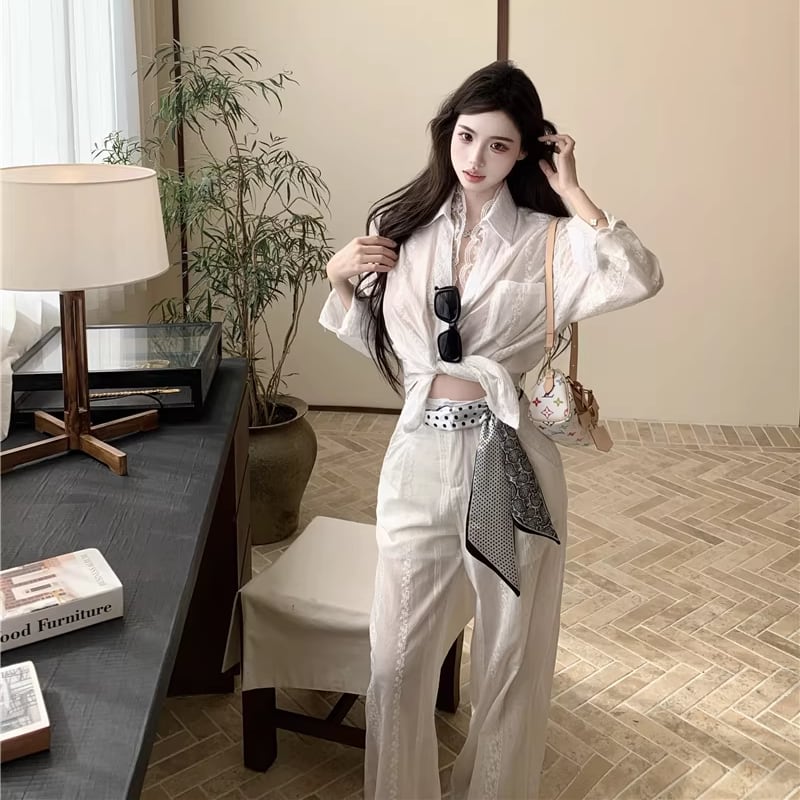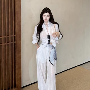 【set】レースドッキングシャツ×スカーフ付きワイドパンツセット Q8074
