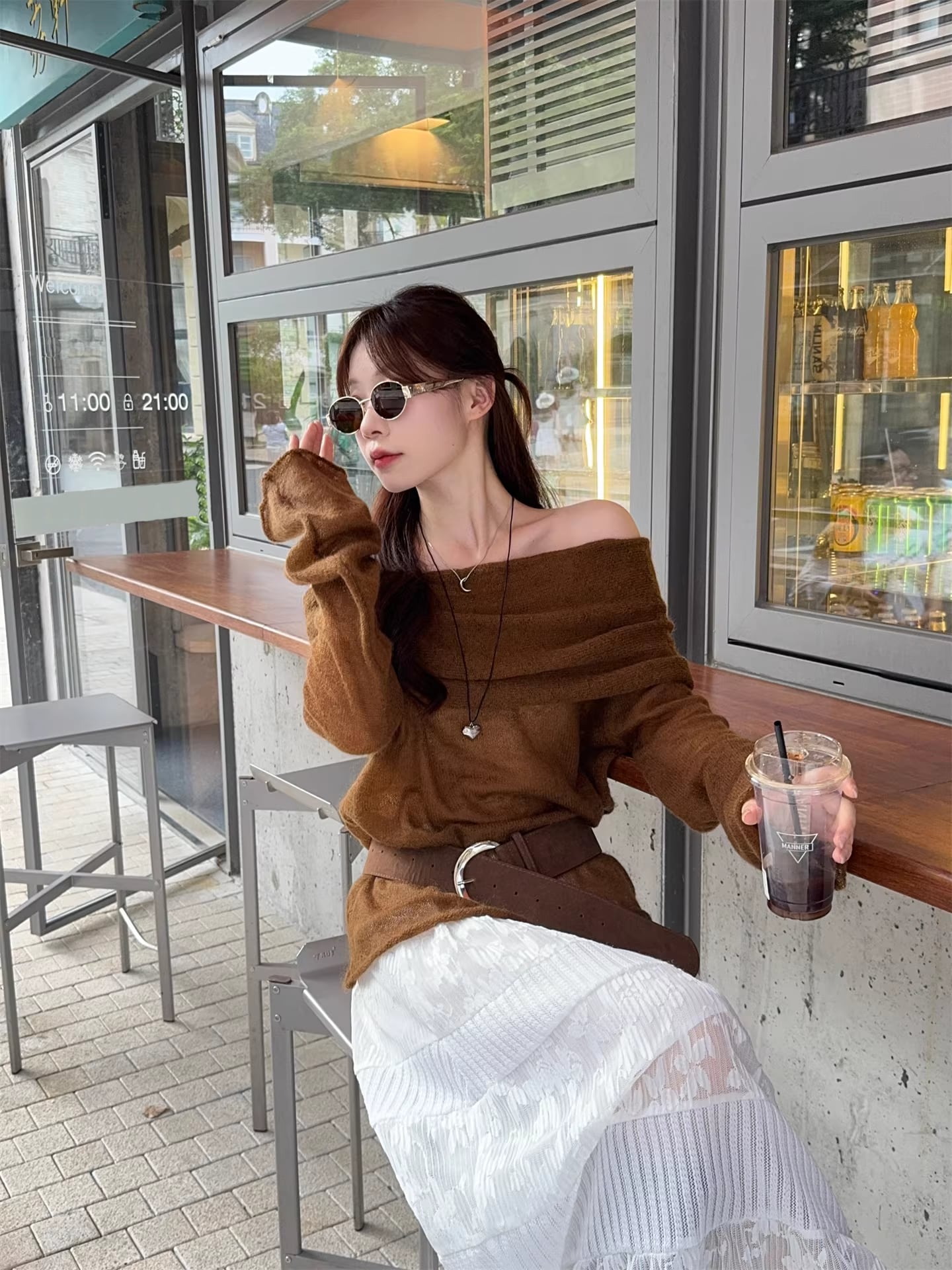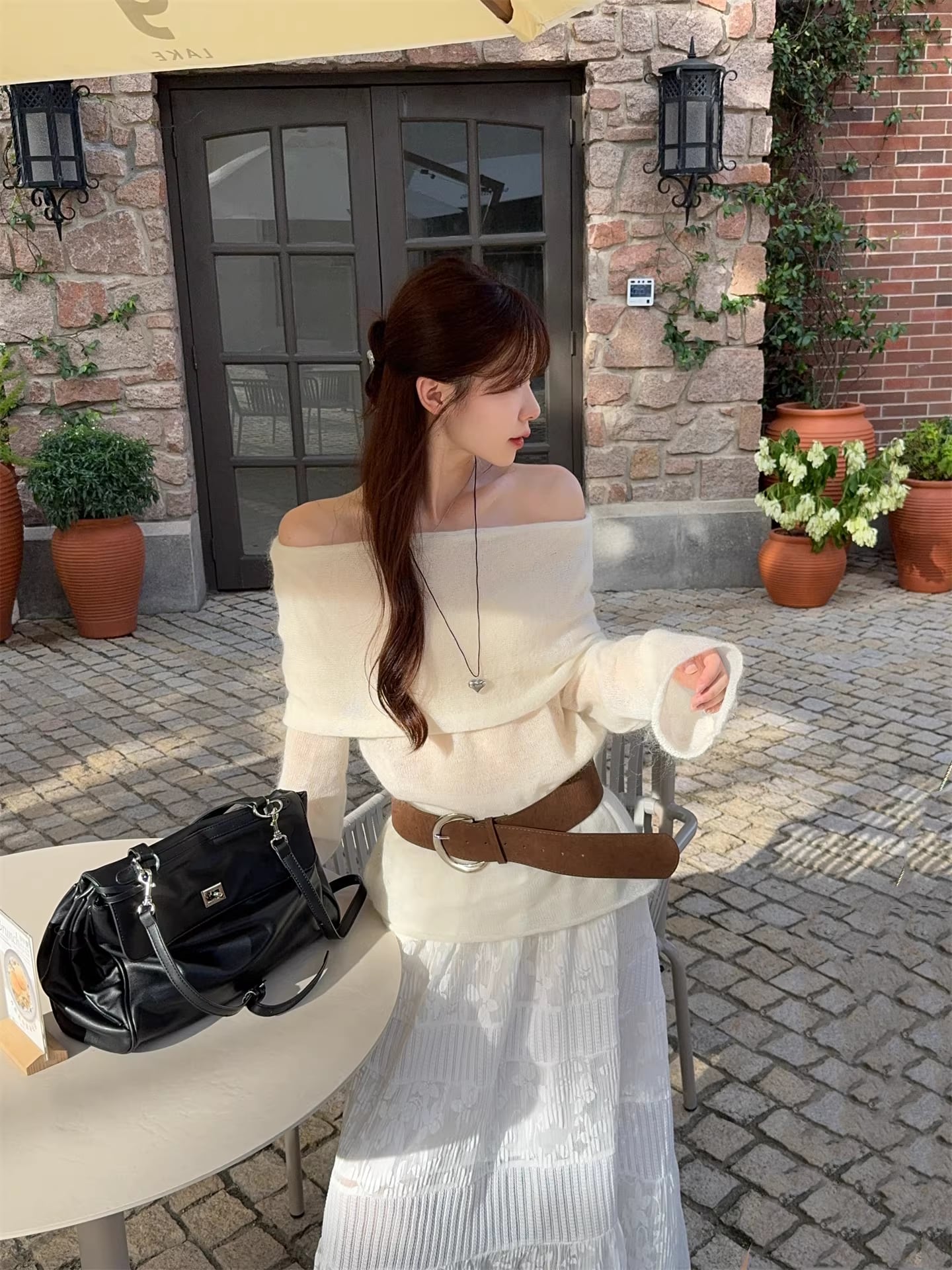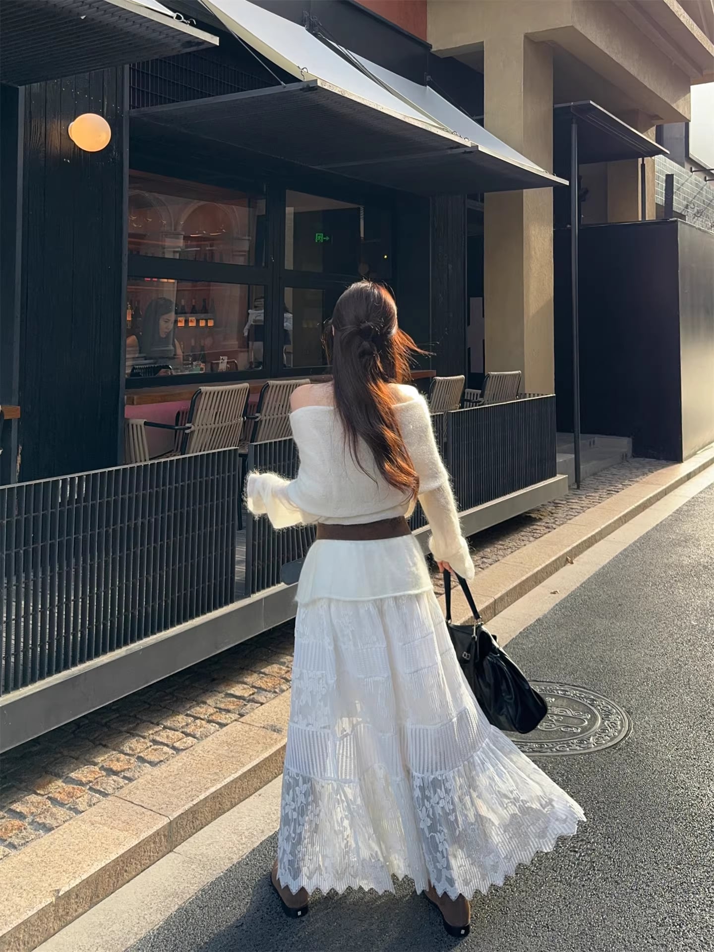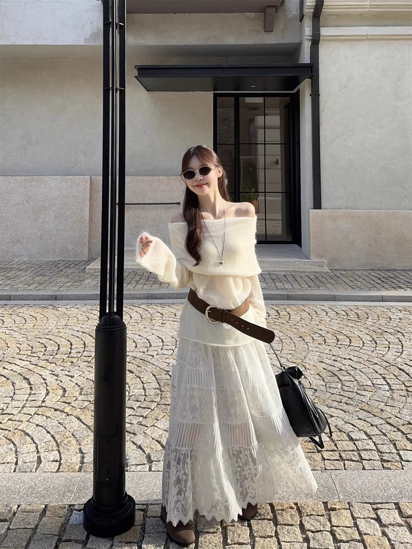 【set】オフショルダーニットトップス×レースロングスカートセット Q8094