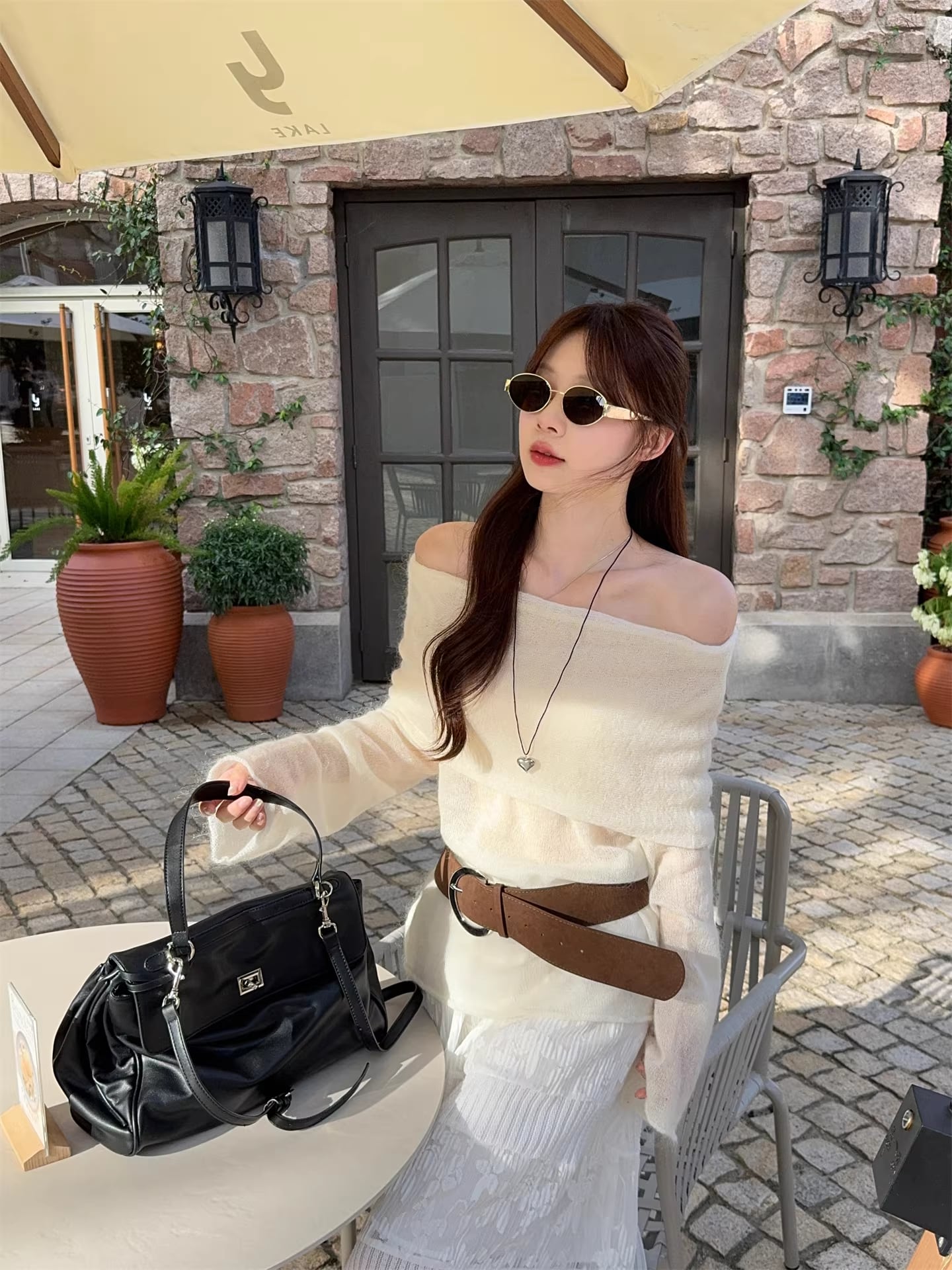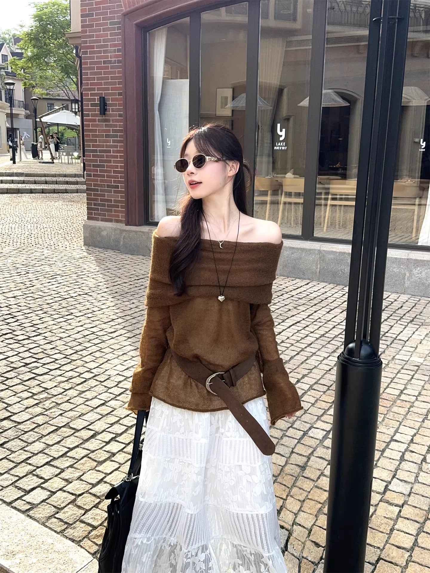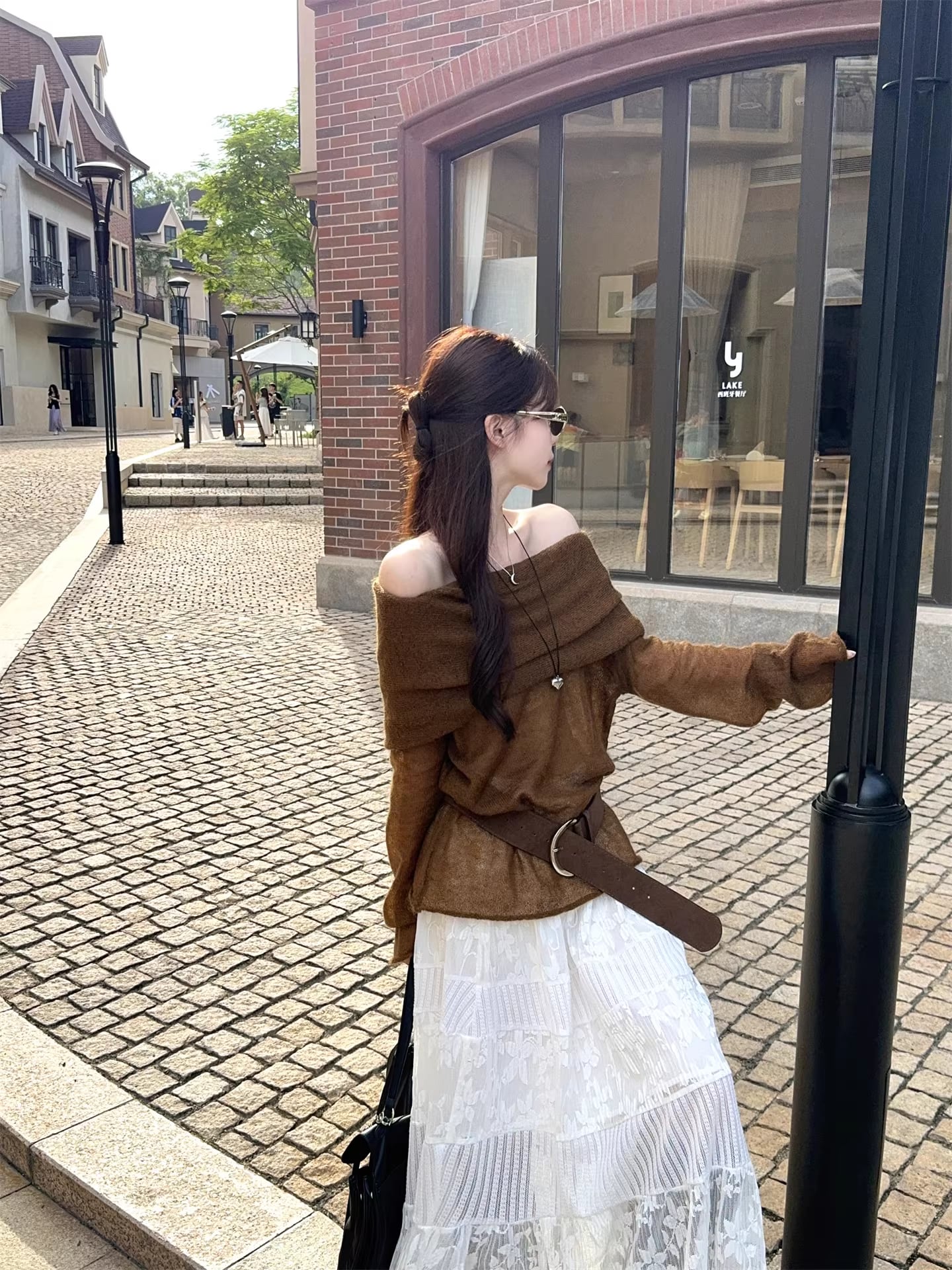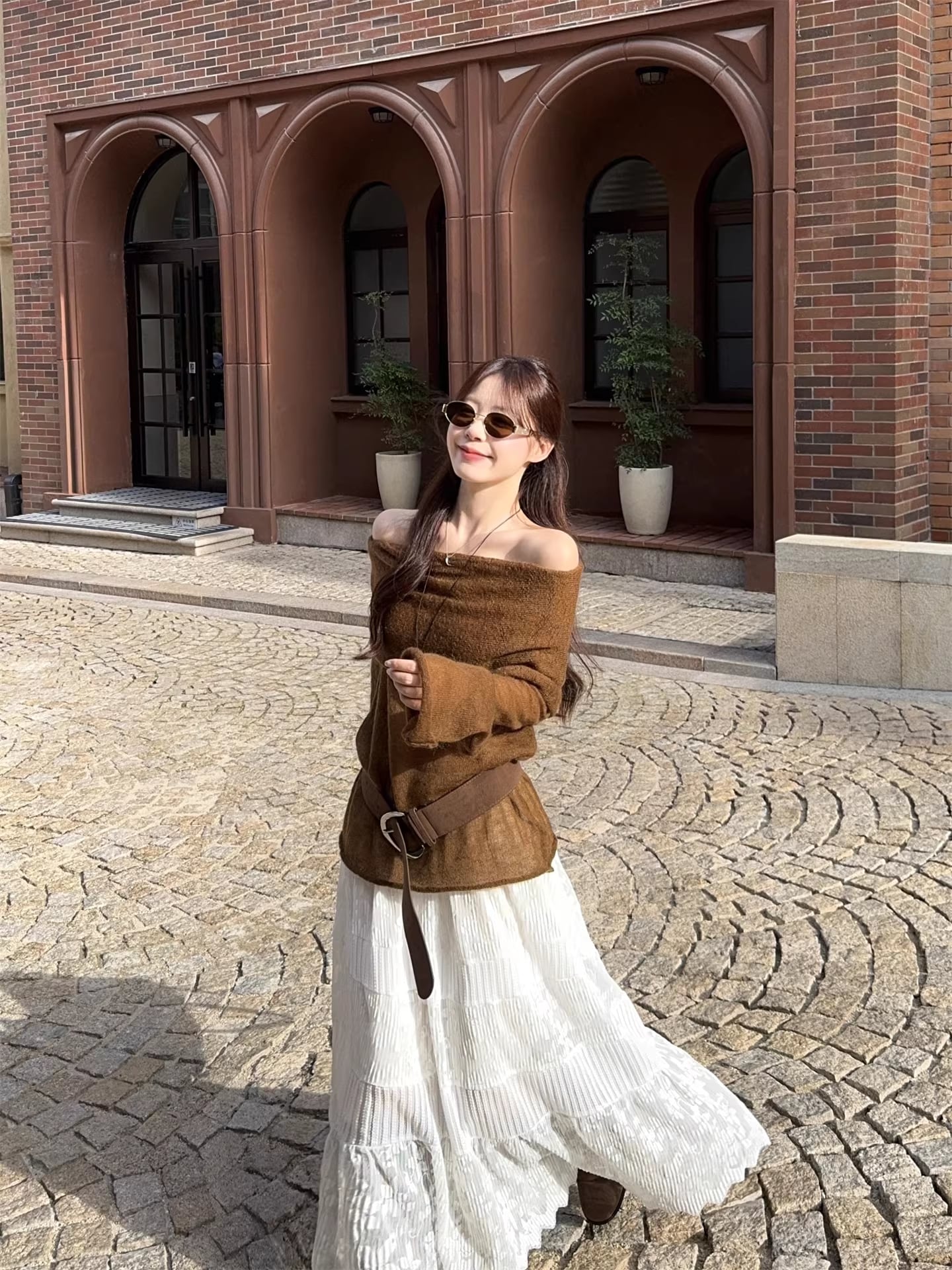 【set】オフショルダーニットトップス×レースロングスカートセット Q8094