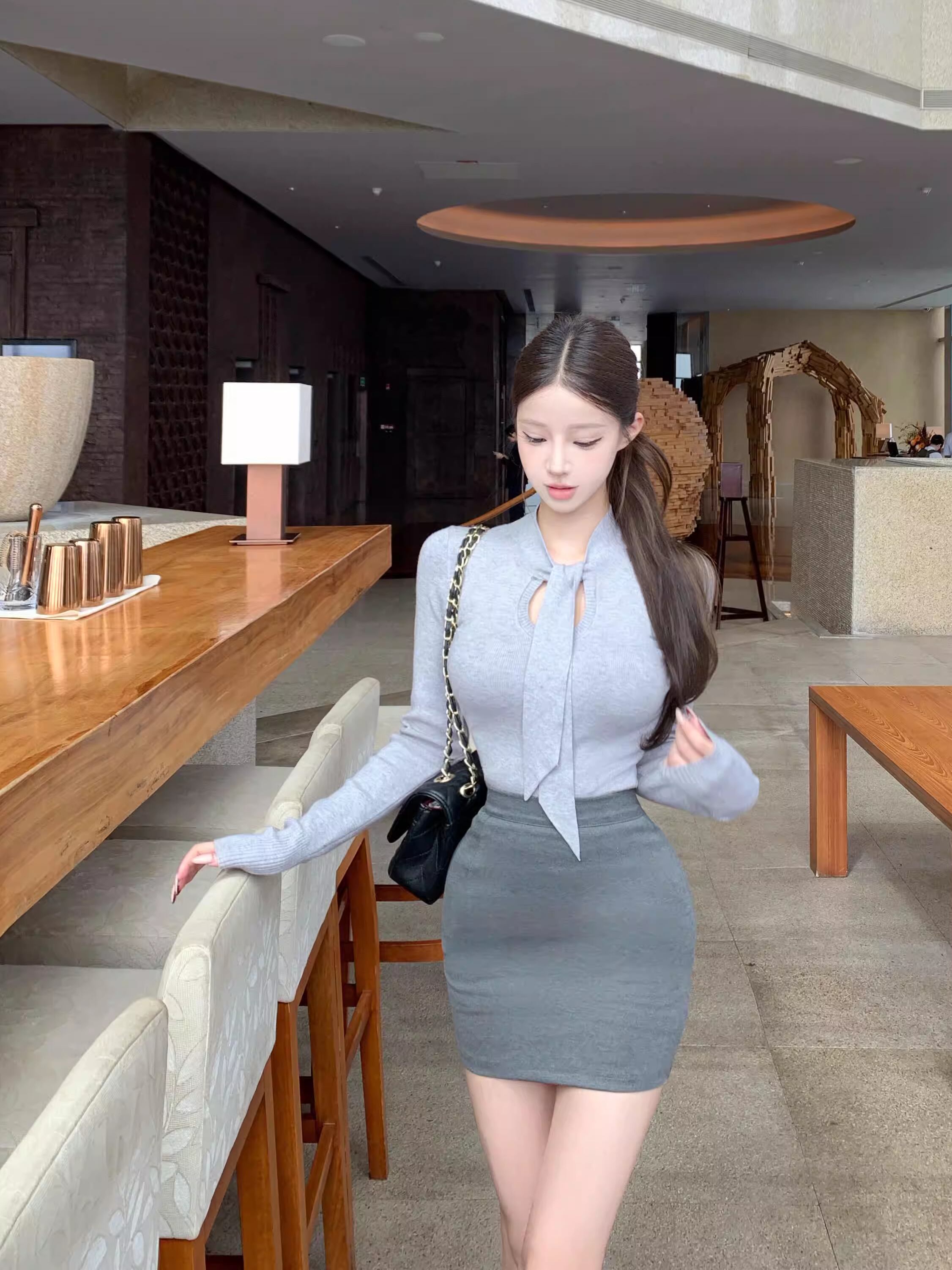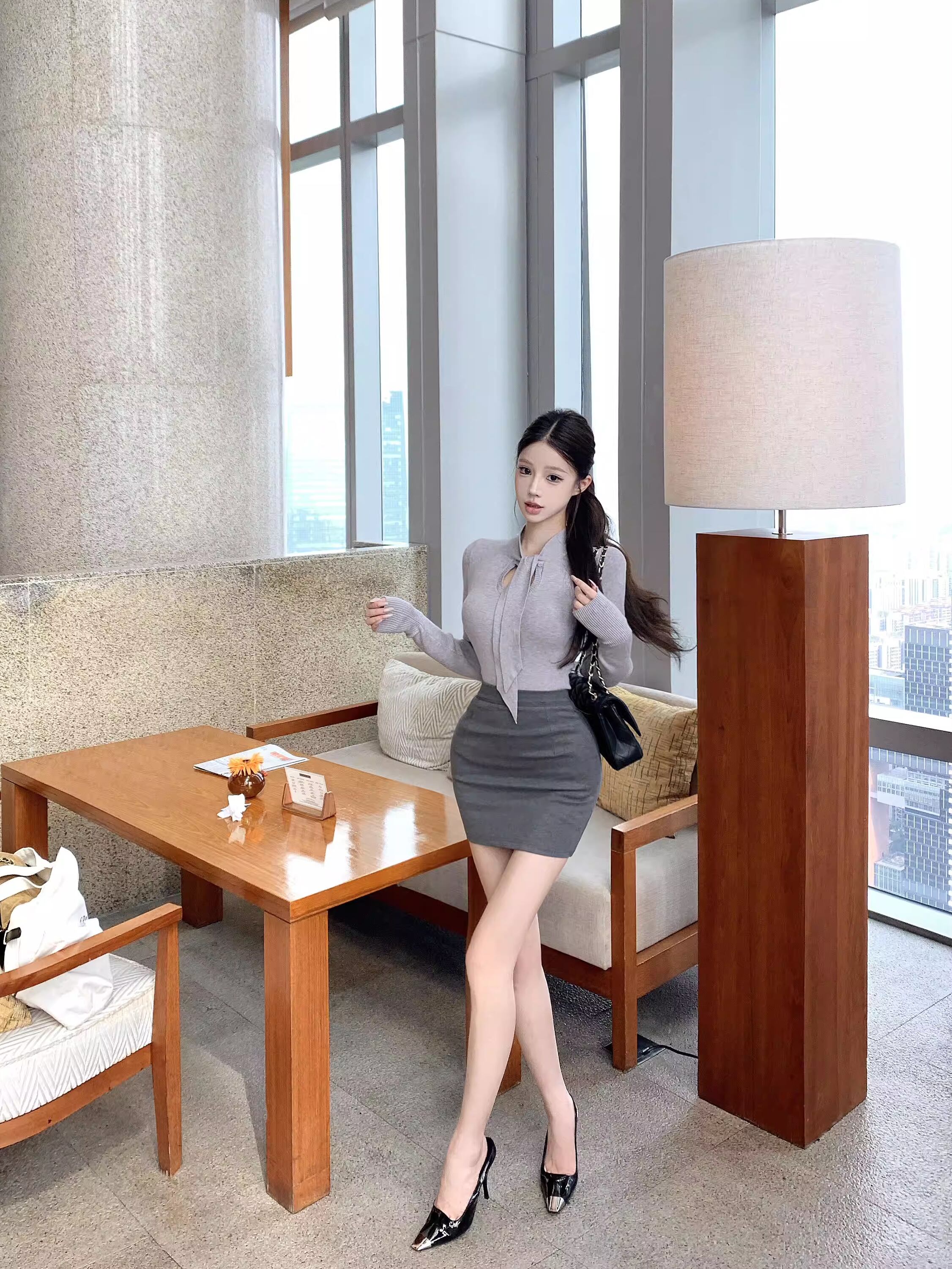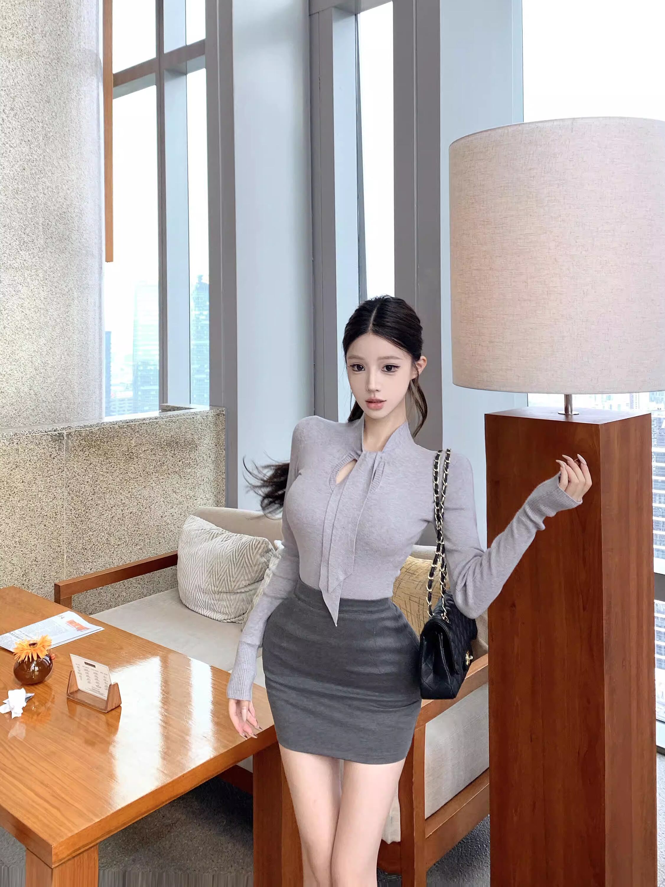 【set】スカーフネックニットトップス×タイトミニスカートセット Q8112