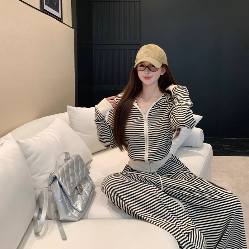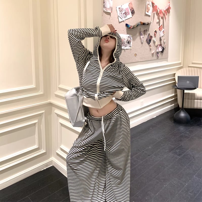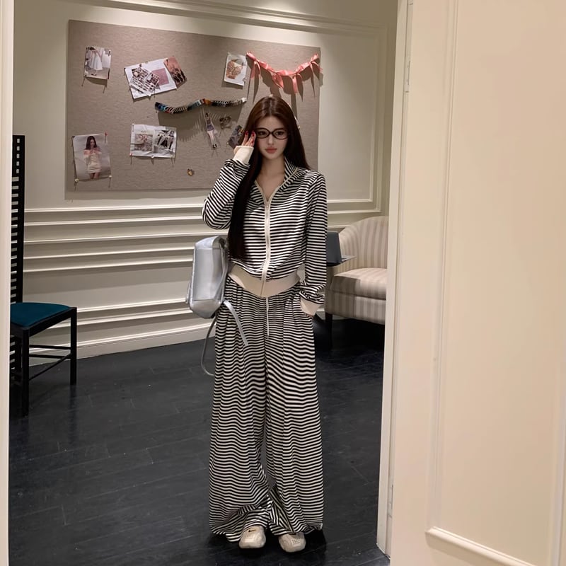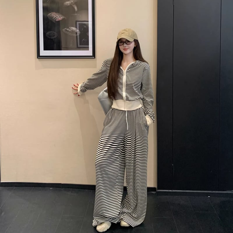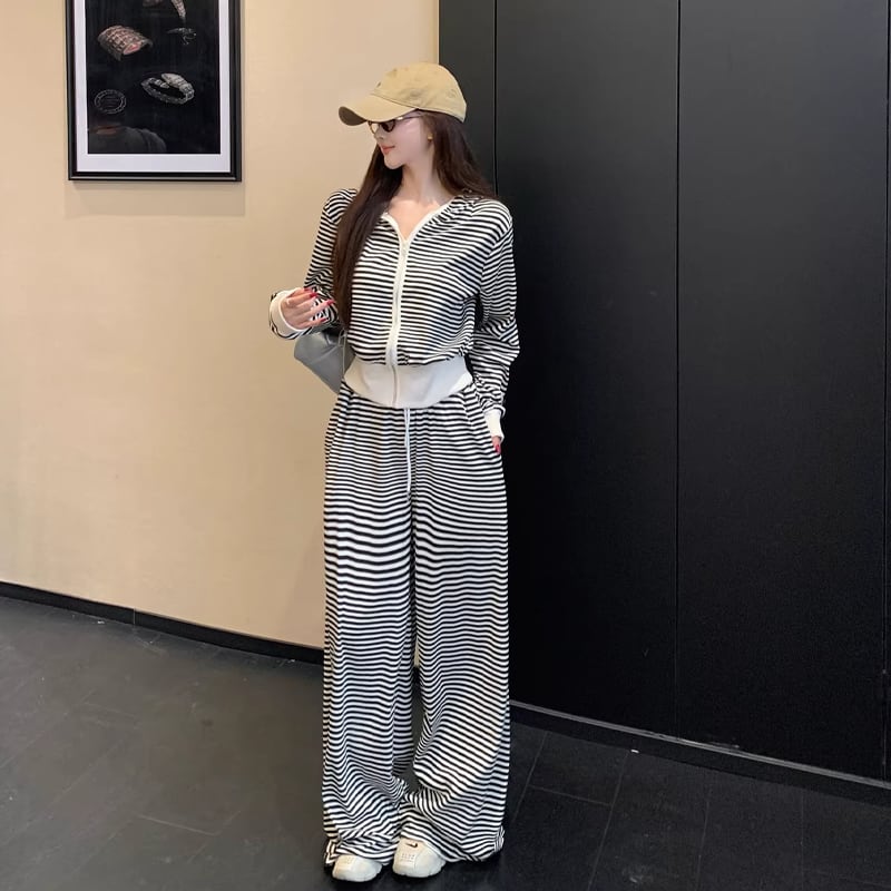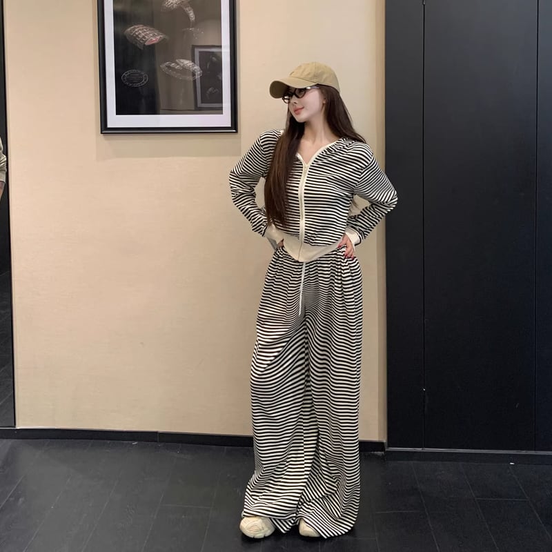 【set】ボーダー柄ジップアップ×ワイドパンツセット Q8144