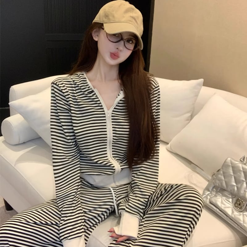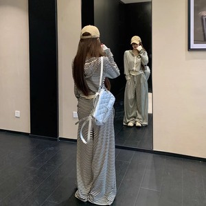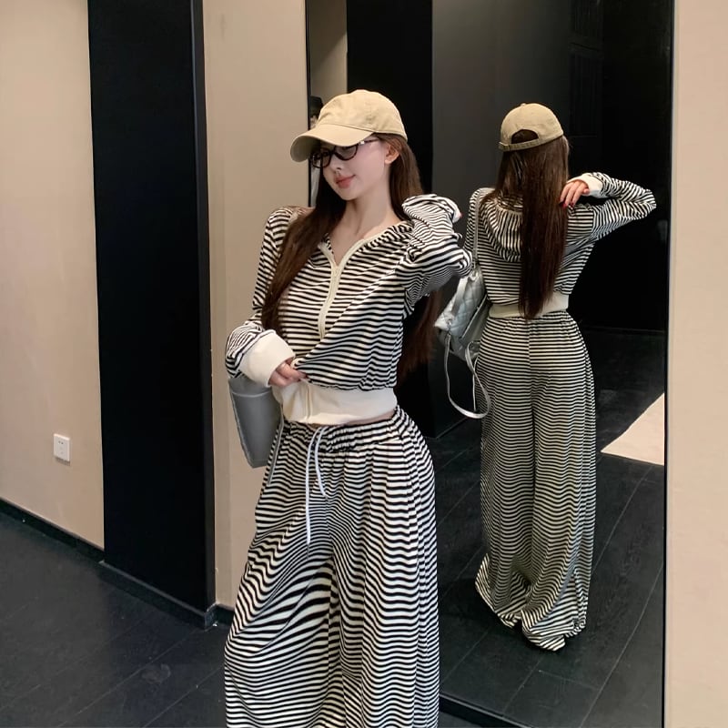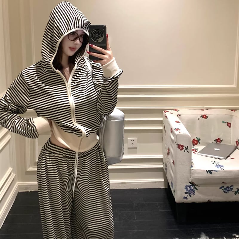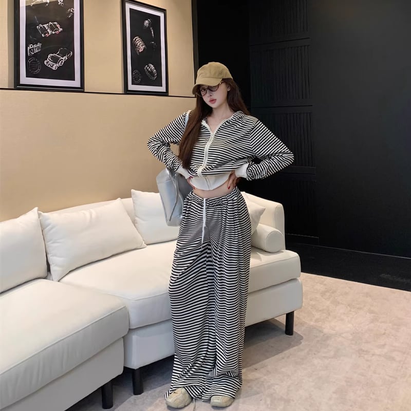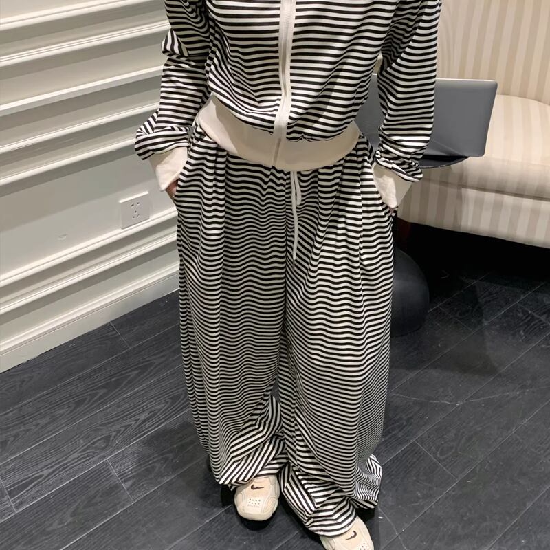 【set】ボーダー柄ジップアップ×ワイドパンツセット Q8144