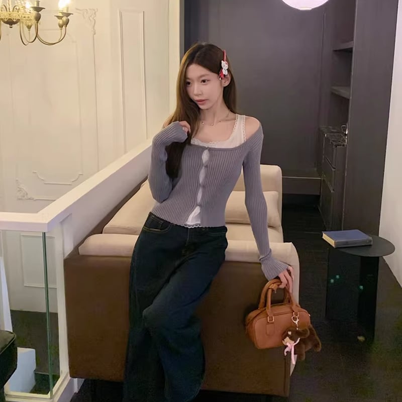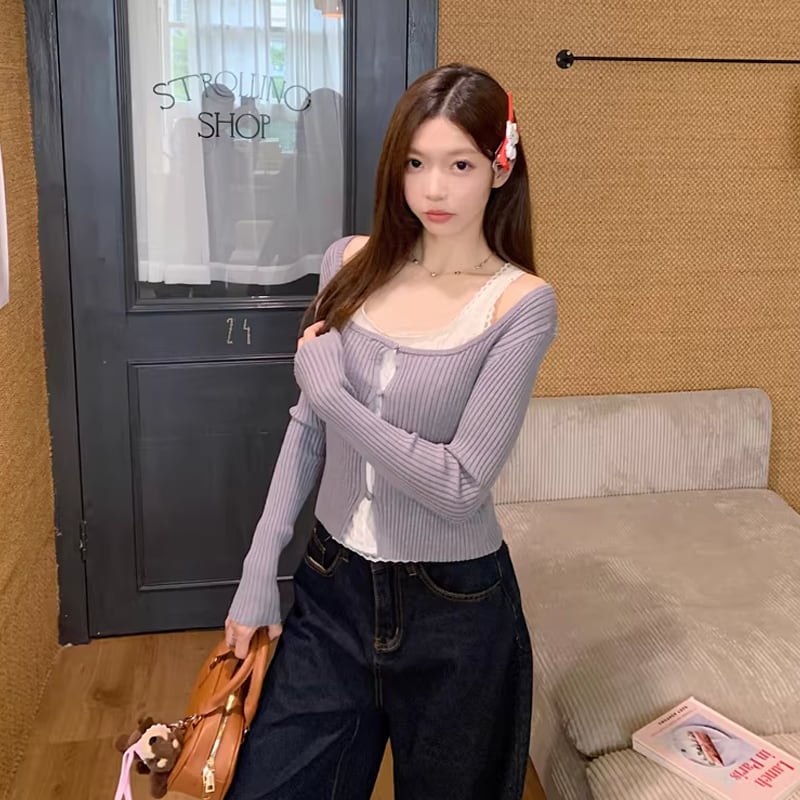 【tops】フェイクレイヤードニットトップス Q8152