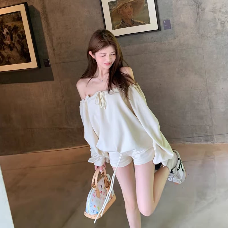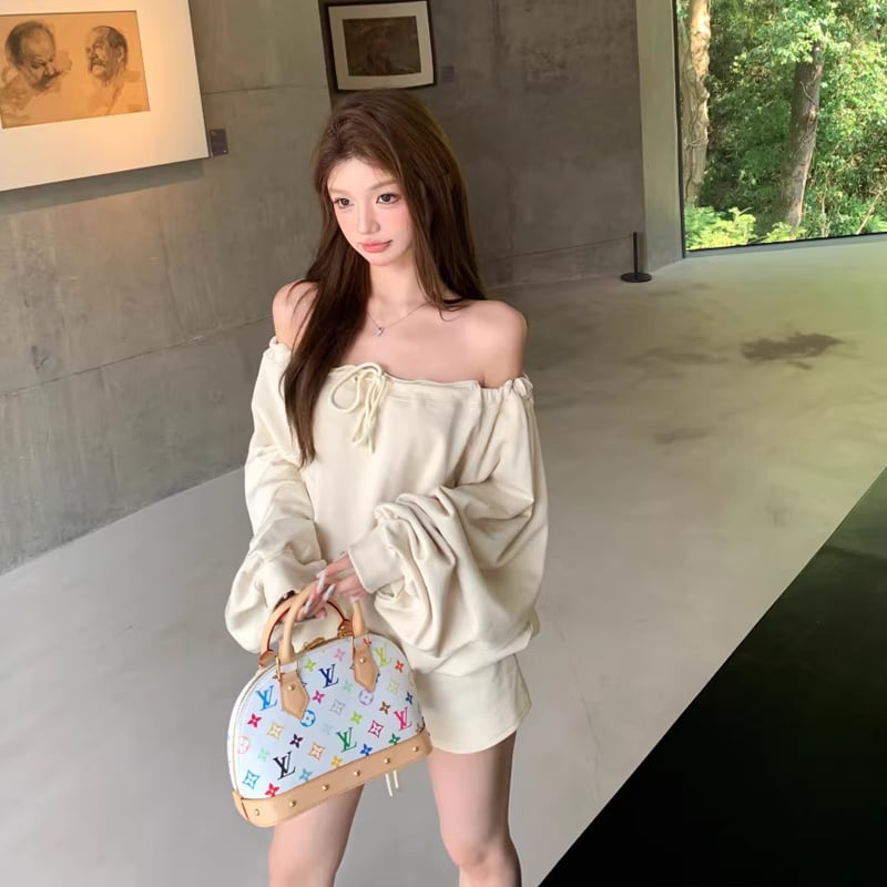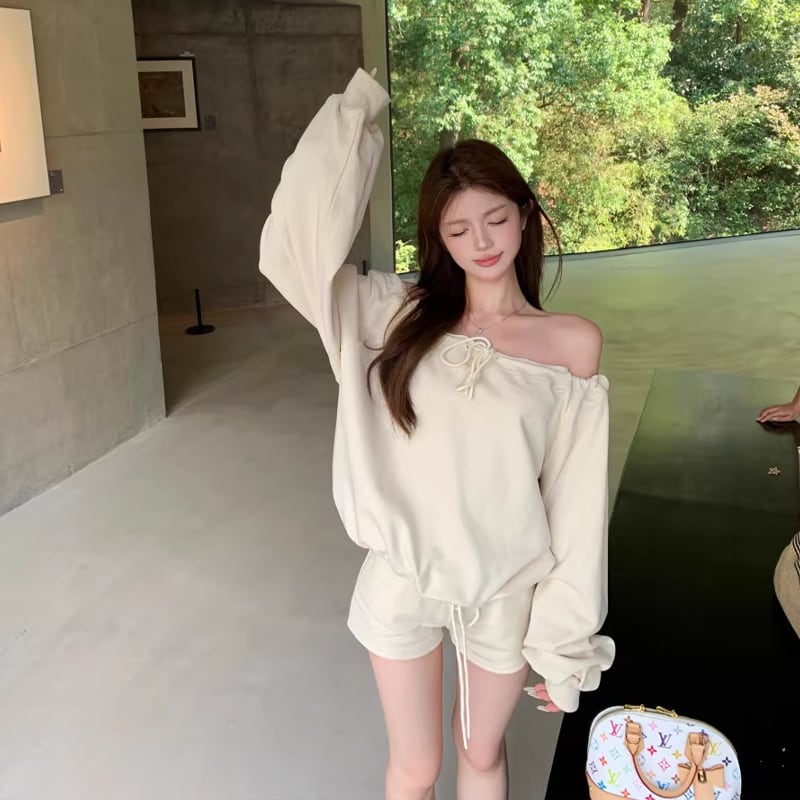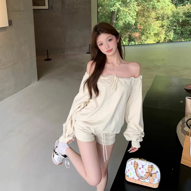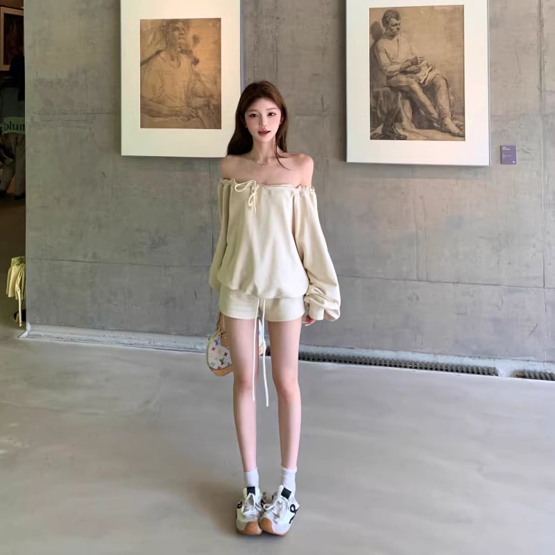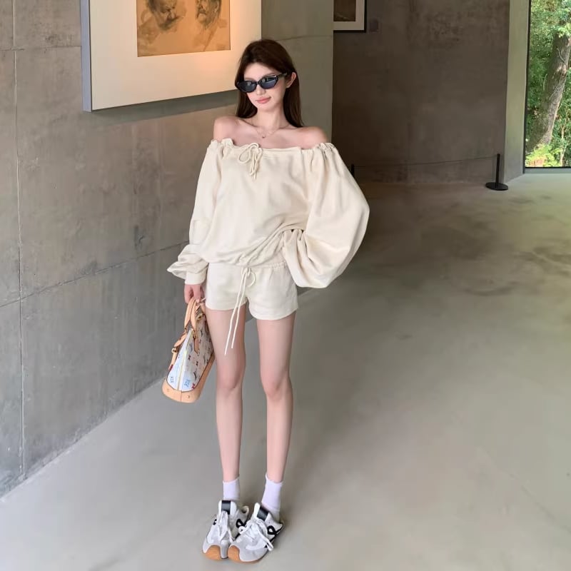 【set】オフショルダートップス×ショートパンツセット Q8201