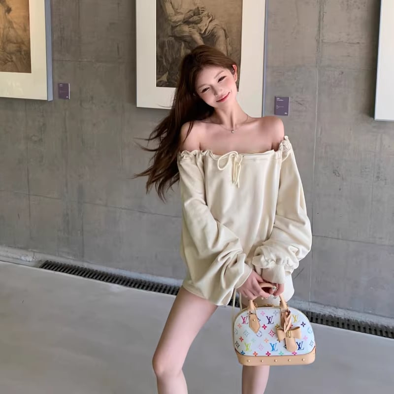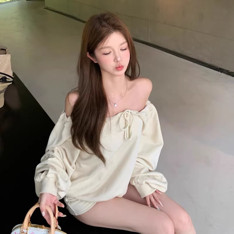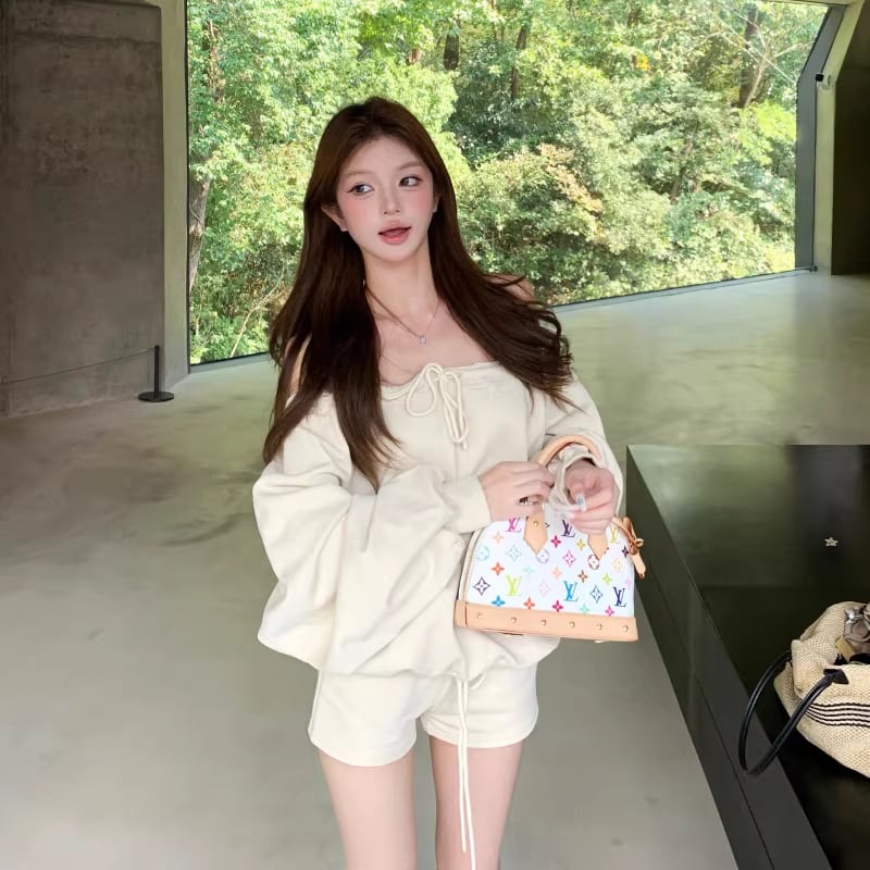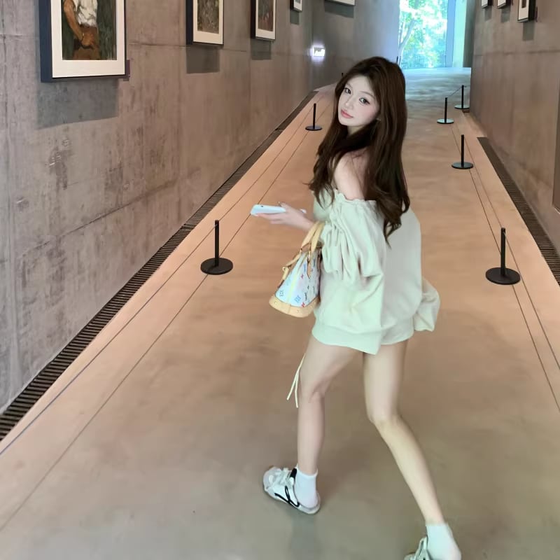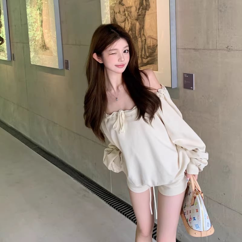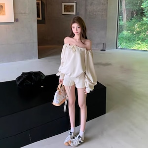 【set】オフショルダートップス×ショートパンツセット Q8201