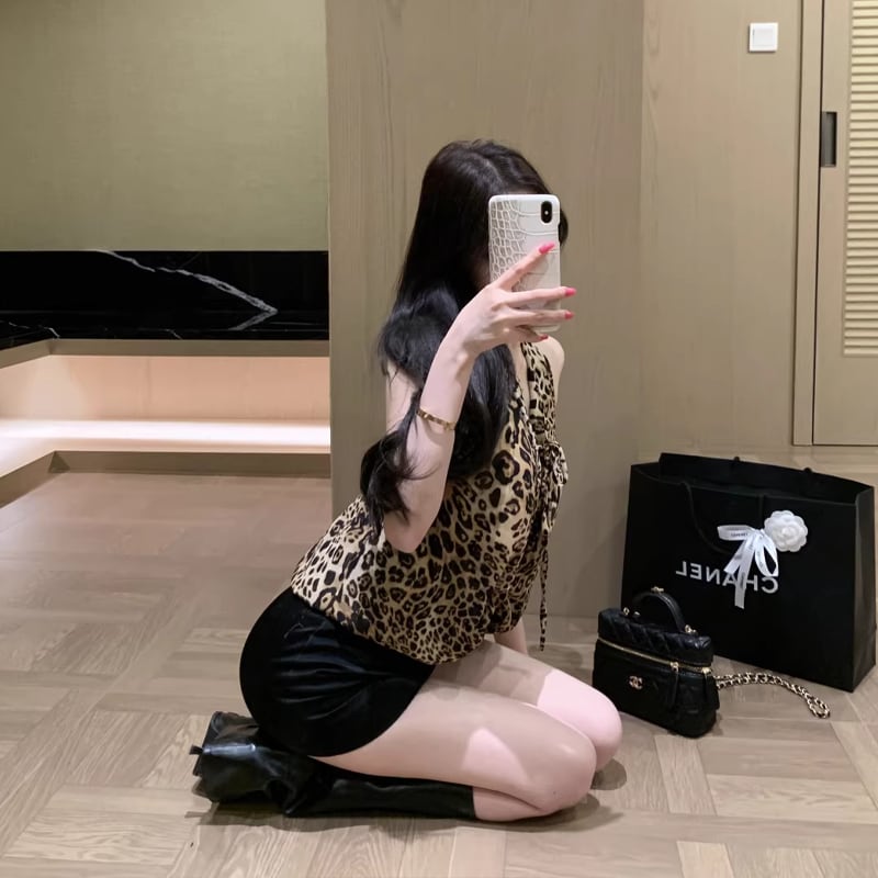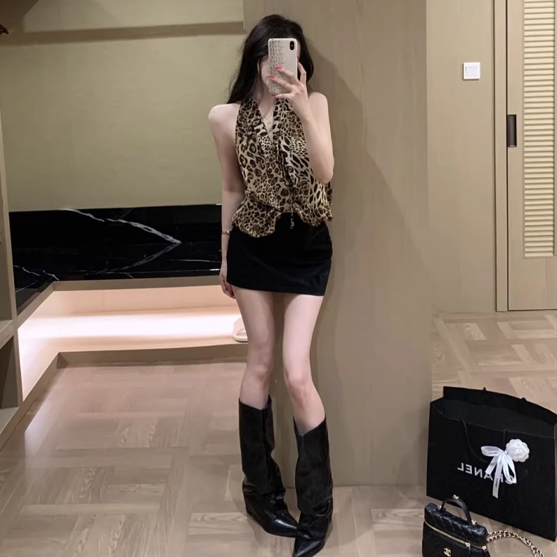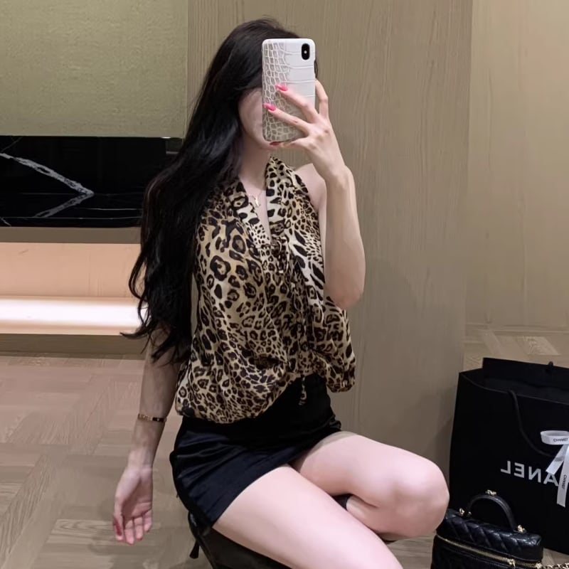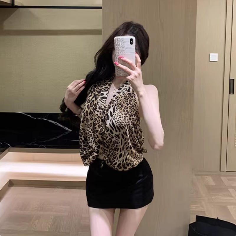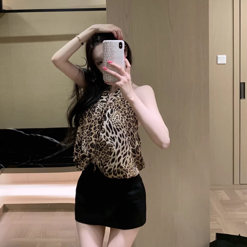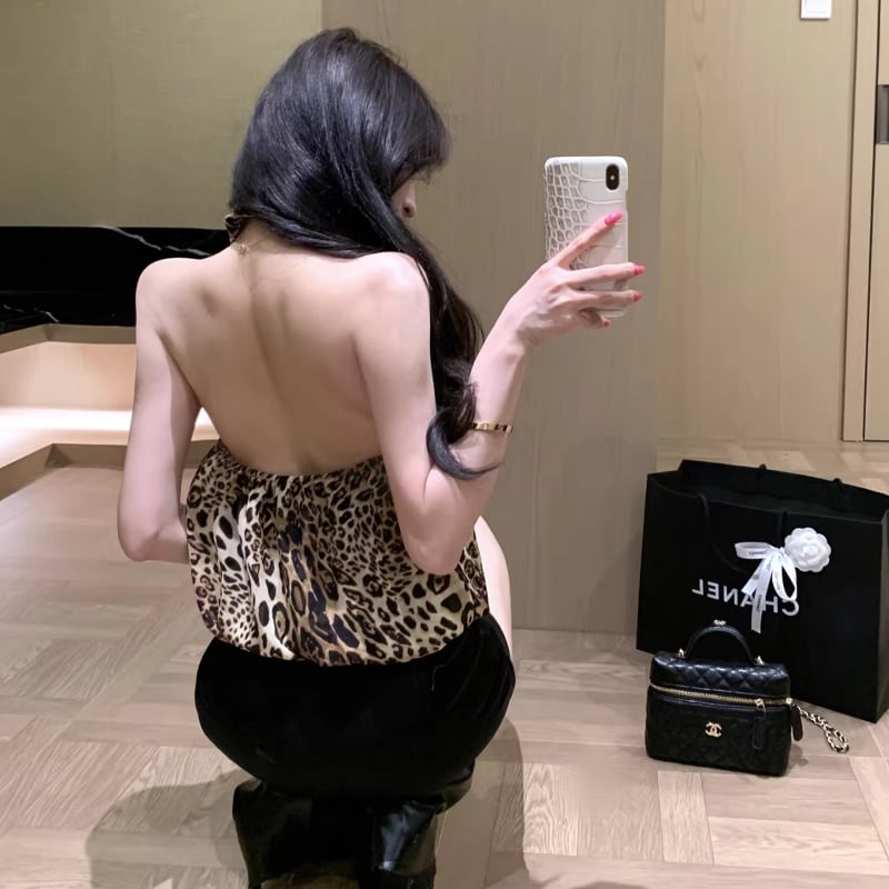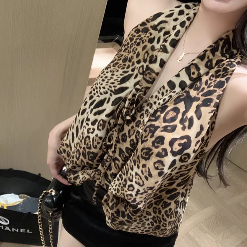 【tops】ヒョウ柄ホルターネックトップス Q8255