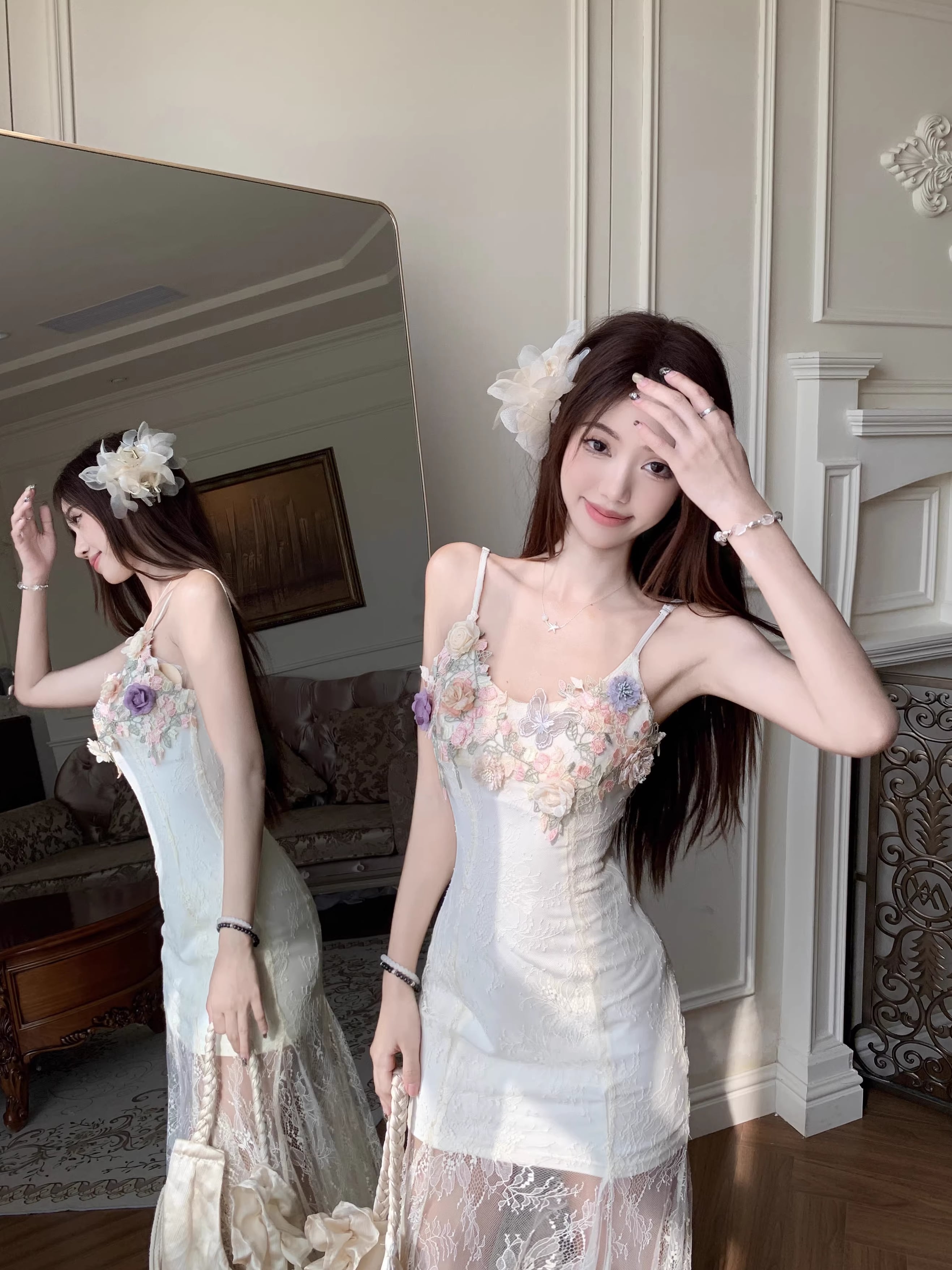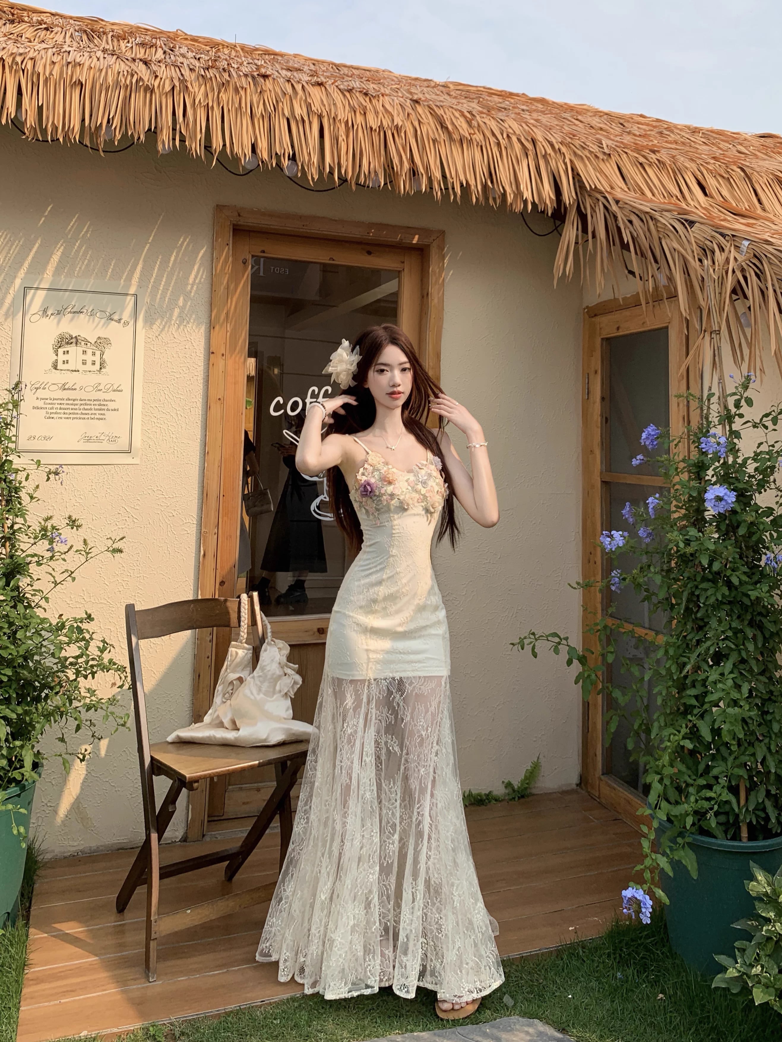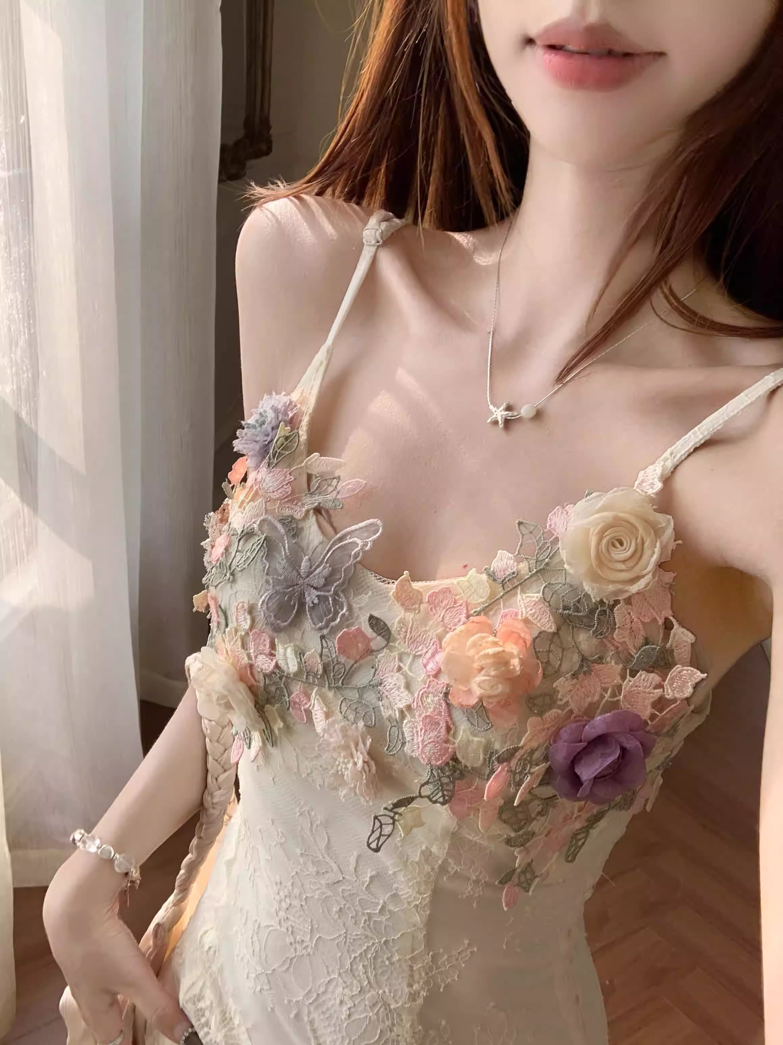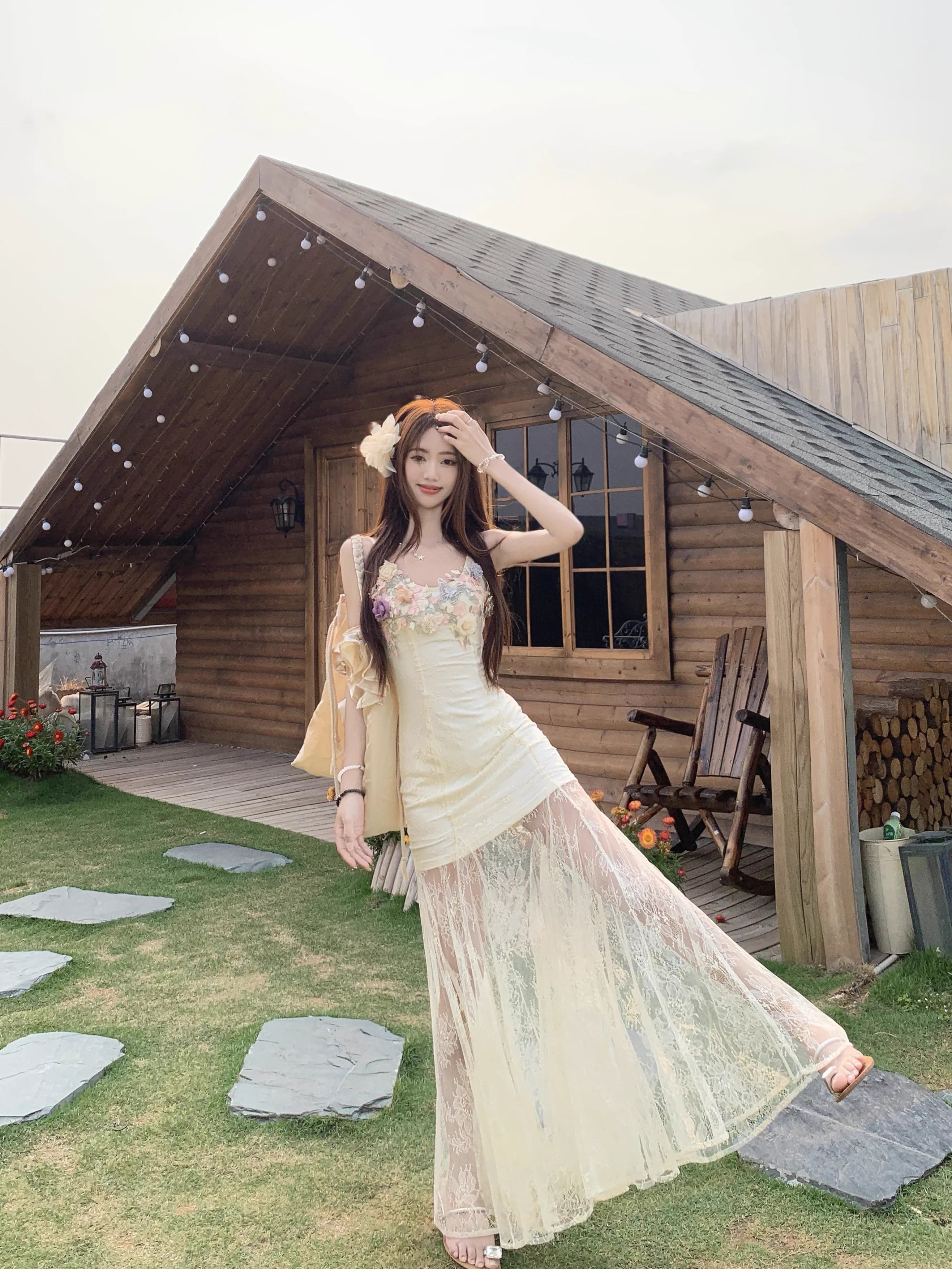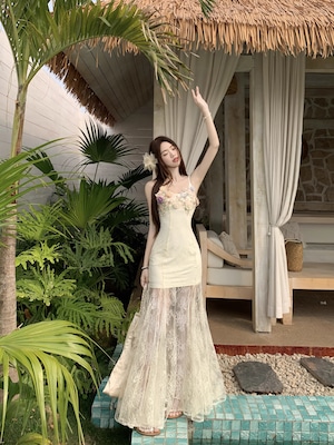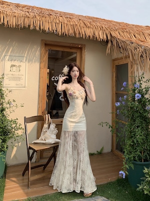 【dress】フラワー付きチュールドッキングロングキャミワンピース Q8259