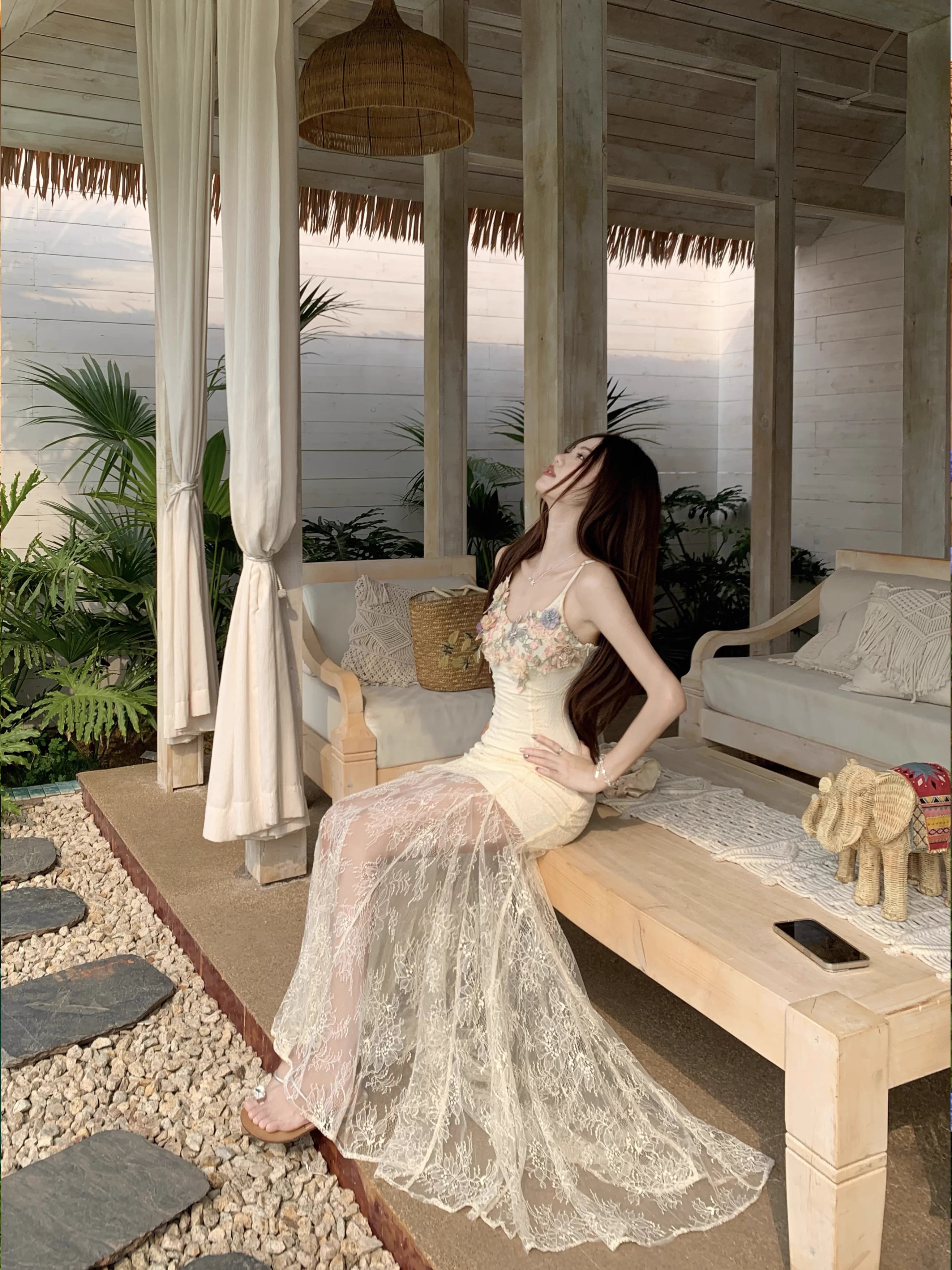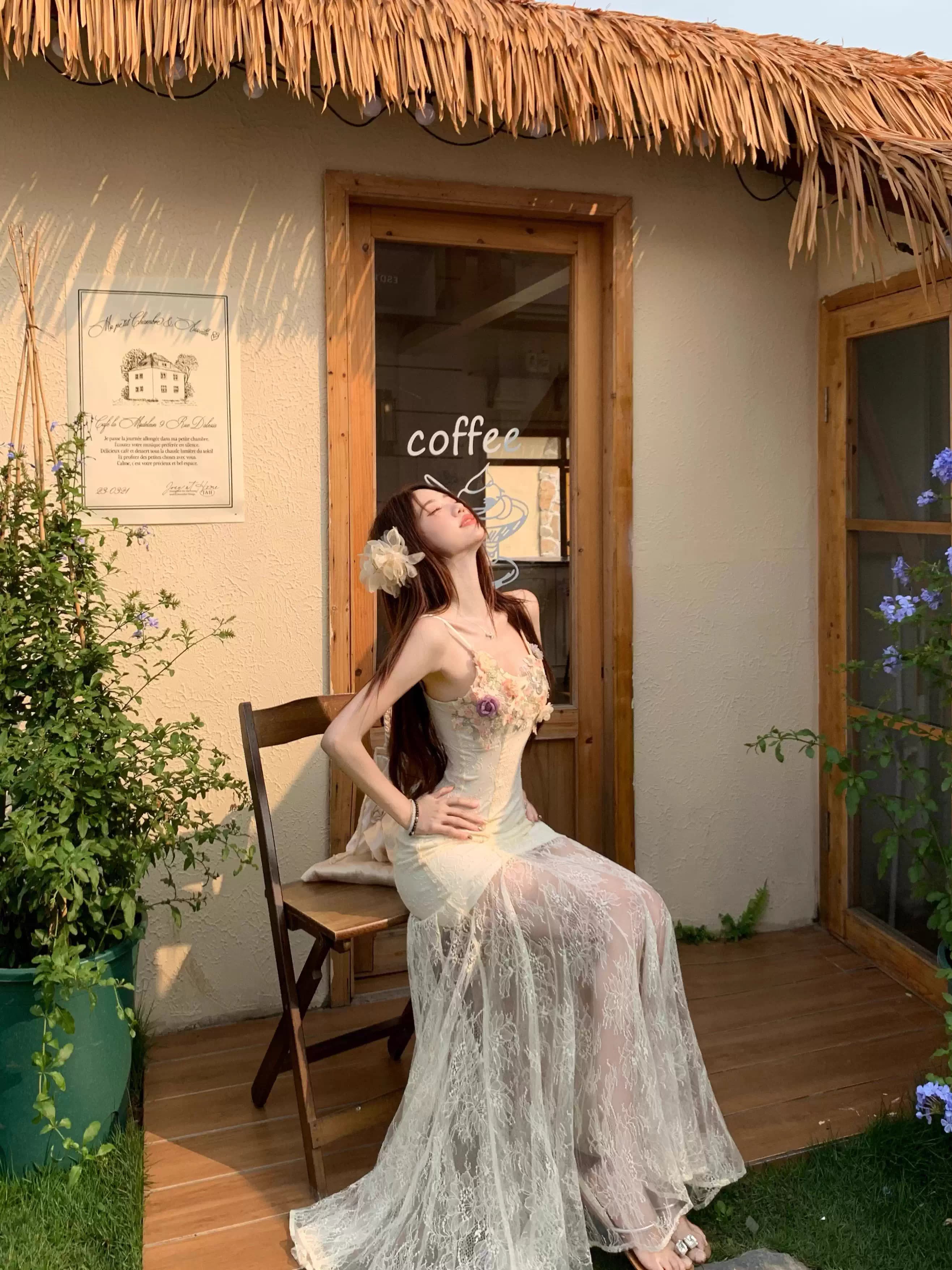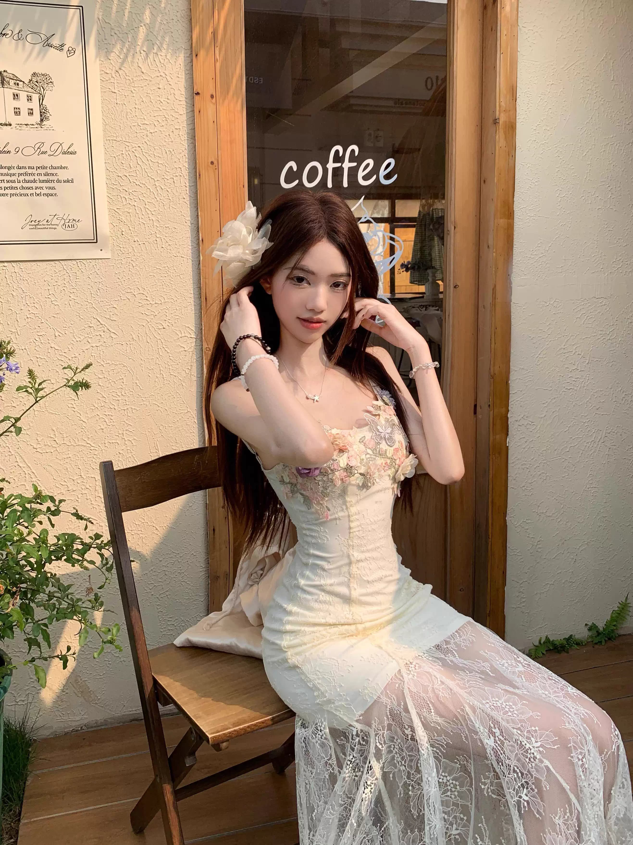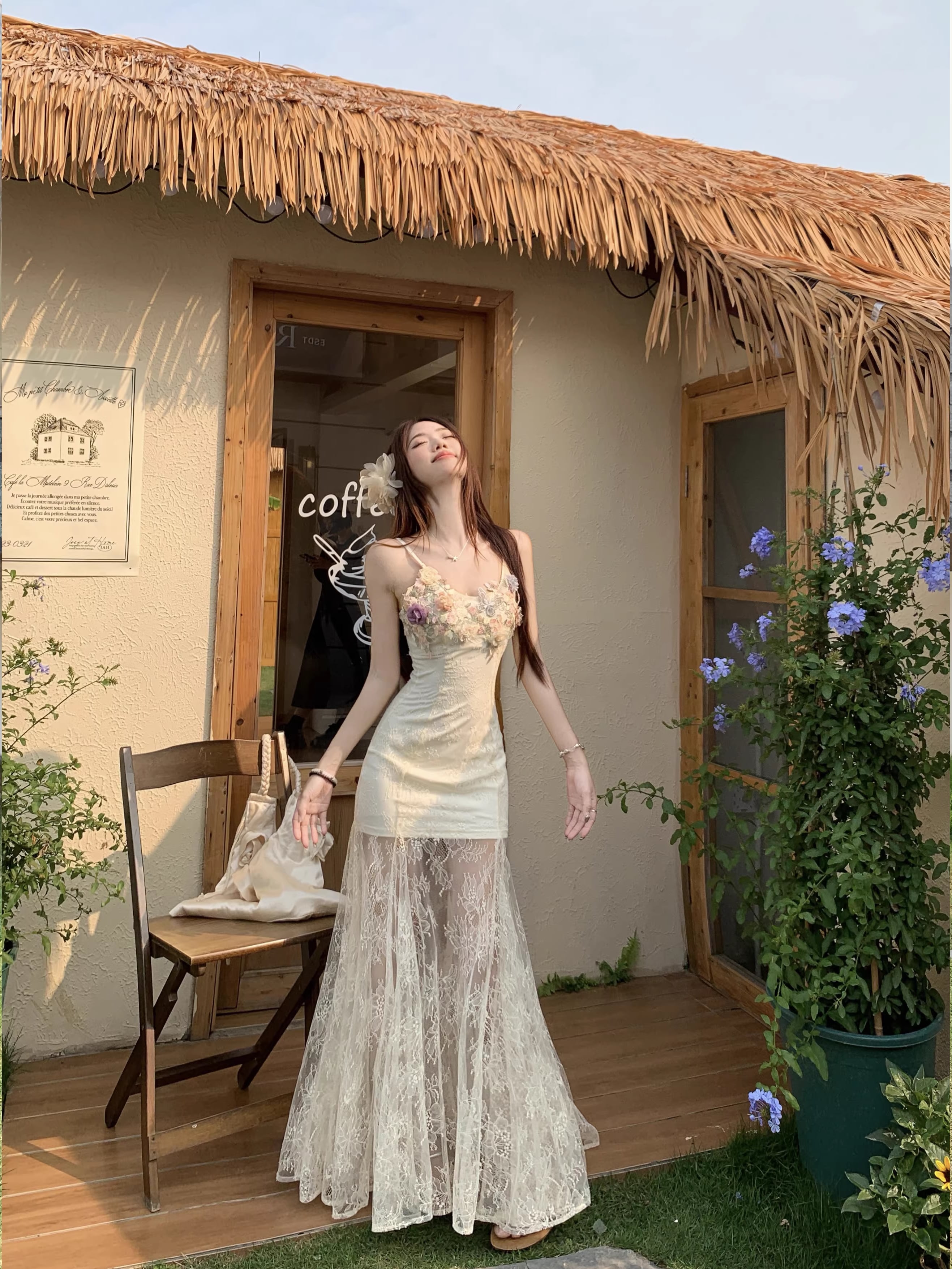 【dress】フラワー付きチュールドッキングロングキャミワンピース Q8259