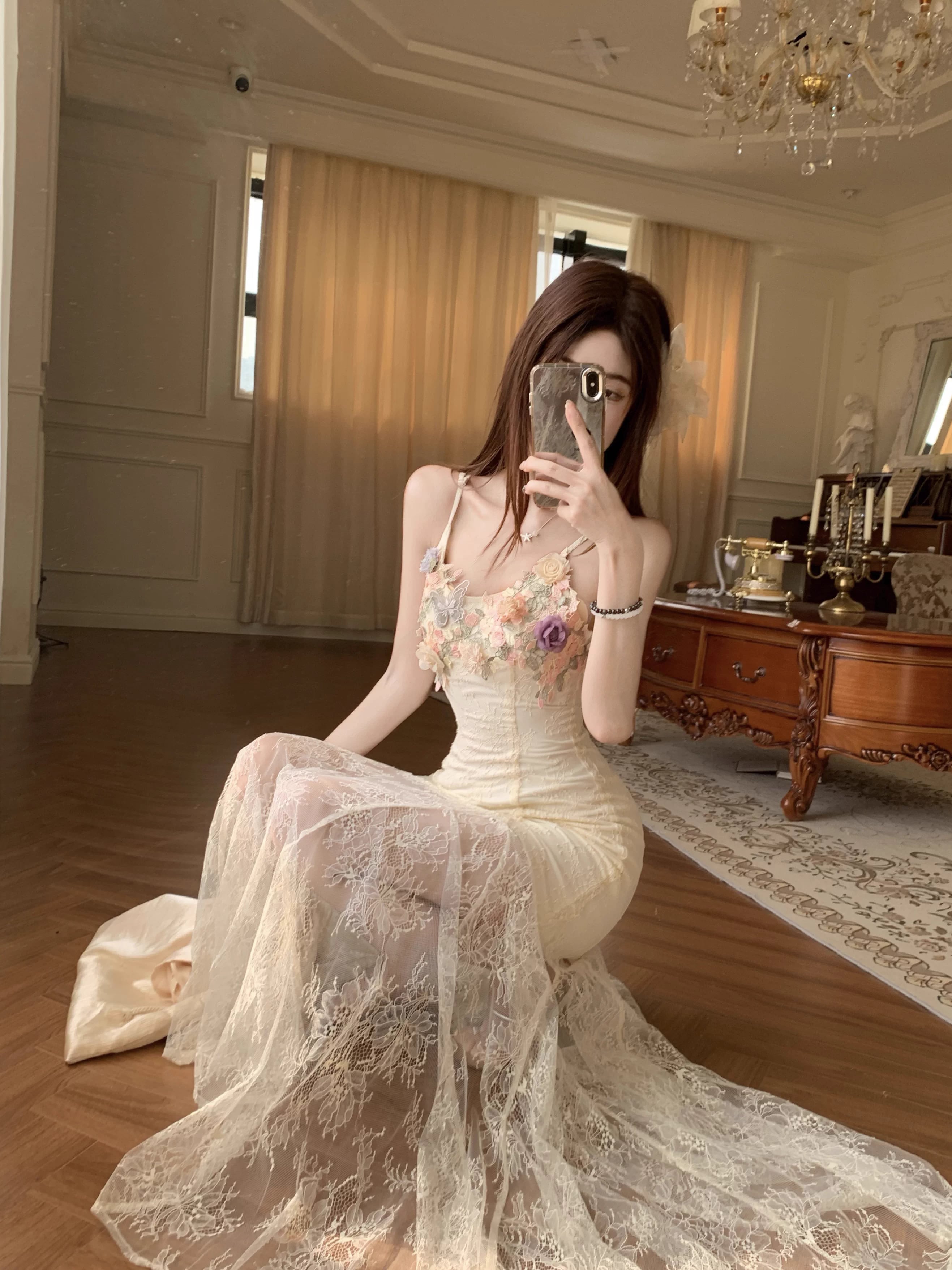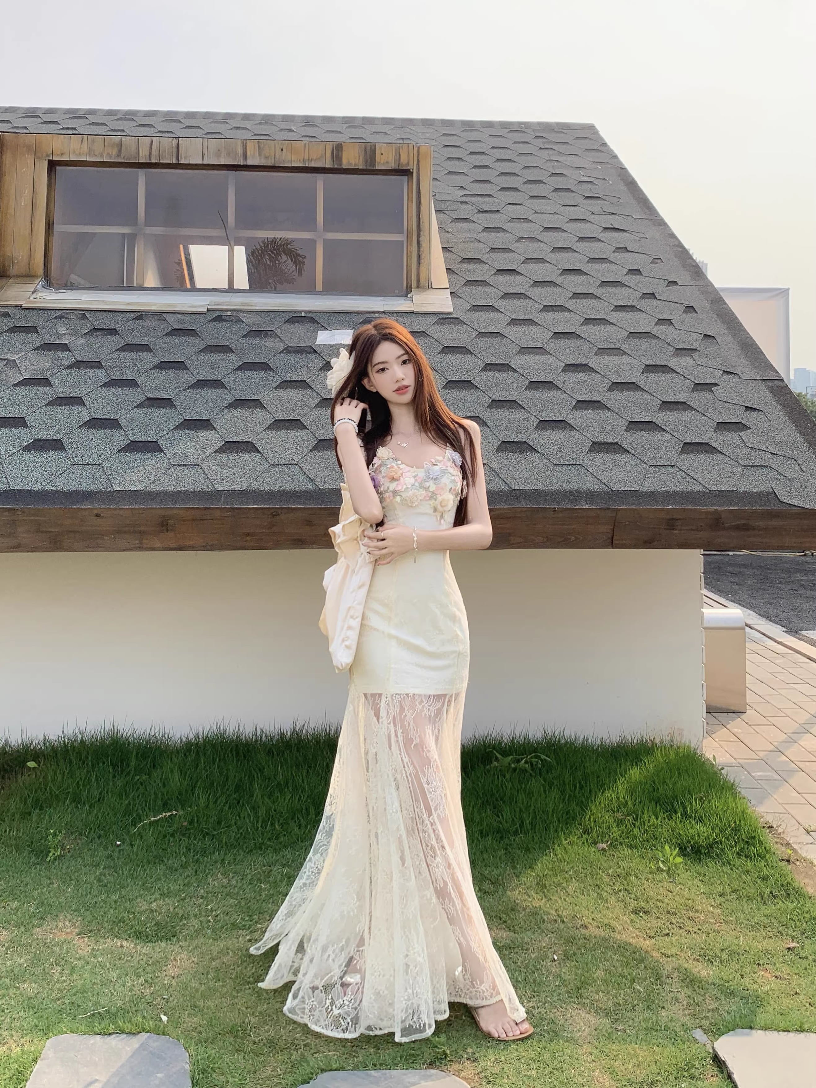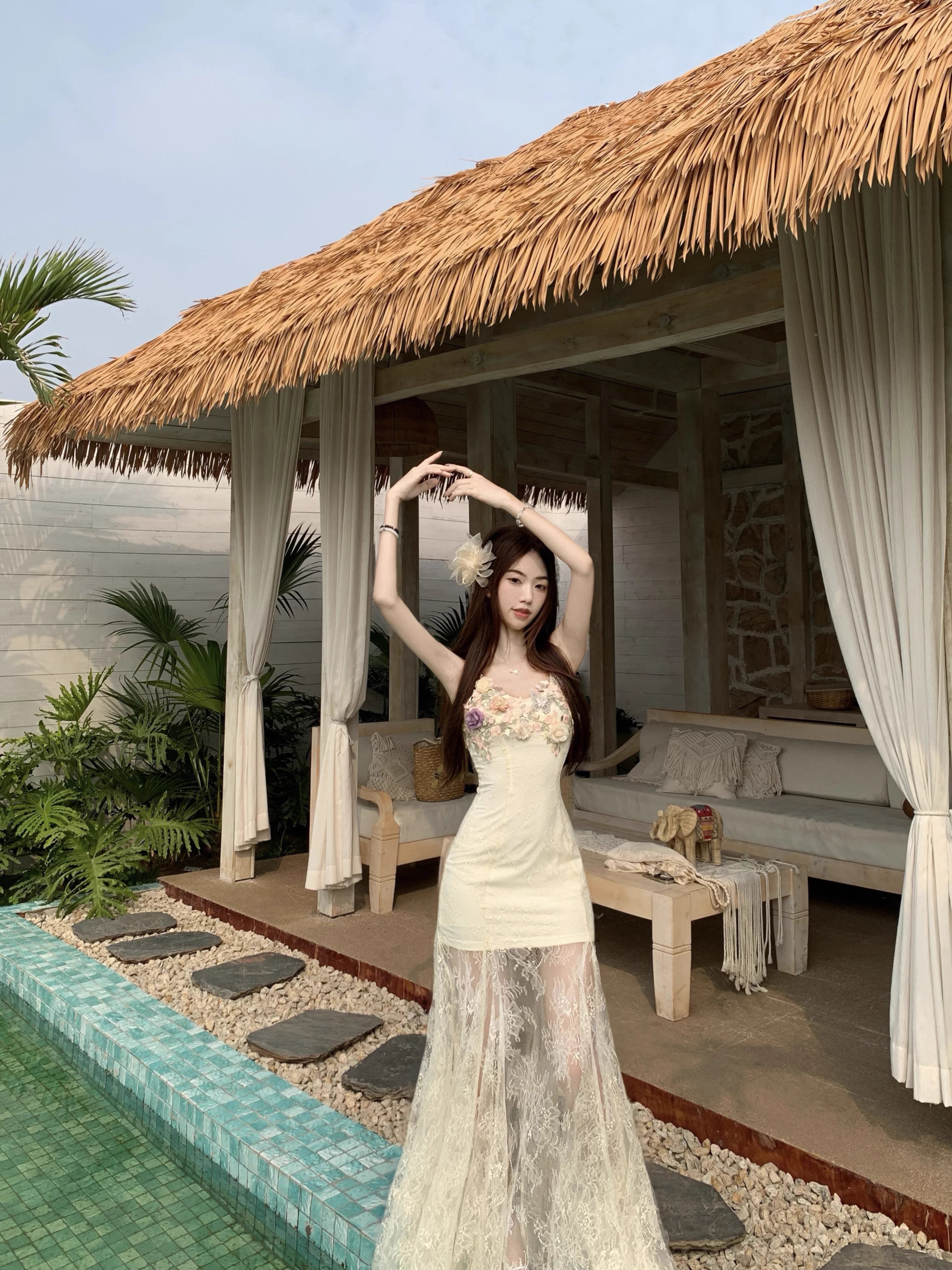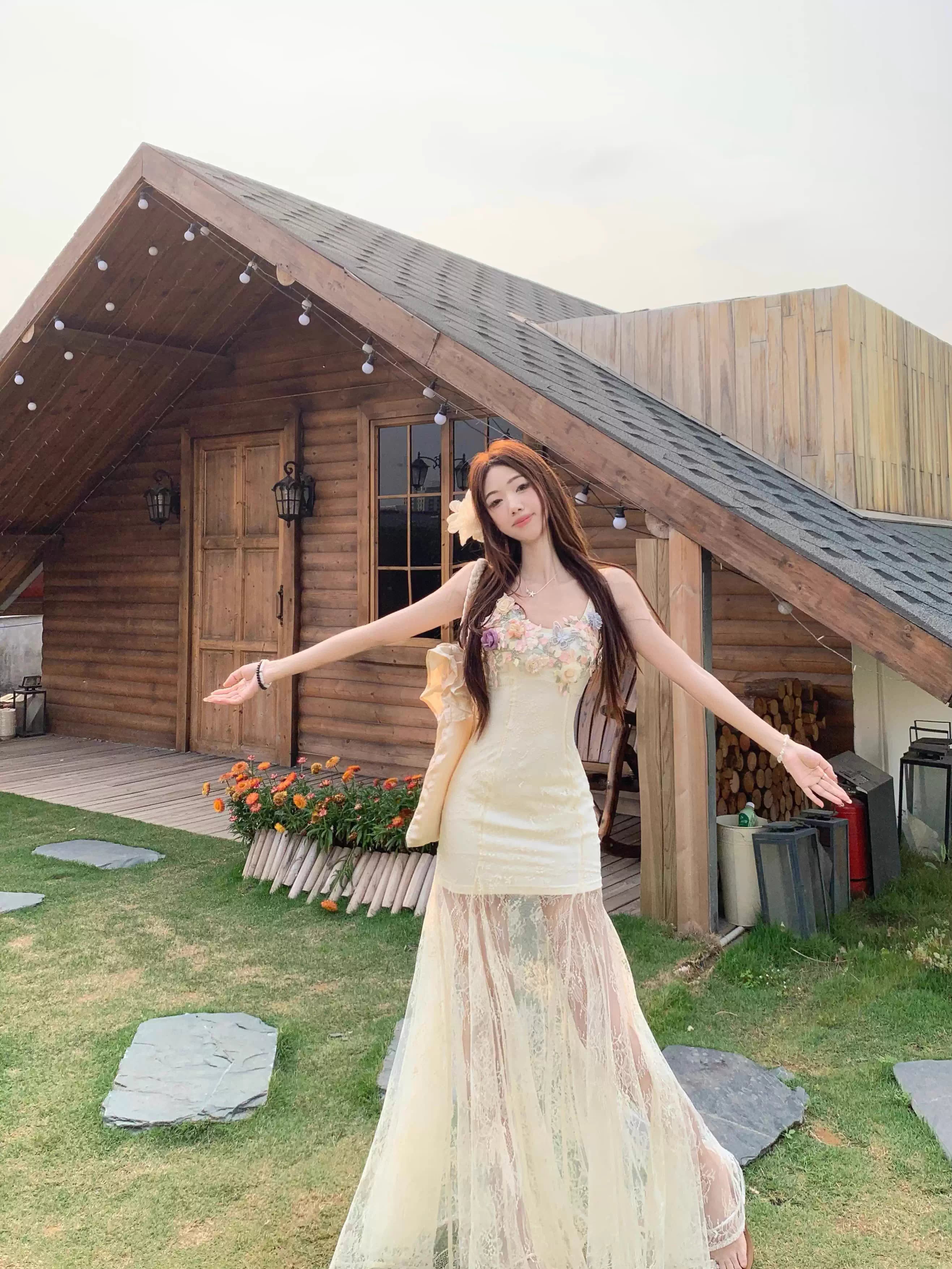 【dress】フラワー付きチュールドッキングロングキャミワンピース Q8259
